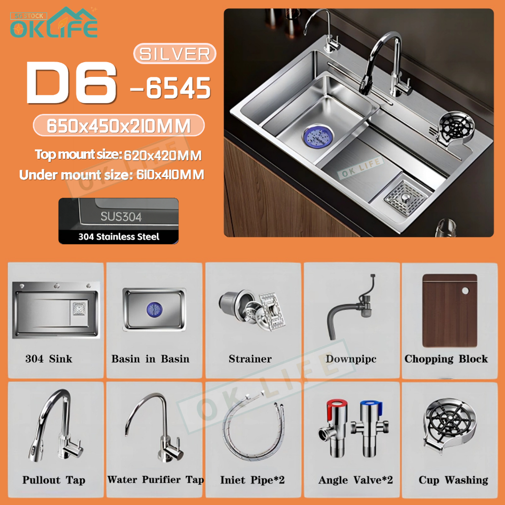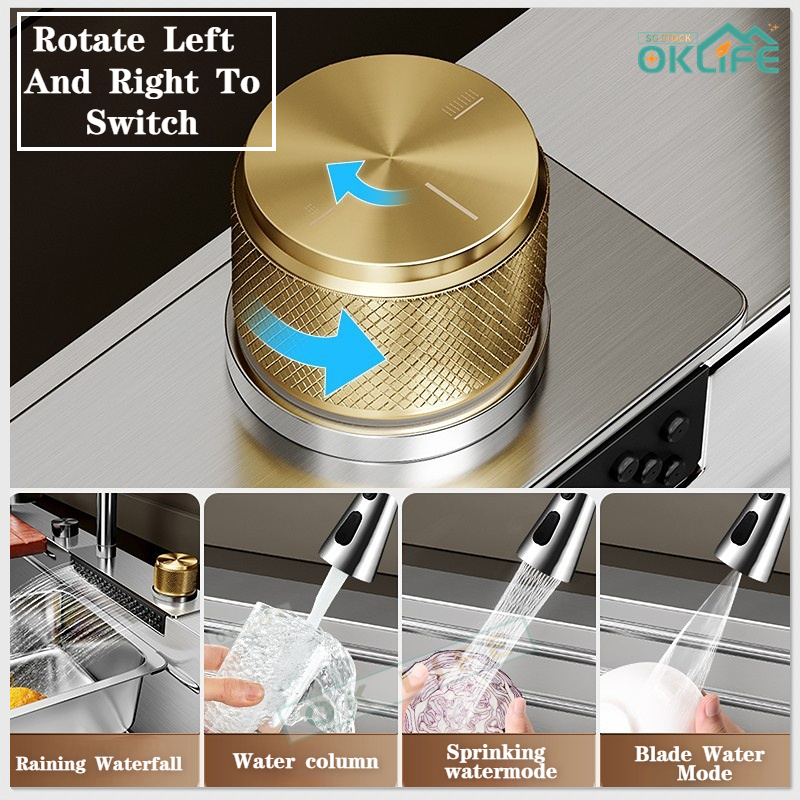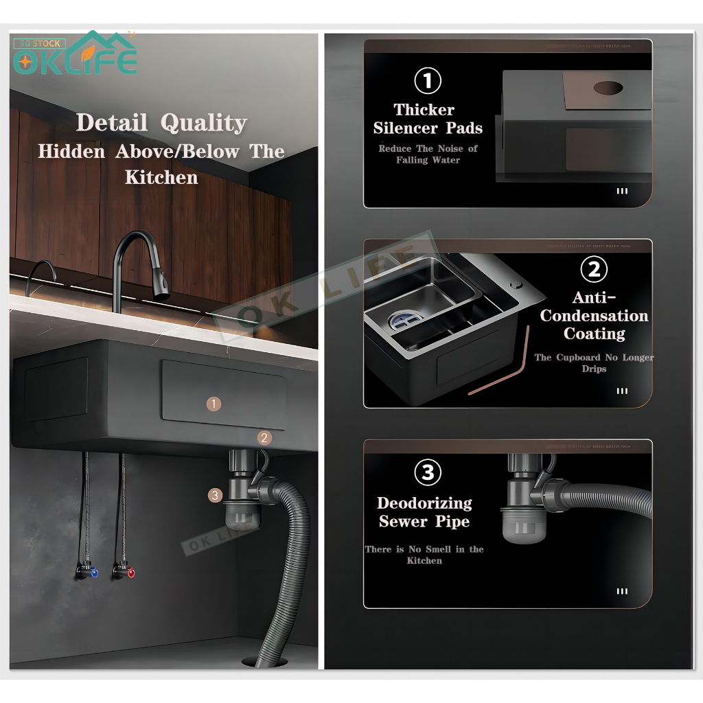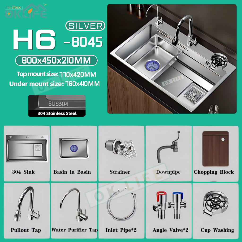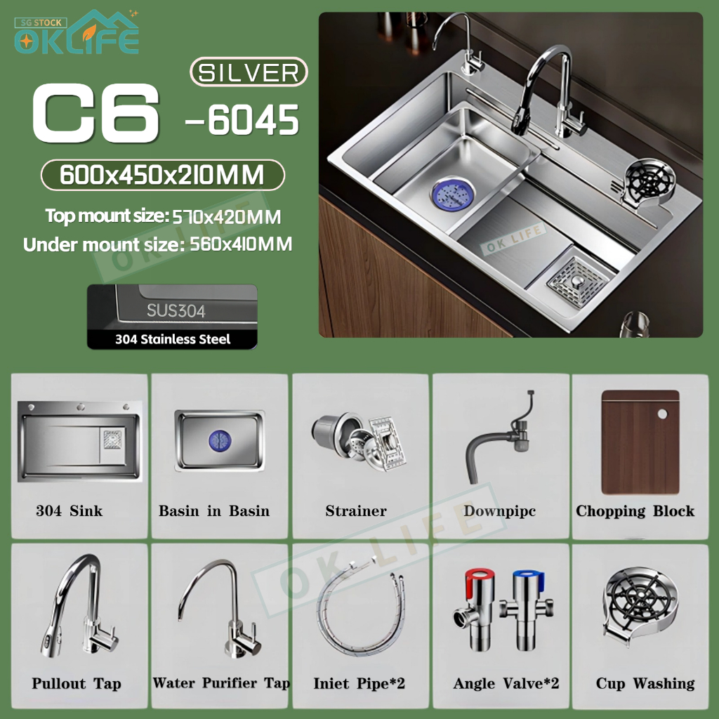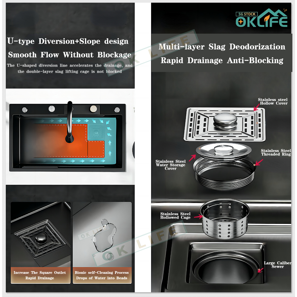 [SG STOCK 48H DELIVERY] Nano Kitchen Sink SUS304 Stainless Steel Waterfall Basin Single Bowl Pullout Faucet Large Sink
