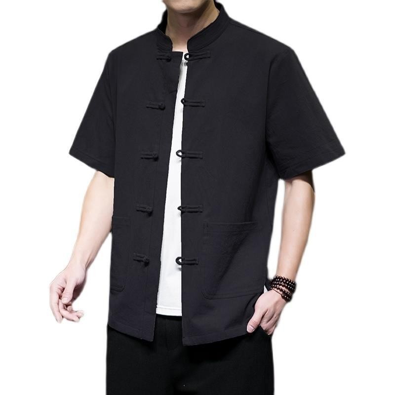 Asian short-sleeved shirt men's Chinese style cott 亚短袖衬衫男中国风棉半袖衬衣复古盘扣唐装宽松大码上衣 MM10