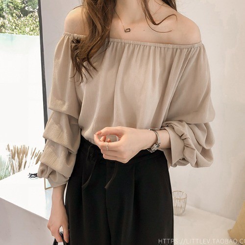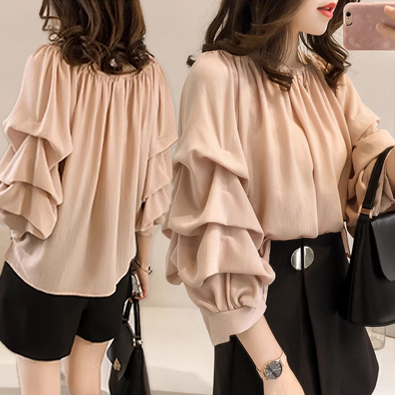 Plus Size M-4XL Chiffon Puff Long Sleeve Blouse Women Ruffle Korean Style Plain Casual Loose Round Neck Fashion Formal Office Woman Ladies Elegant Shirt Top Pink Blue Apricot
