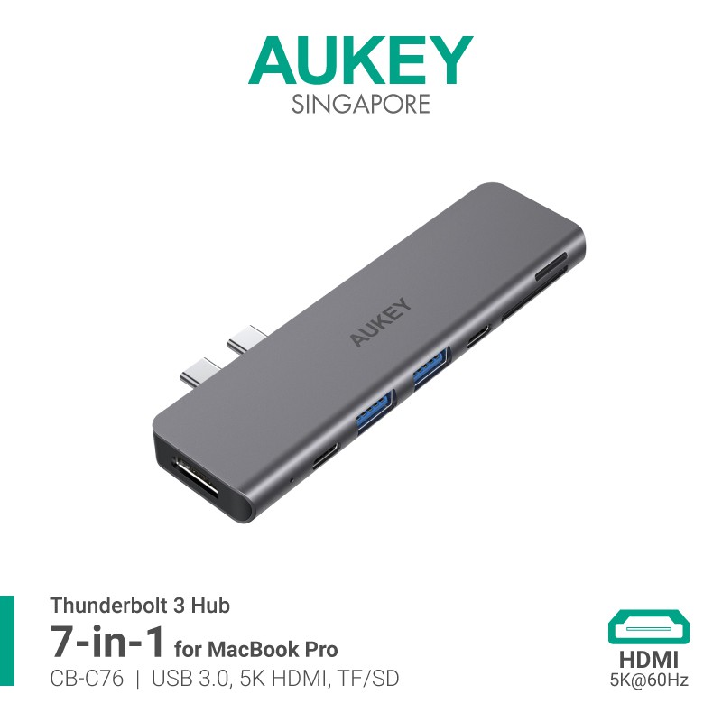 Aukey CB-C76 7-Port 100W Hub w Thunderbolt 3, USB C, USB 3 Data Port, HDMI Port, SD & micro SD slot (24 Months Warranty)
