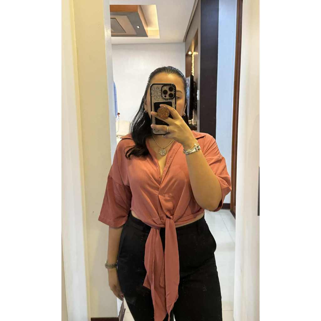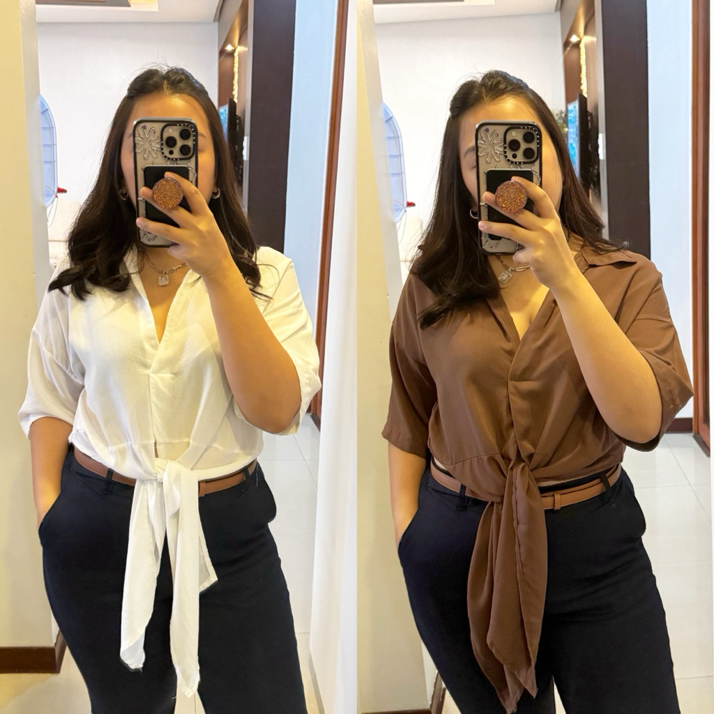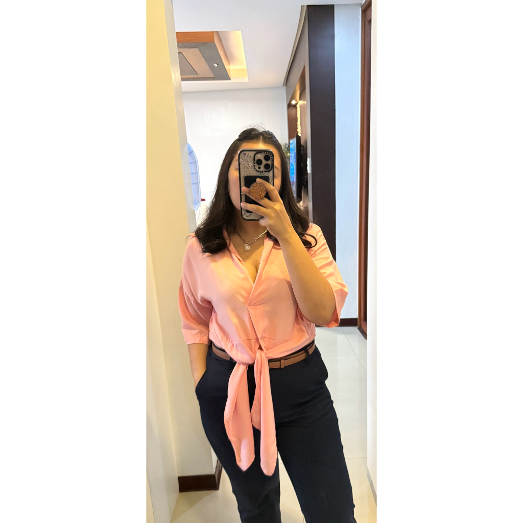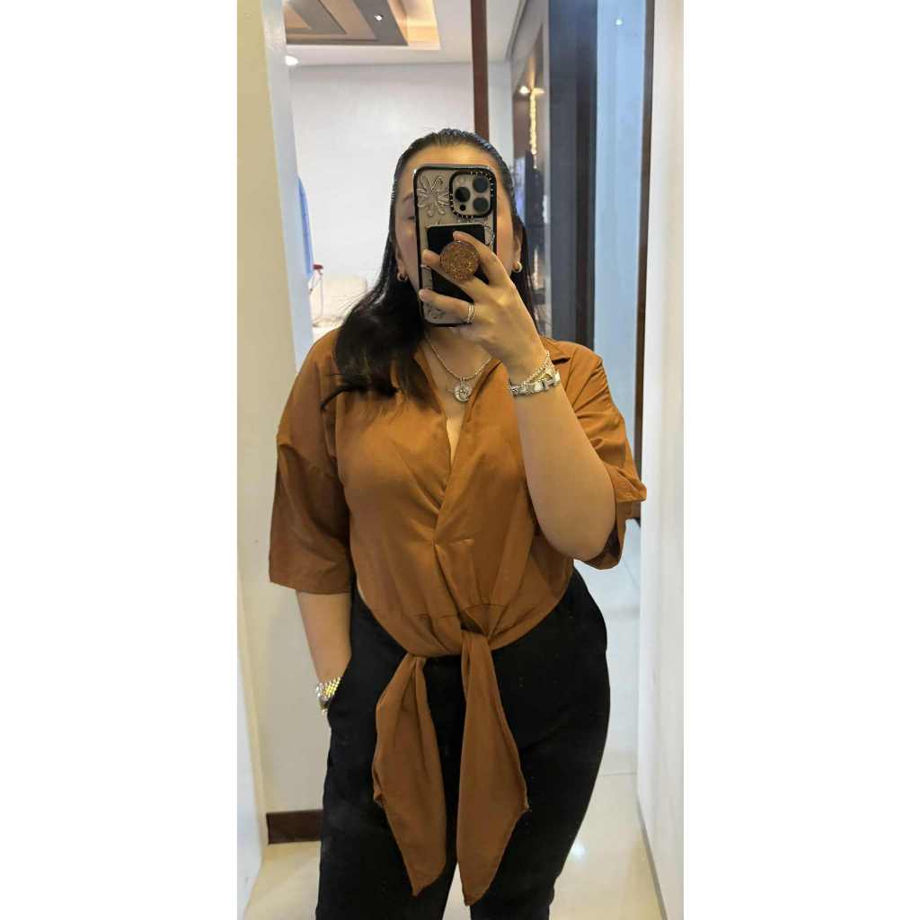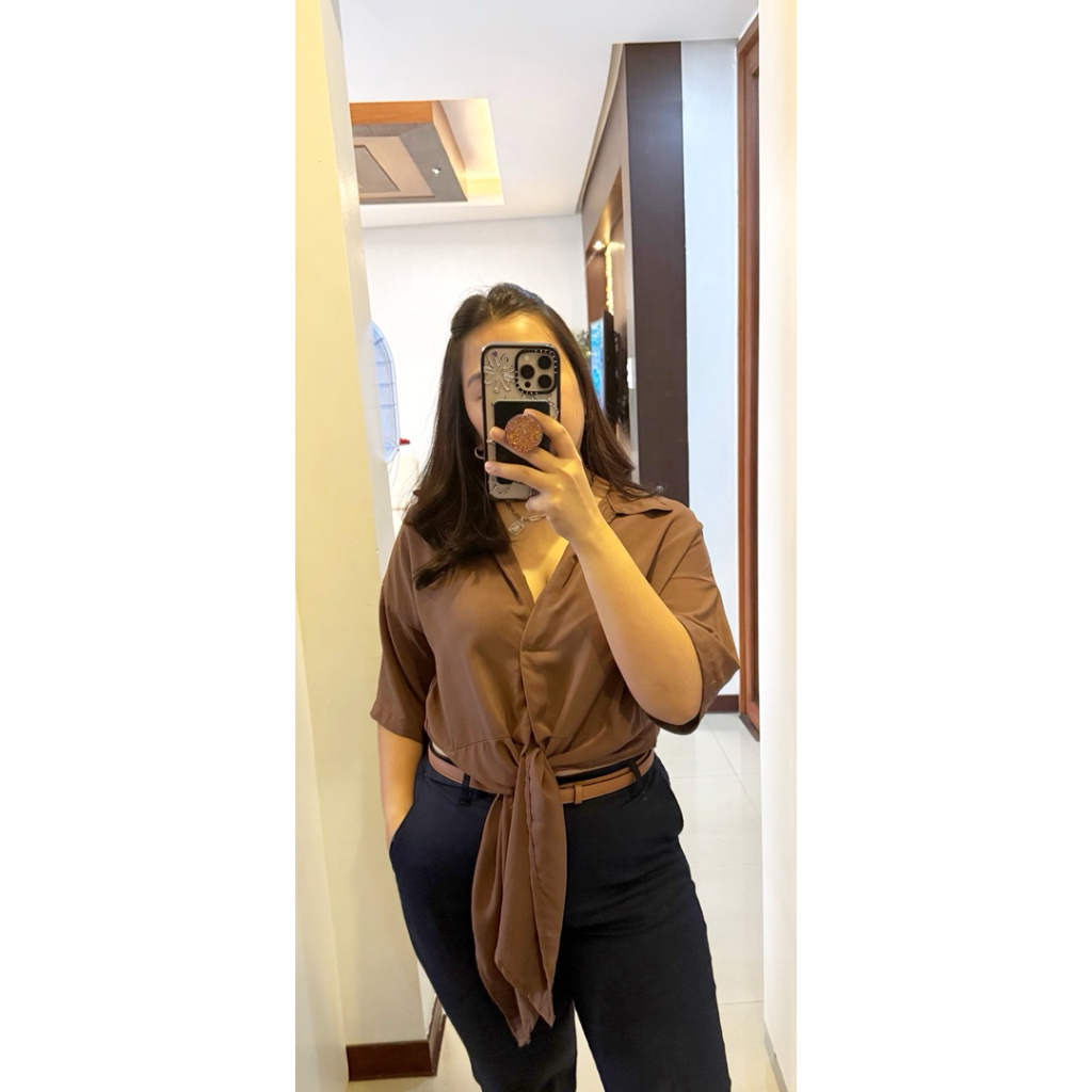 COCOBABA Clothing Freesize Eliz Linen Vneck 3/4 Polo Crop with Tie Polo Shirt Women
