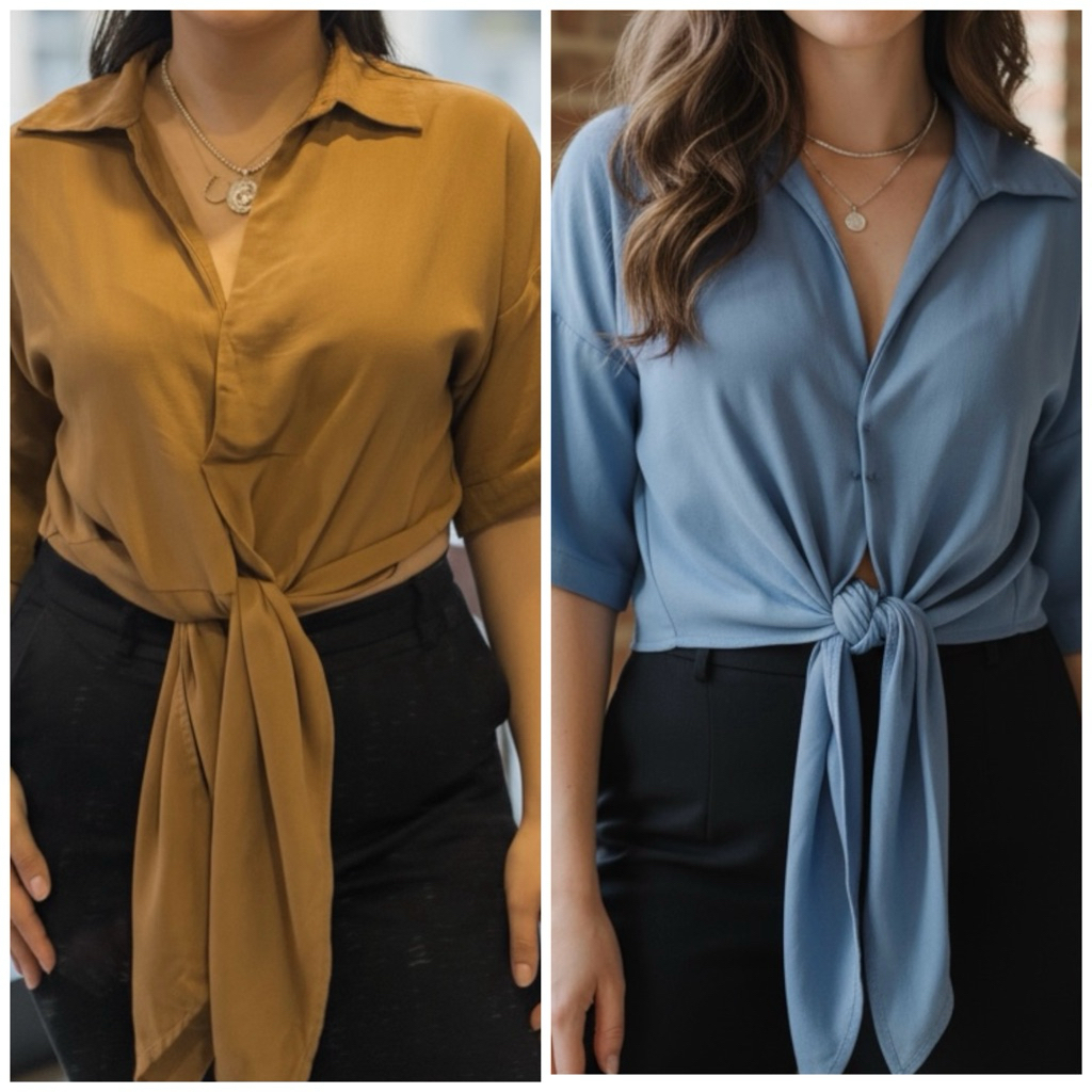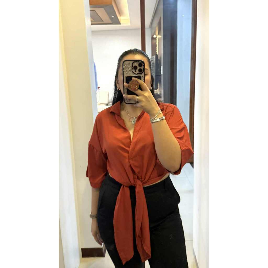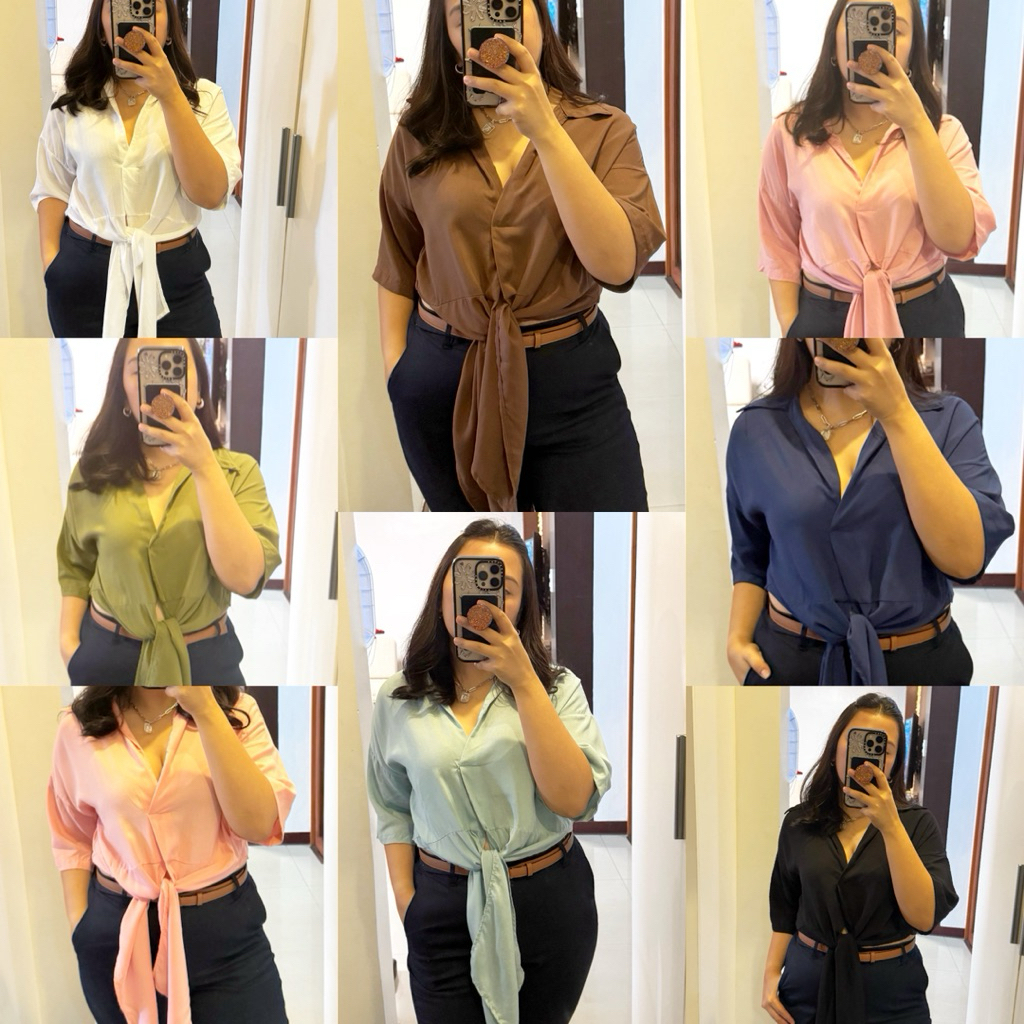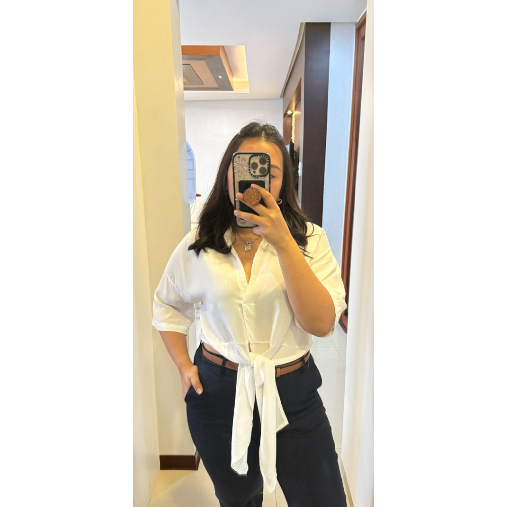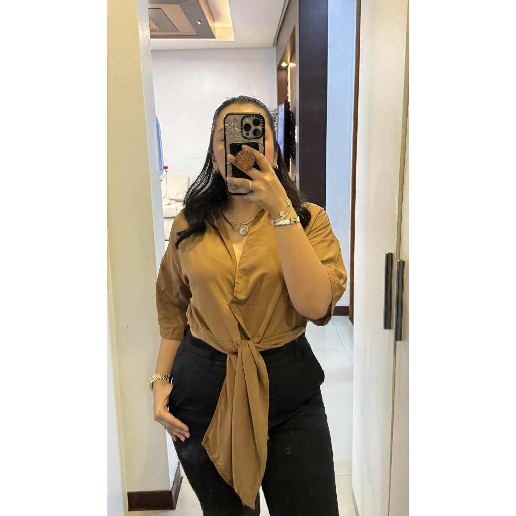 COCOBABA Clothing Freesize Eliz Linen Vneck 3/4 Polo Crop with Tie Polo Shirt Women