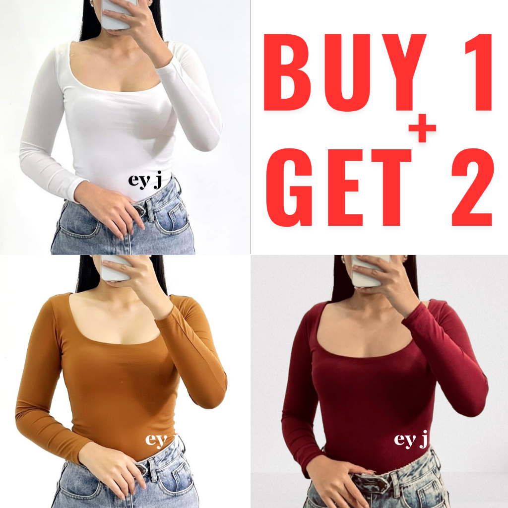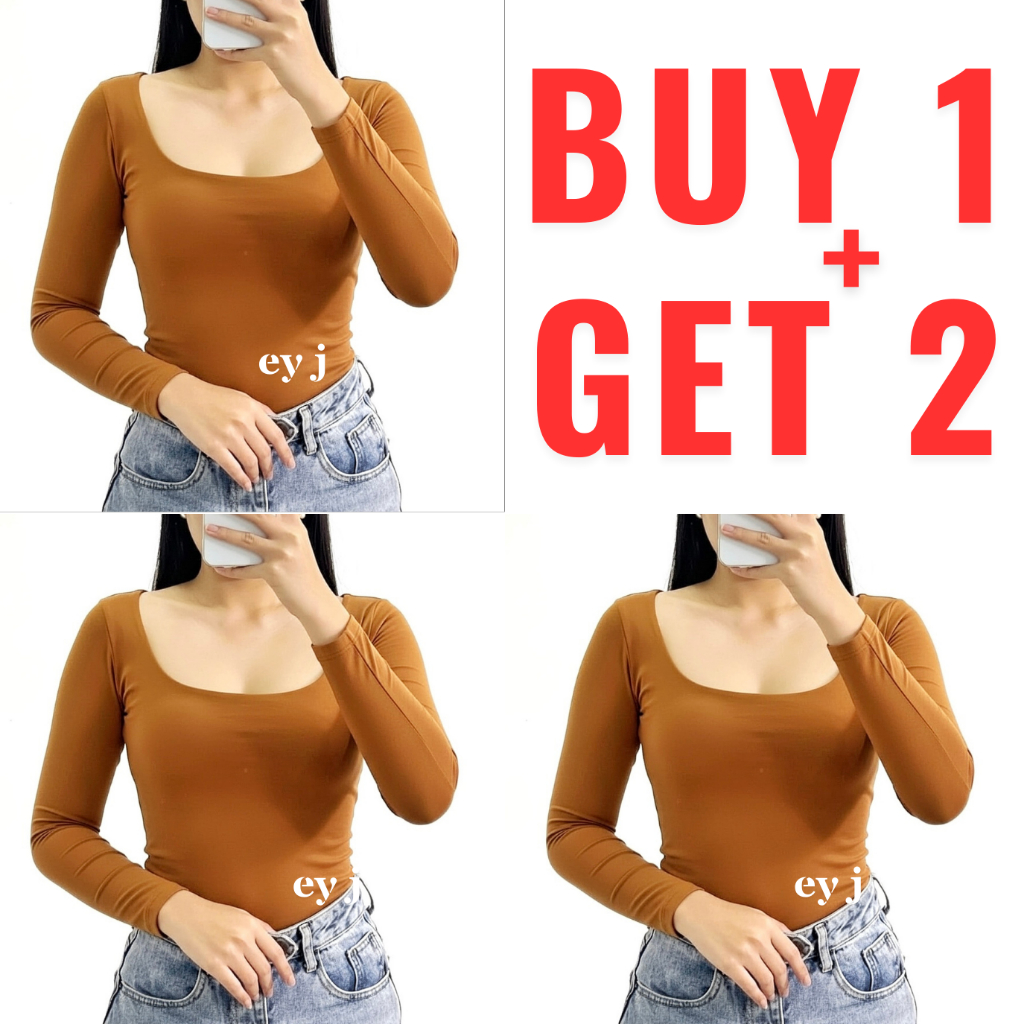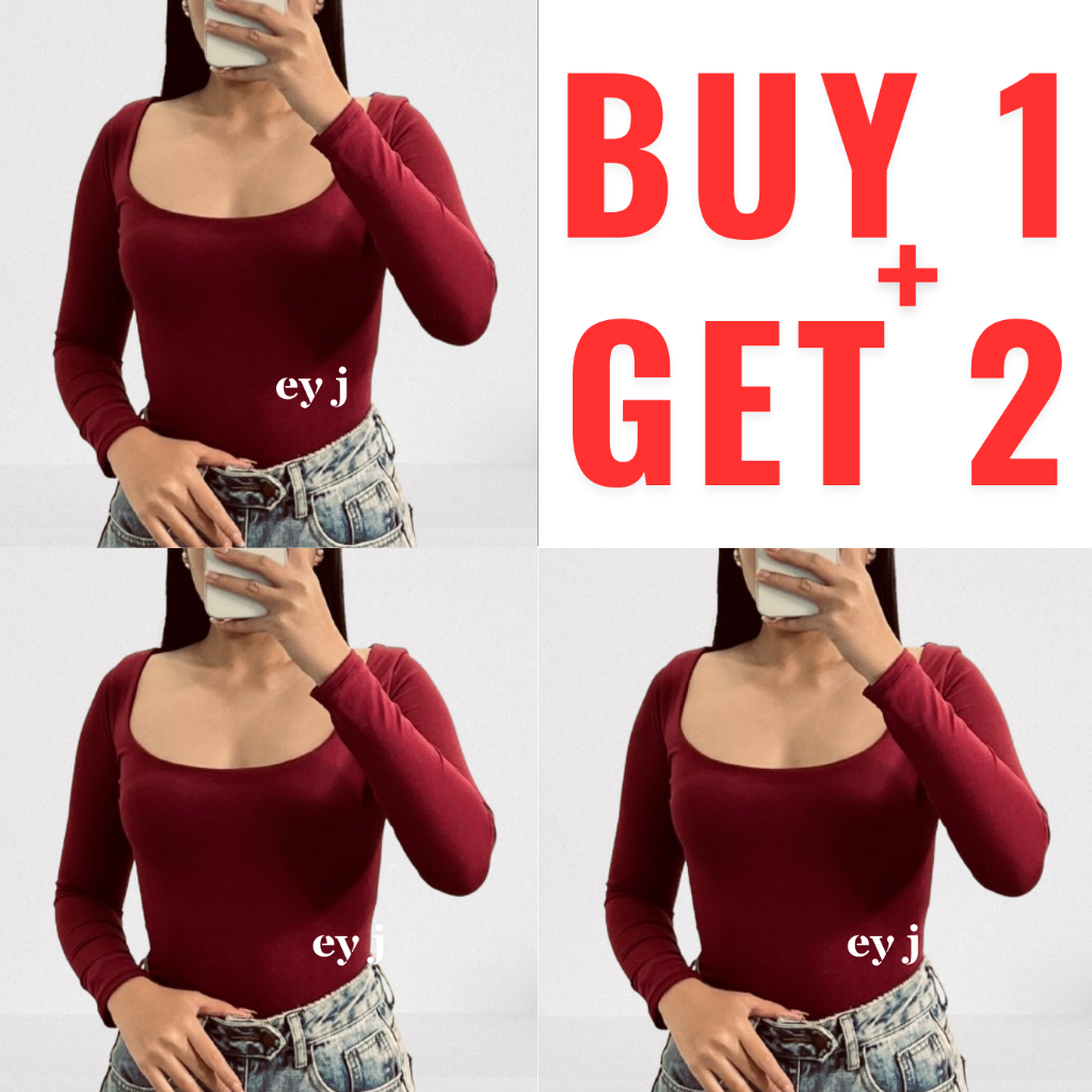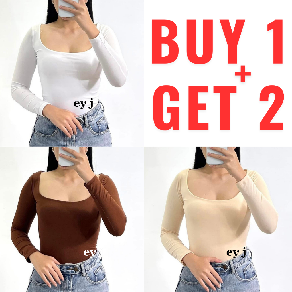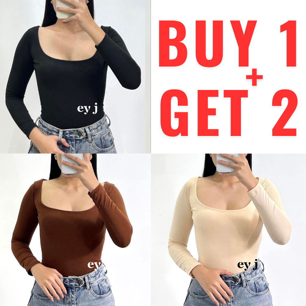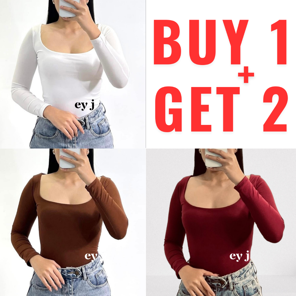BUY 1 + GET 2 FREE (3PCS) Kalie Square Neck Long Sleeve Double Lining Front Top Womenswear Comfort