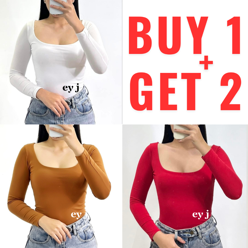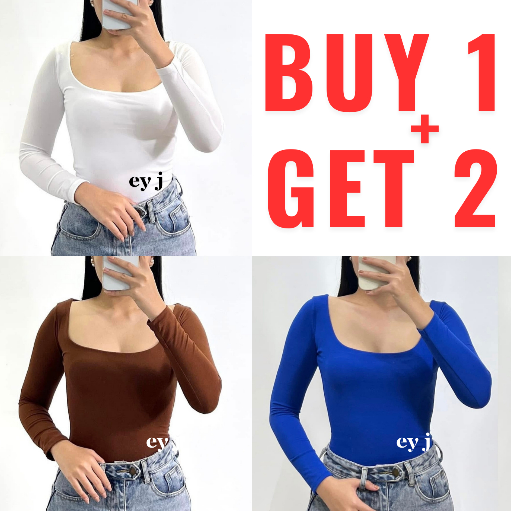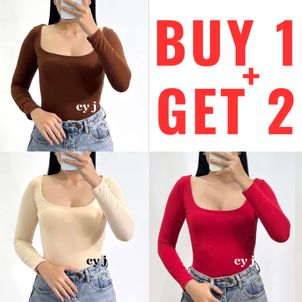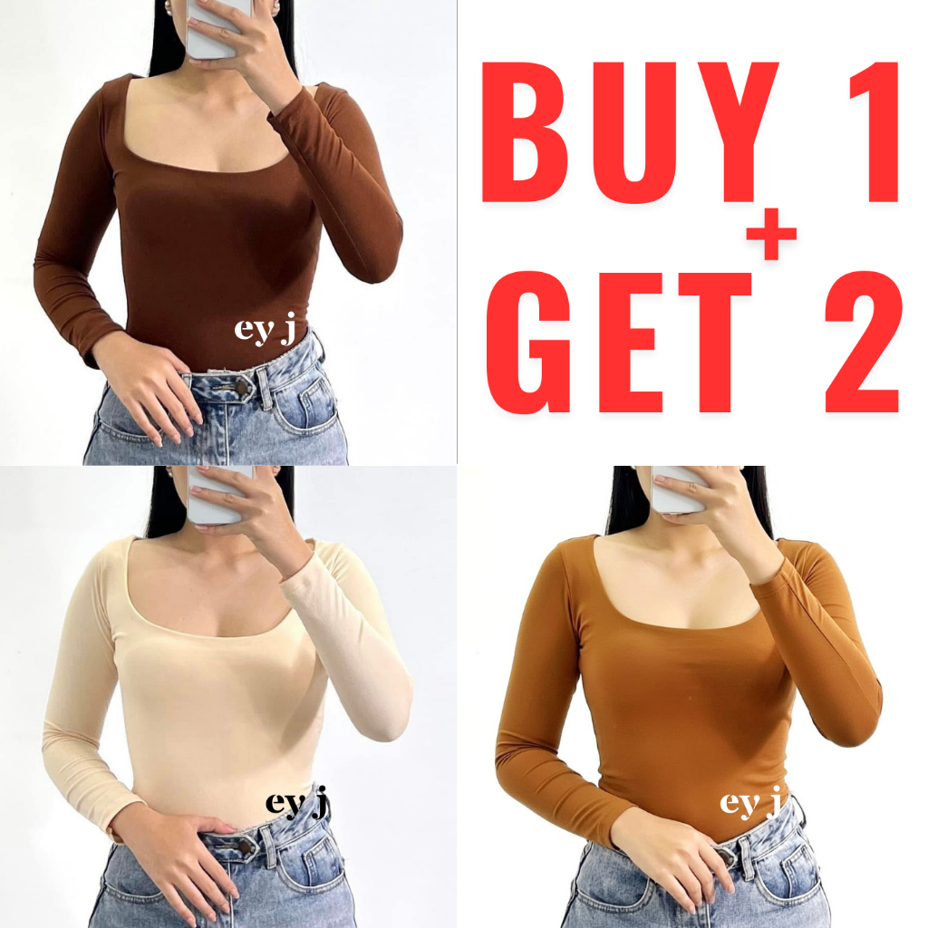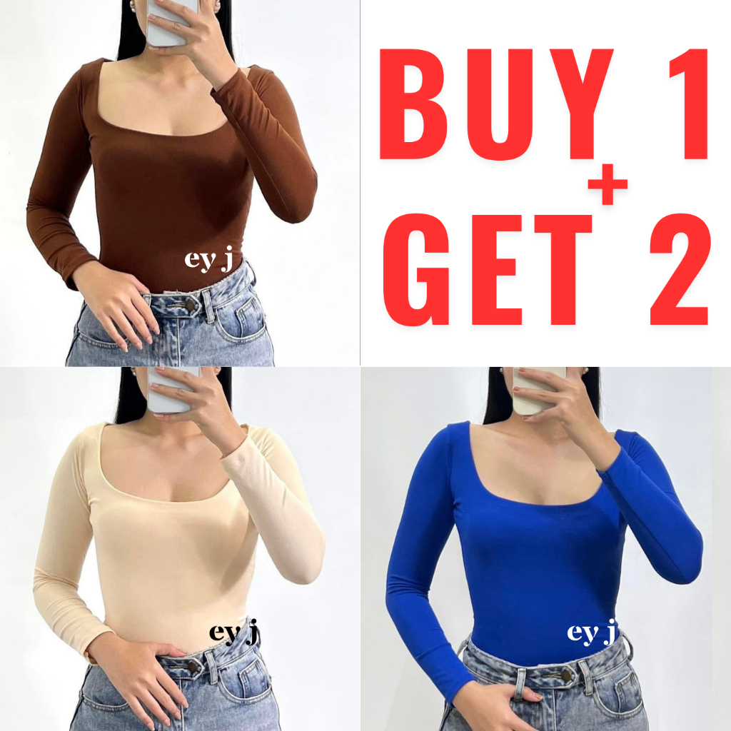 BUY 1 + GET 2 FREE (3PCS) Kalie Square Neck Long Sleeve Double Lining Front Top Womenswear Comfort