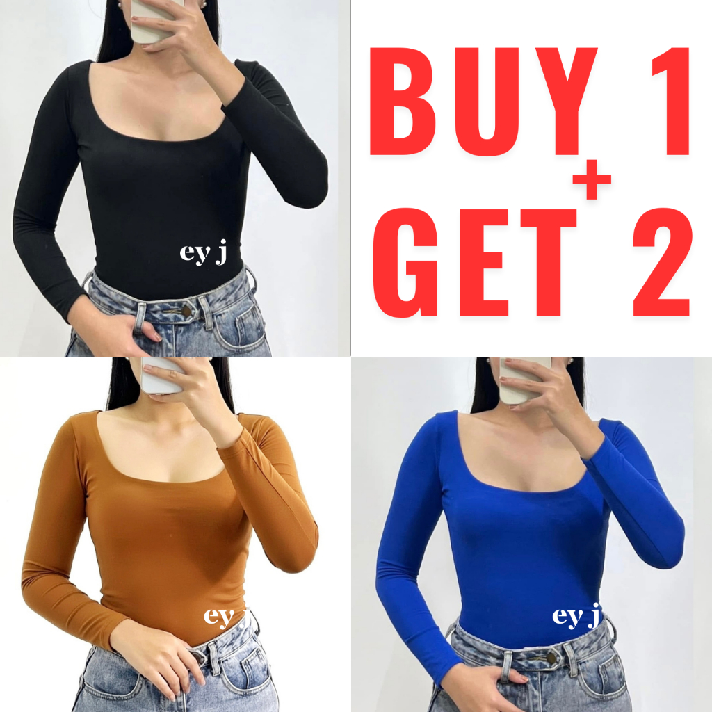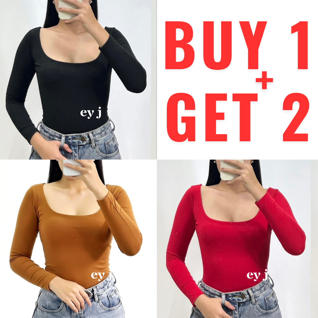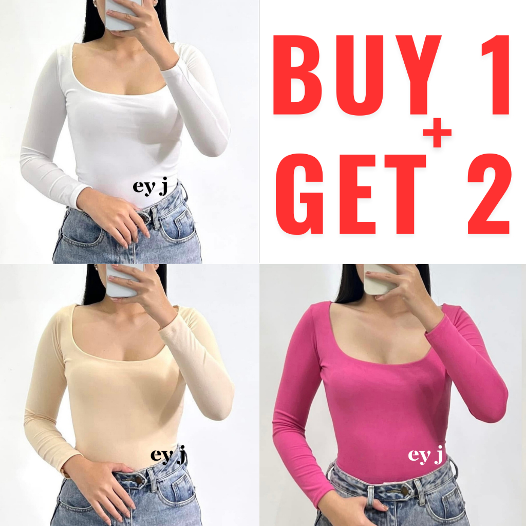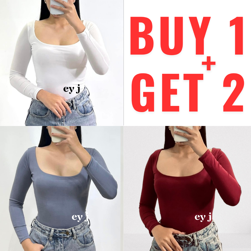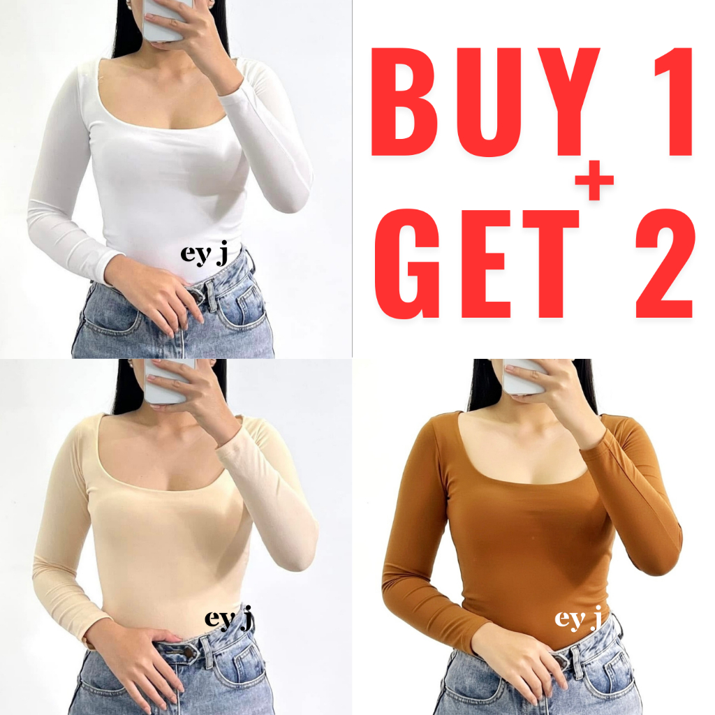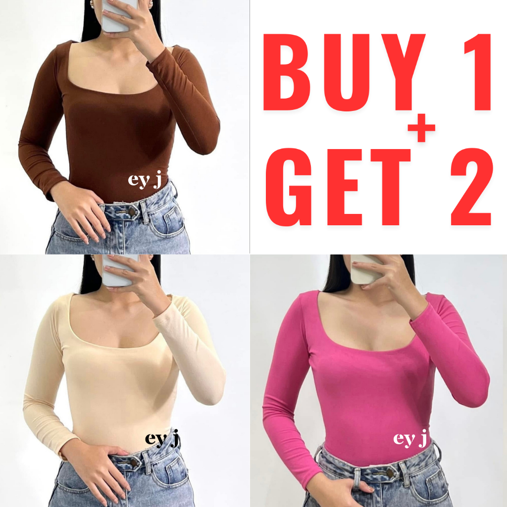 BUY 1 + GET 2 FREE (3PCS) Kalie Square Neck Long Sleeve Double Lining Front Top Womenswear Comfort