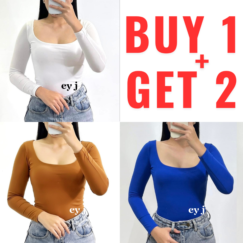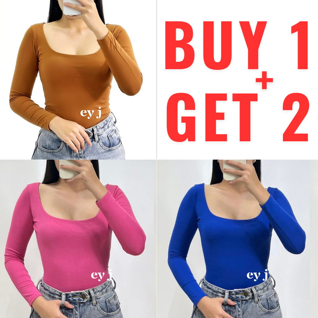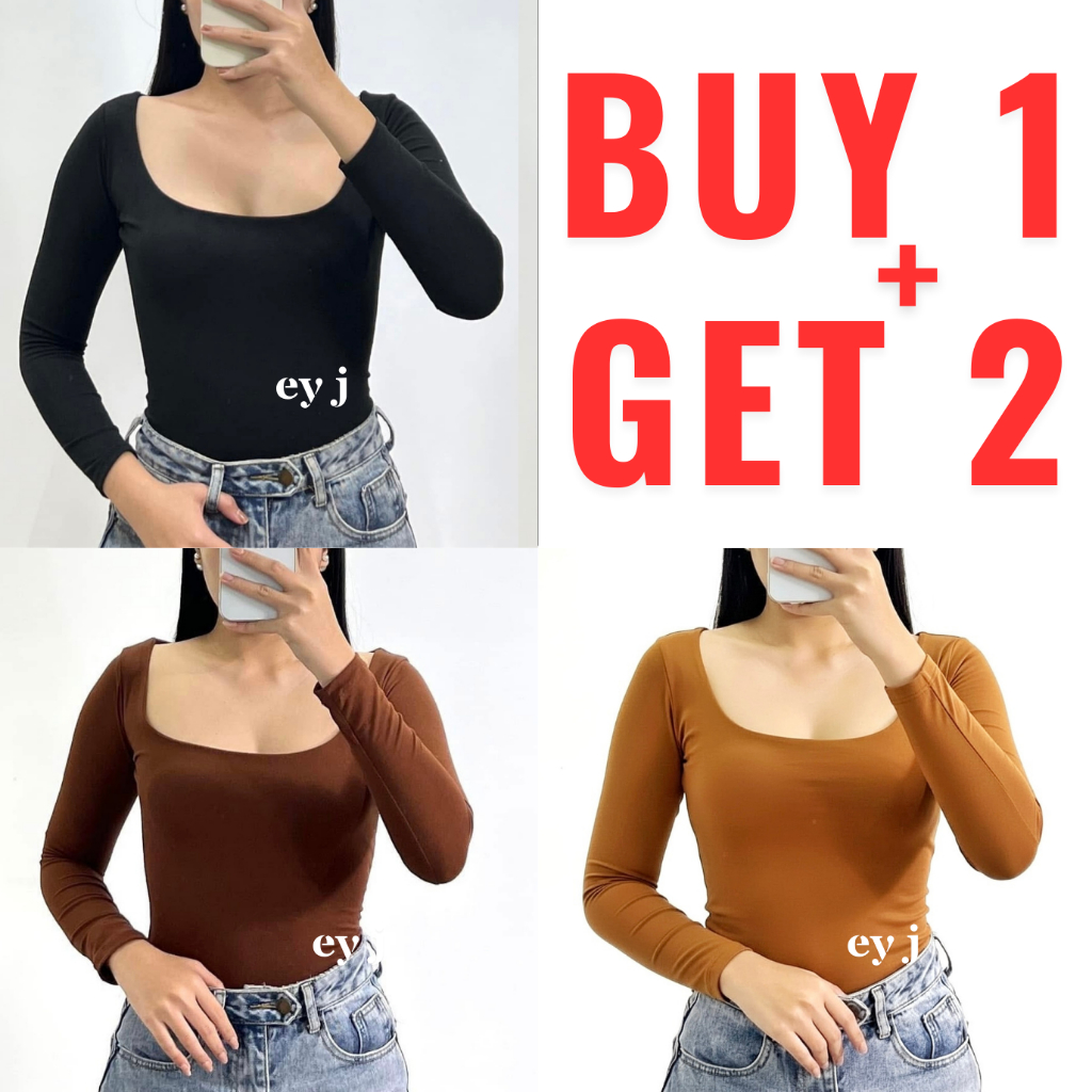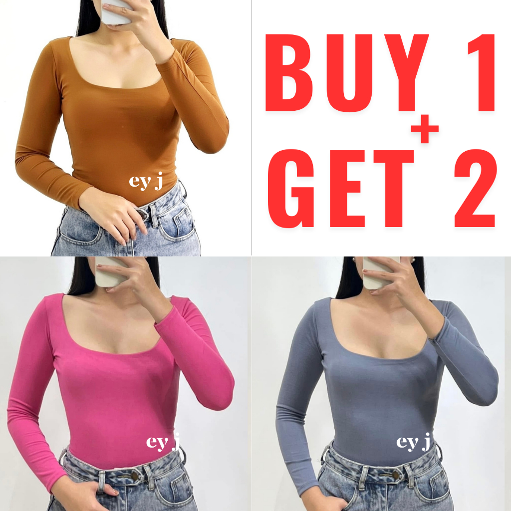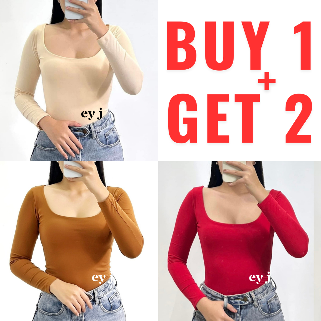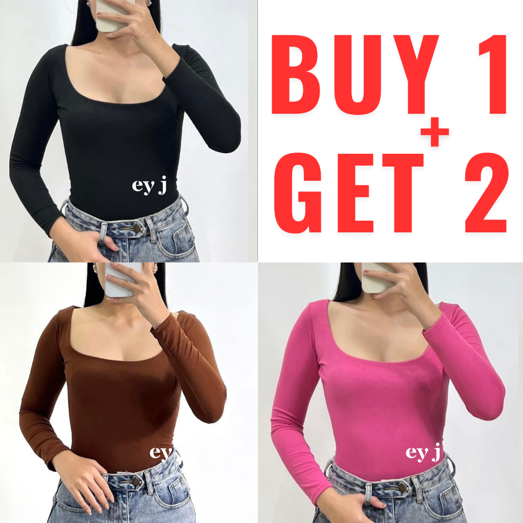 BUY 1 + GET 2 FREE (3PCS) Kalie Square Neck Long Sleeve Double Lining Front Top Womenswear Comfort