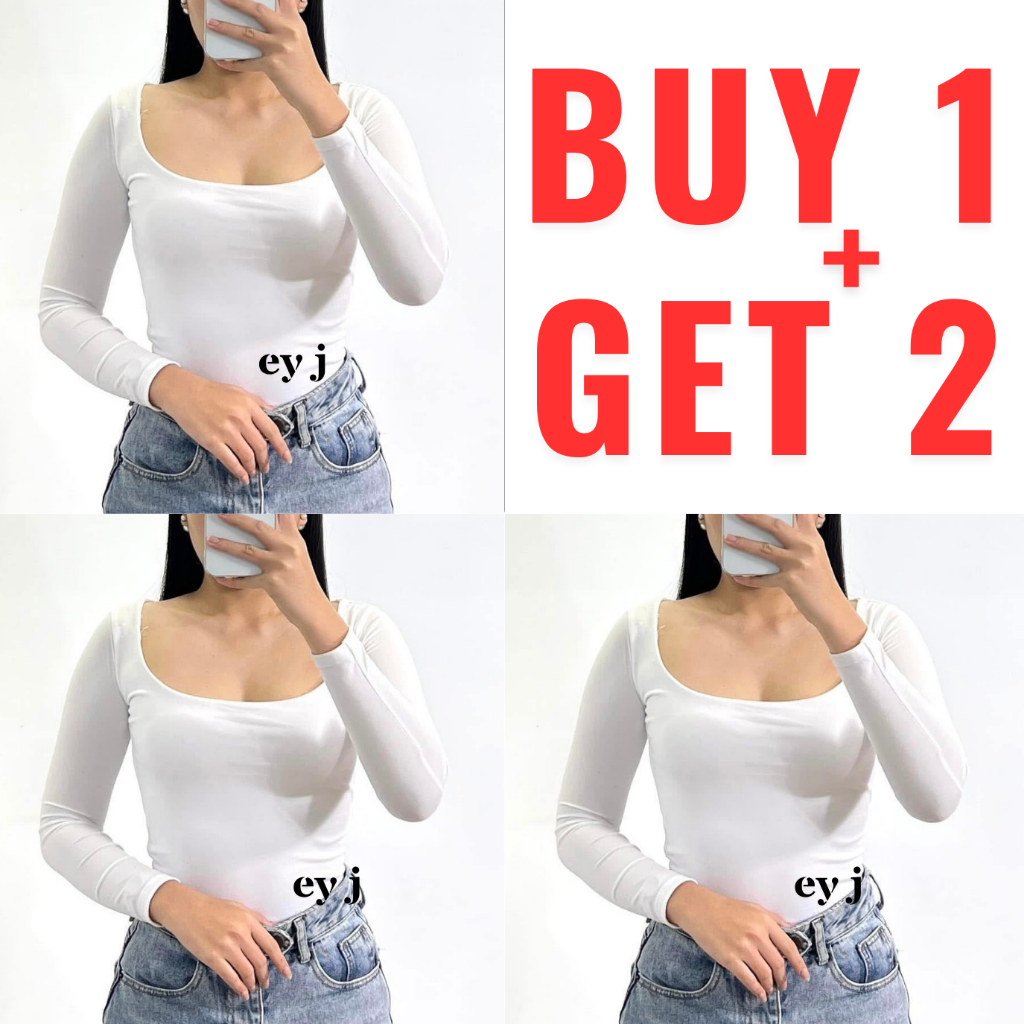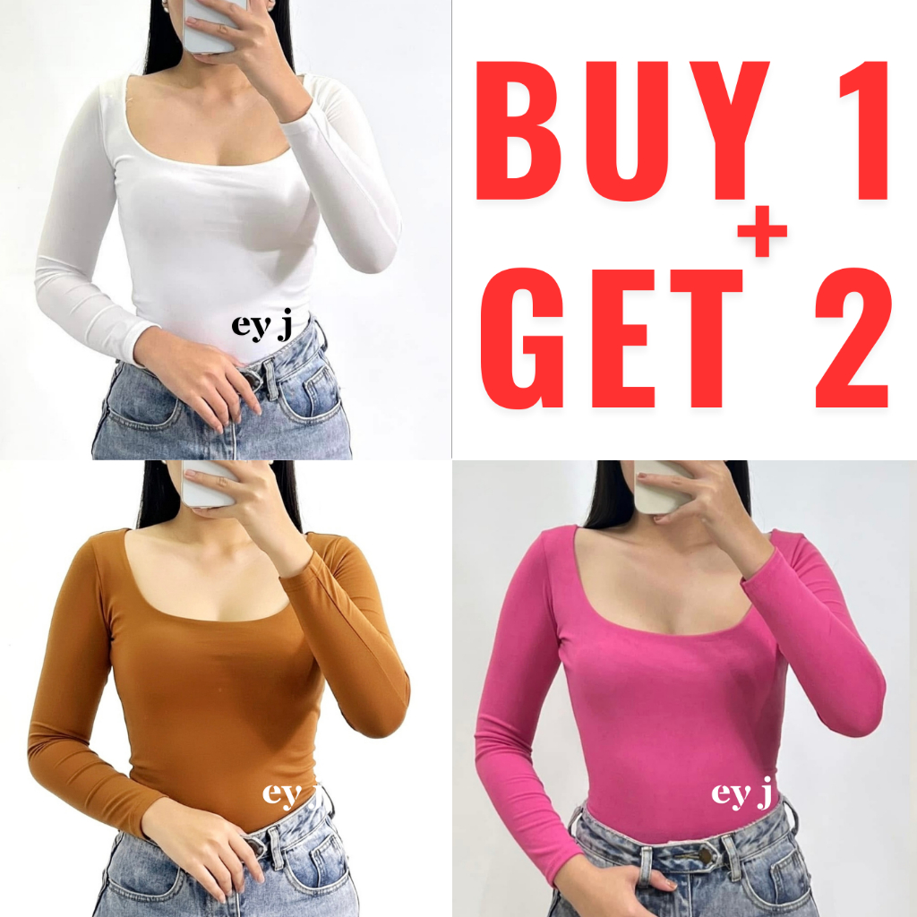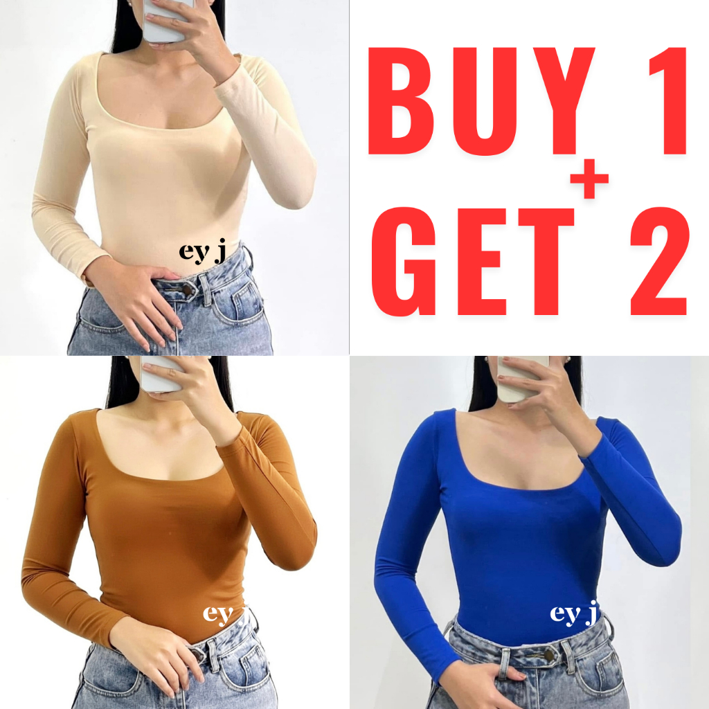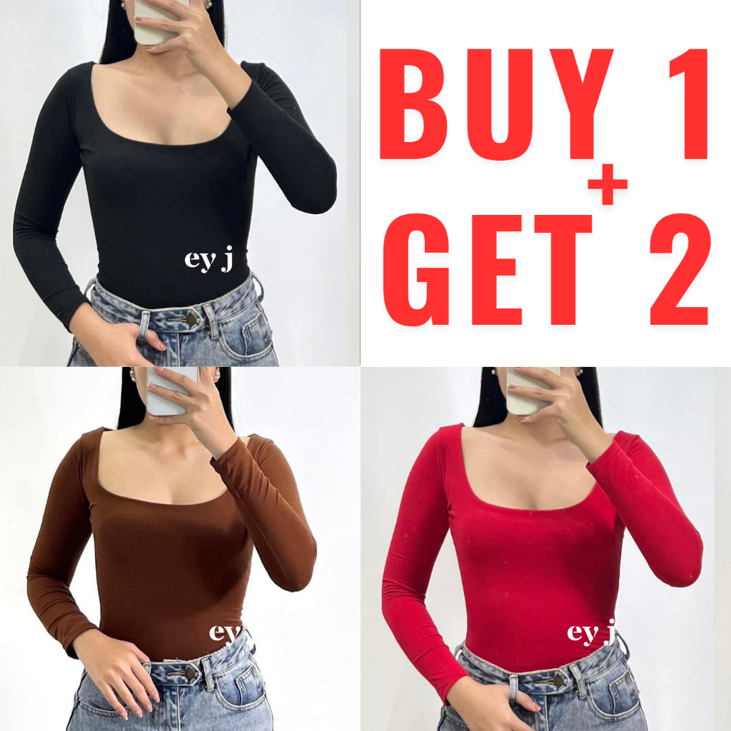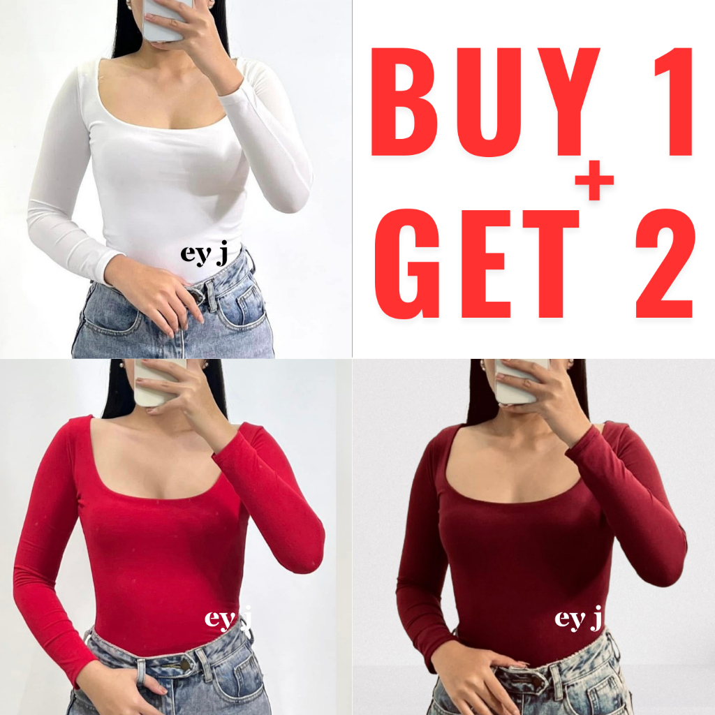 BUY 1 + GET 2 FREE (3PCS) Kalie Square Neck Long Sleeve Double Lining Front Top Womenswear Comfort