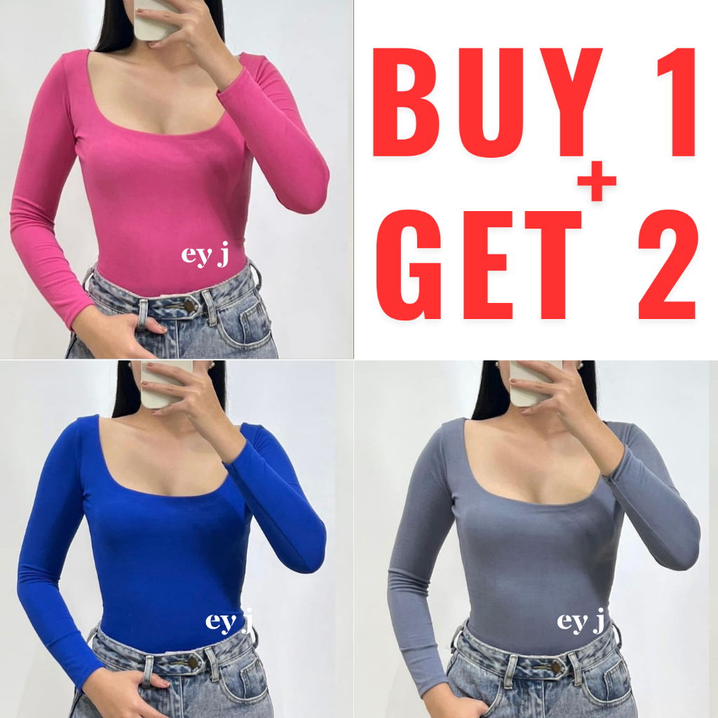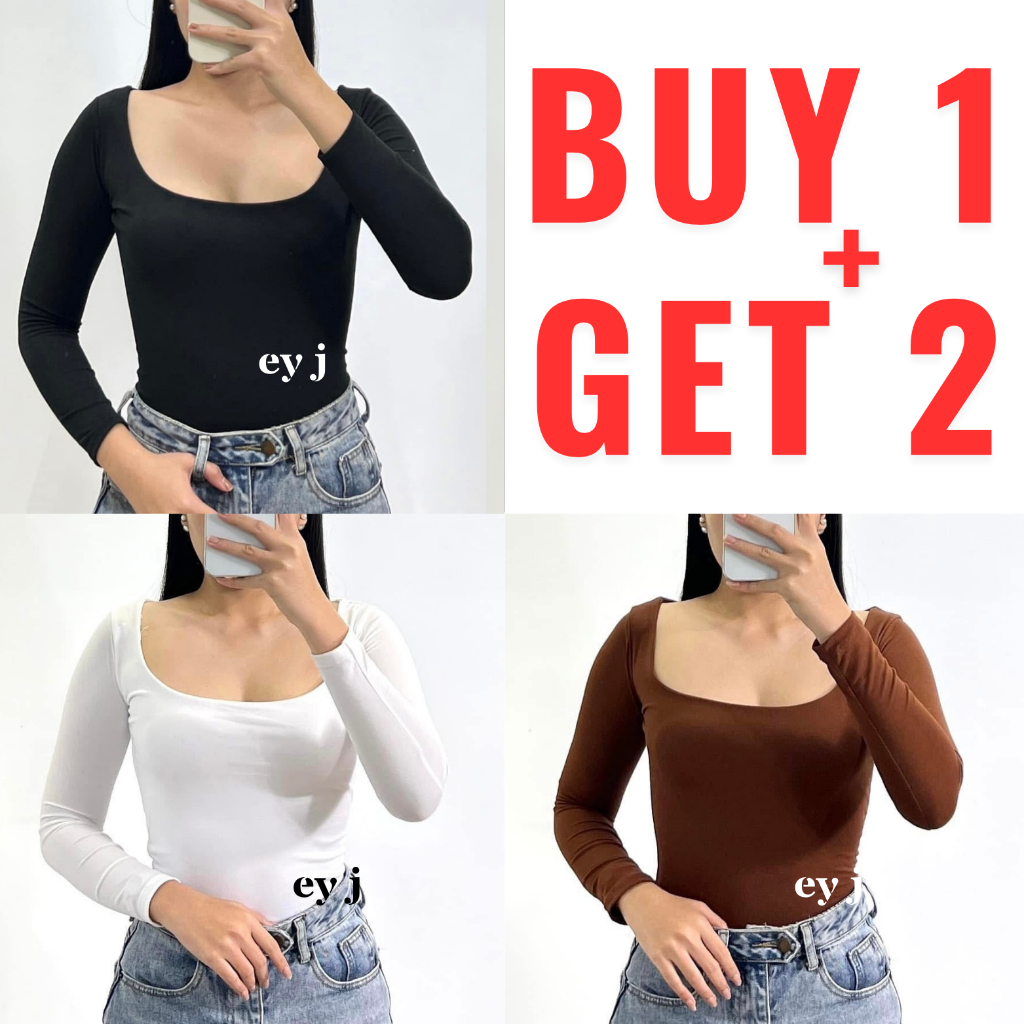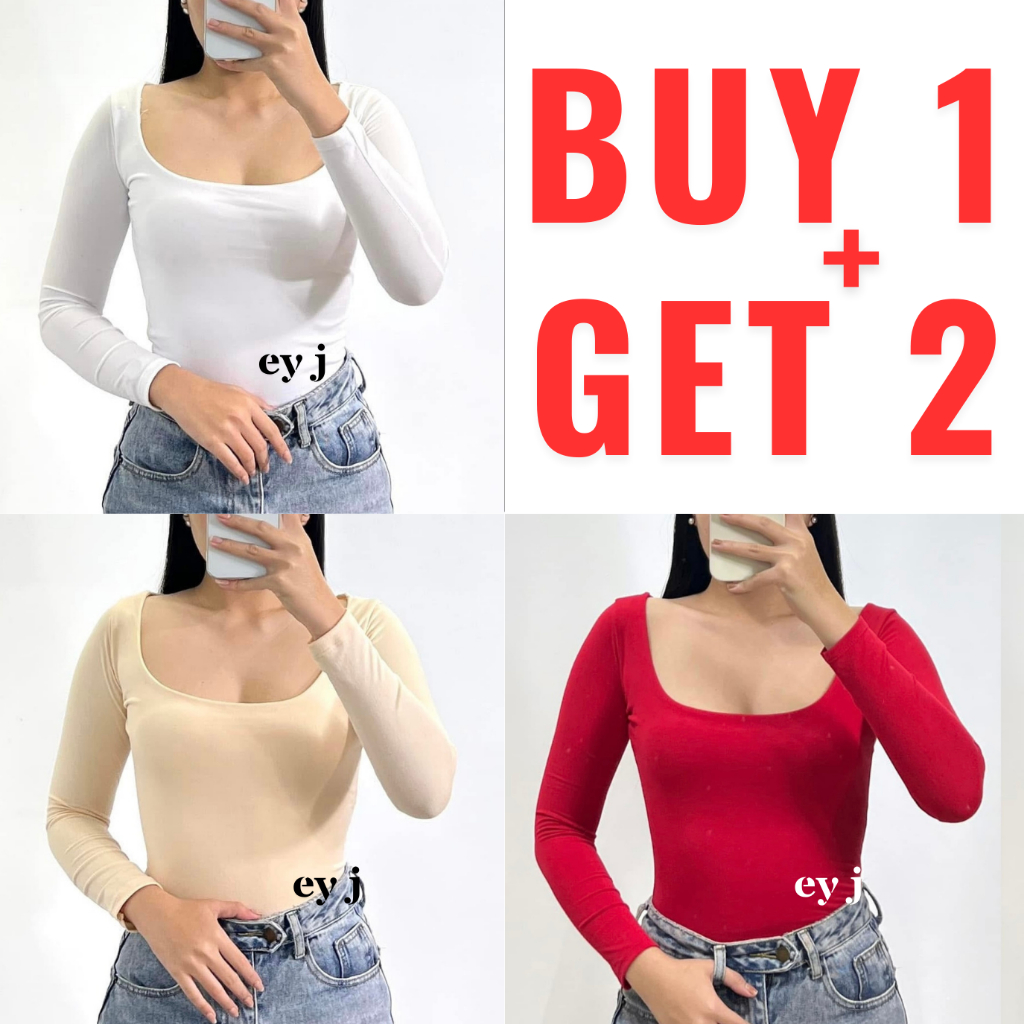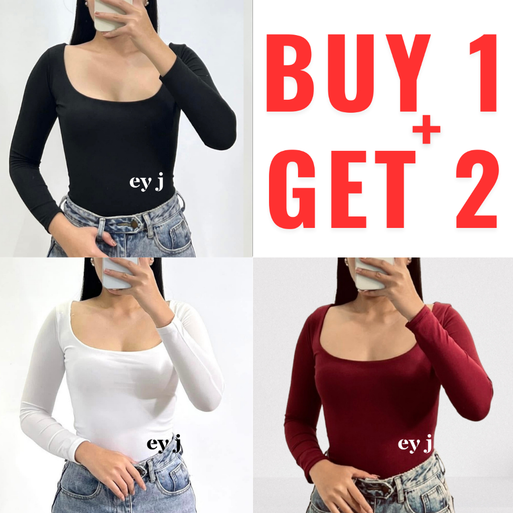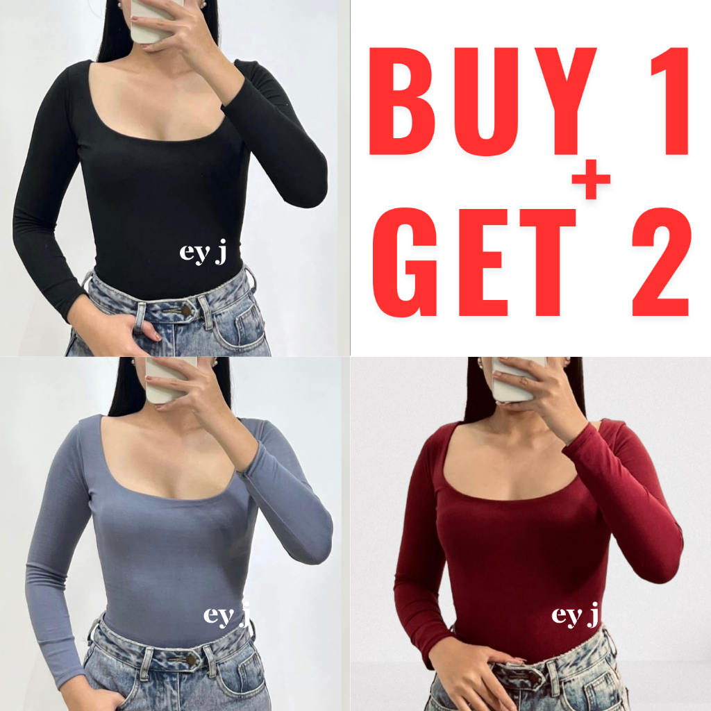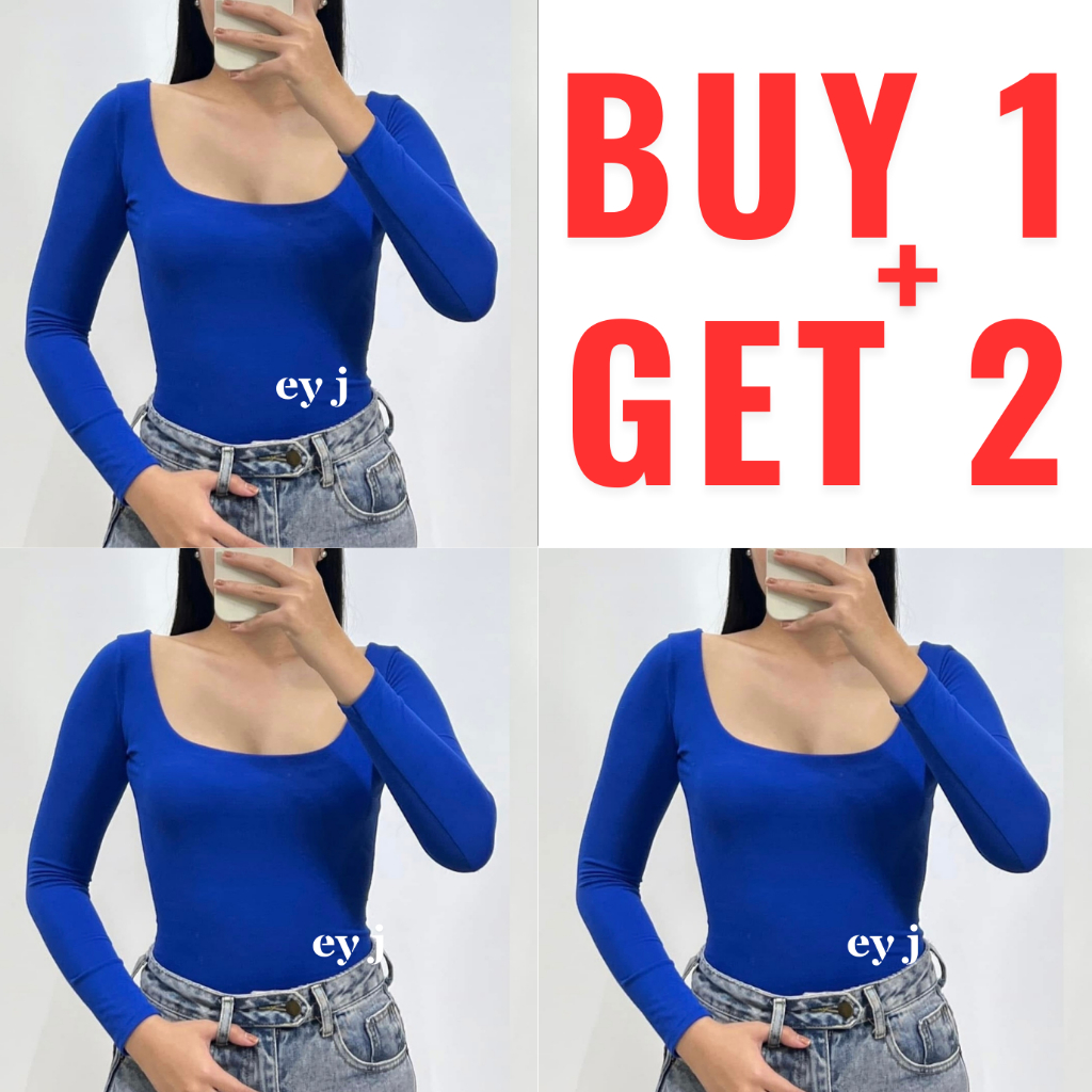 BUY 1 + GET 2 FREE (3PCS) Kalie Square Neck Long Sleeve Double Lining Front Top Womenswear Comfort