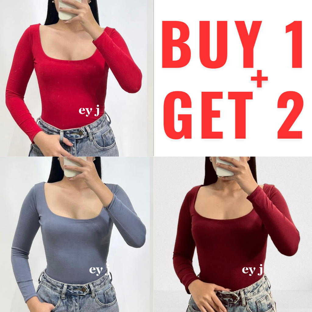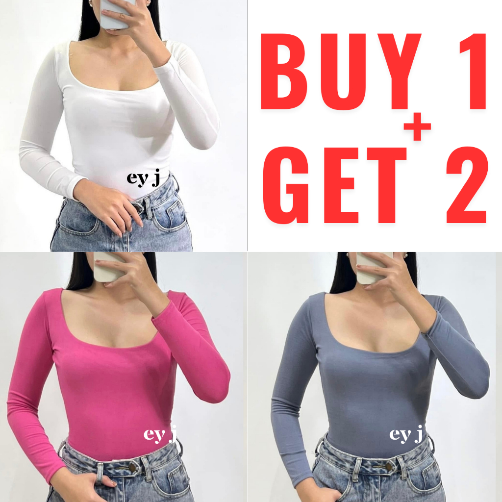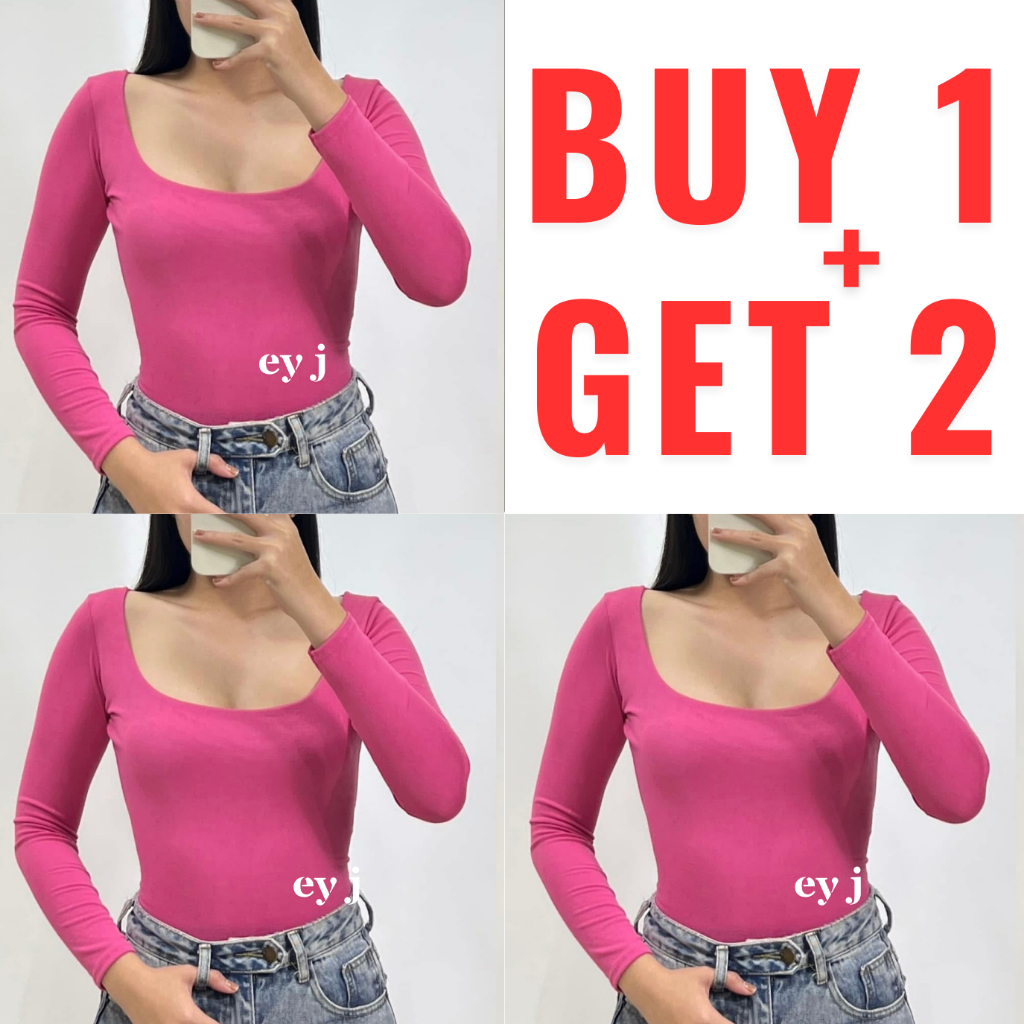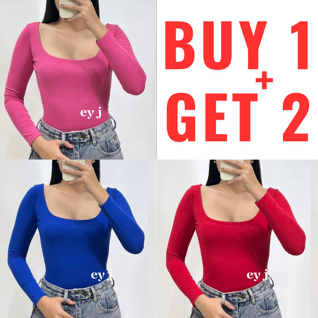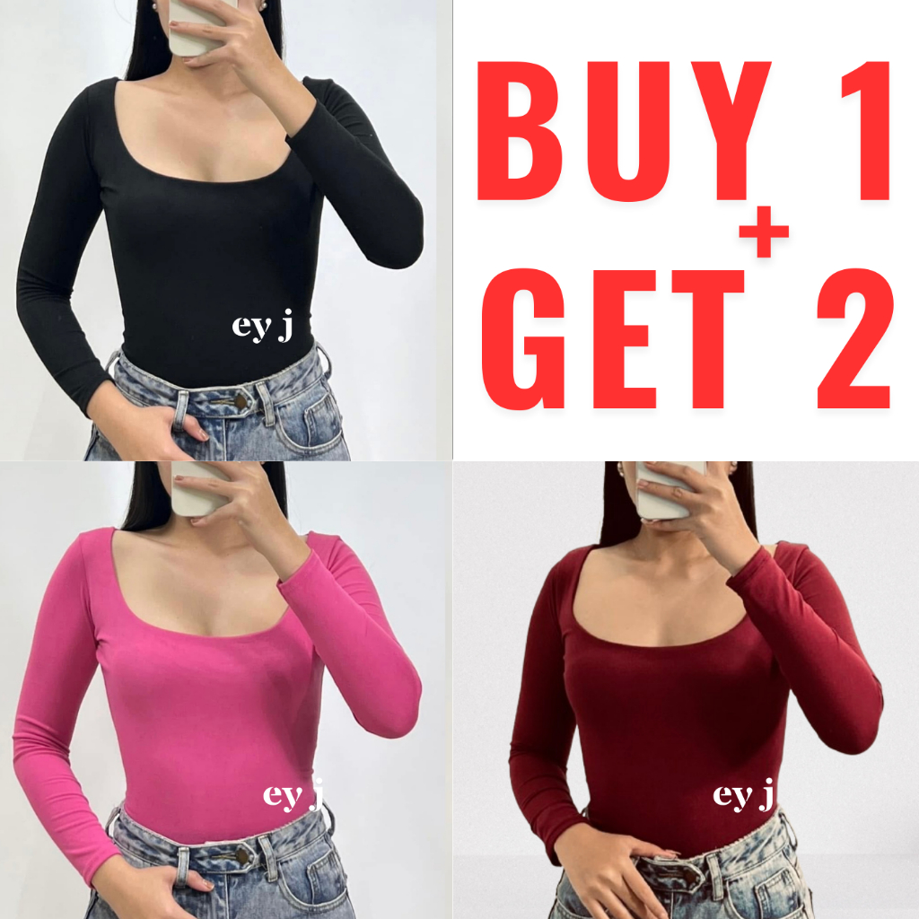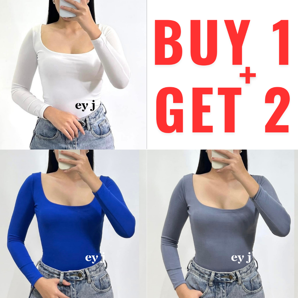 BUY 1 + GET 2 FREE (3PCS) Kalie Square Neck Long Sleeve Double Lining Front Top Womenswear Comfort