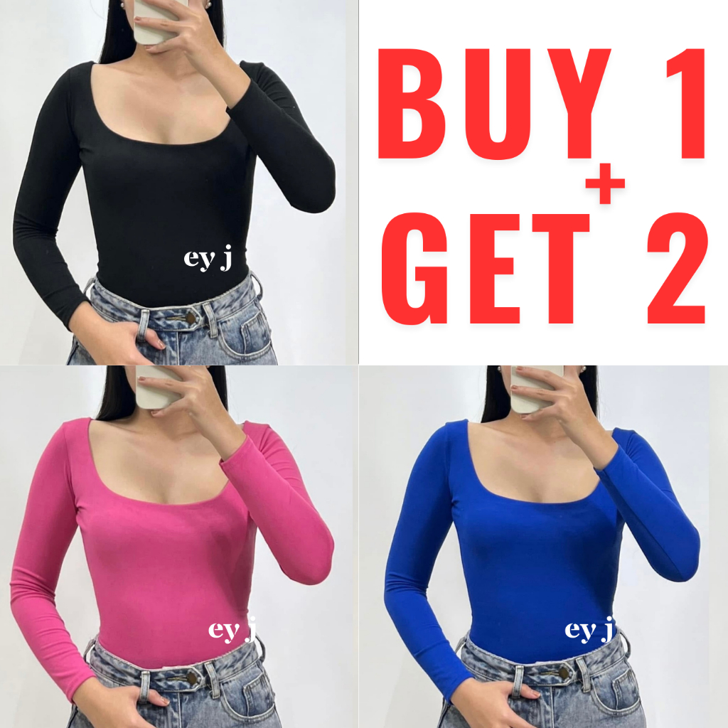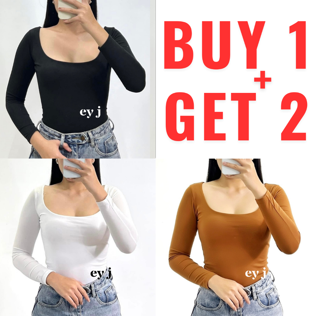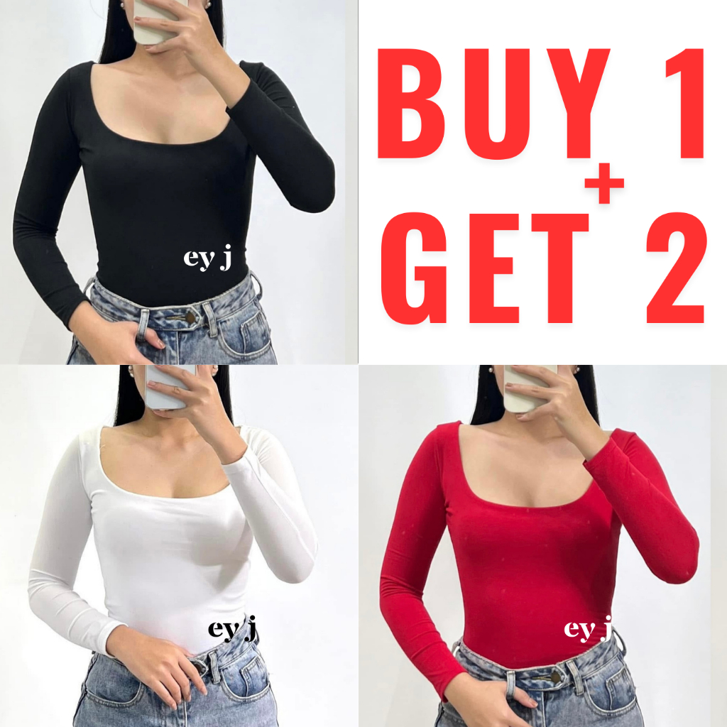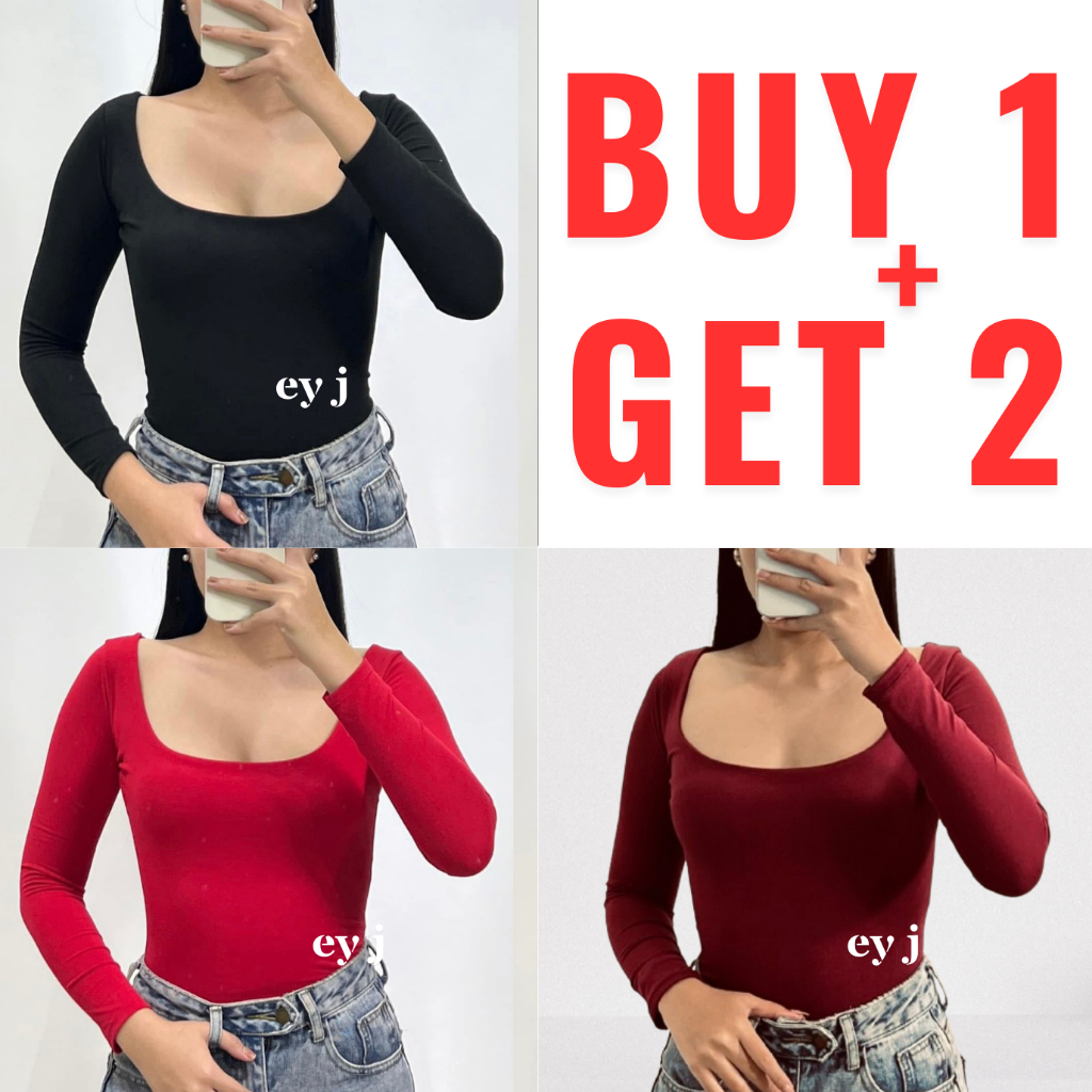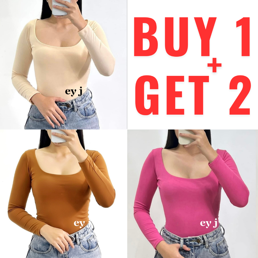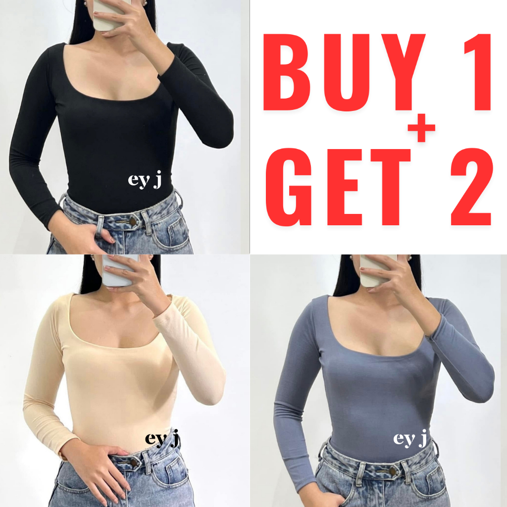 BUY 1 + GET 2 FREE (3PCS) Kalie Square Neck Long Sleeve Double Lining Front Top Womenswear Comfort