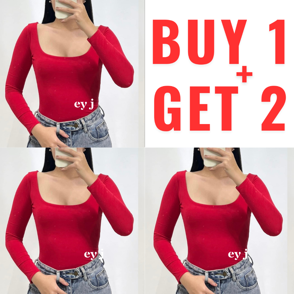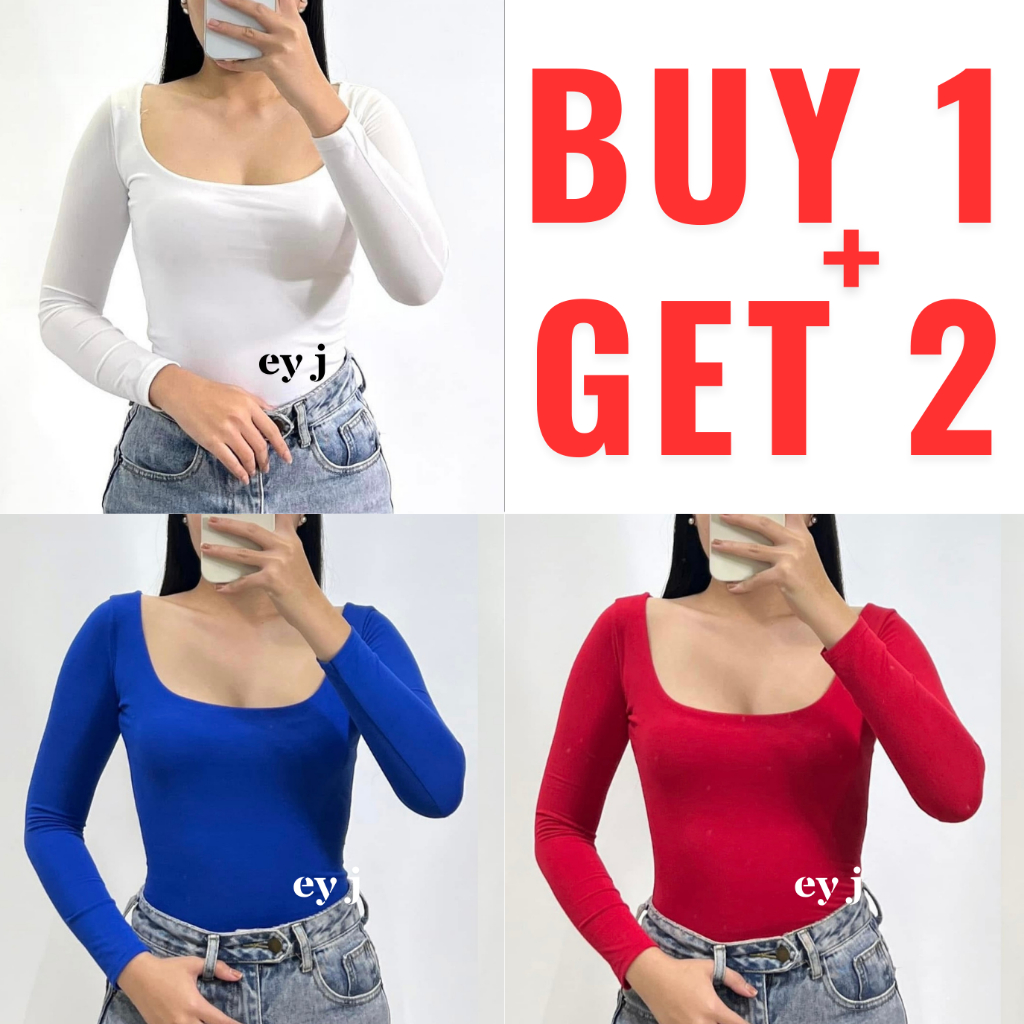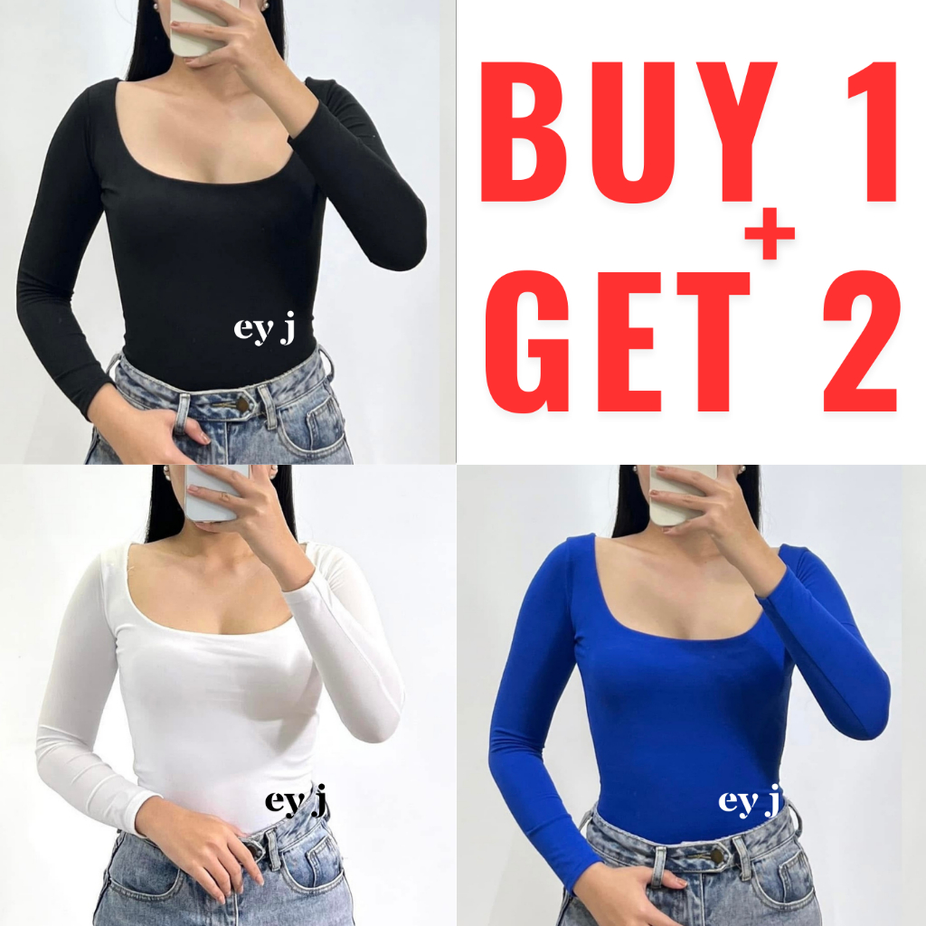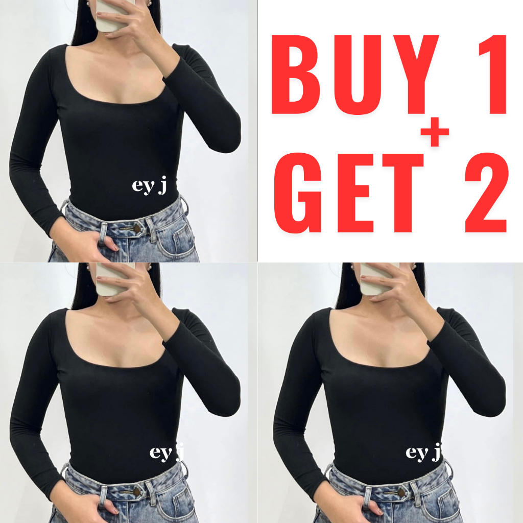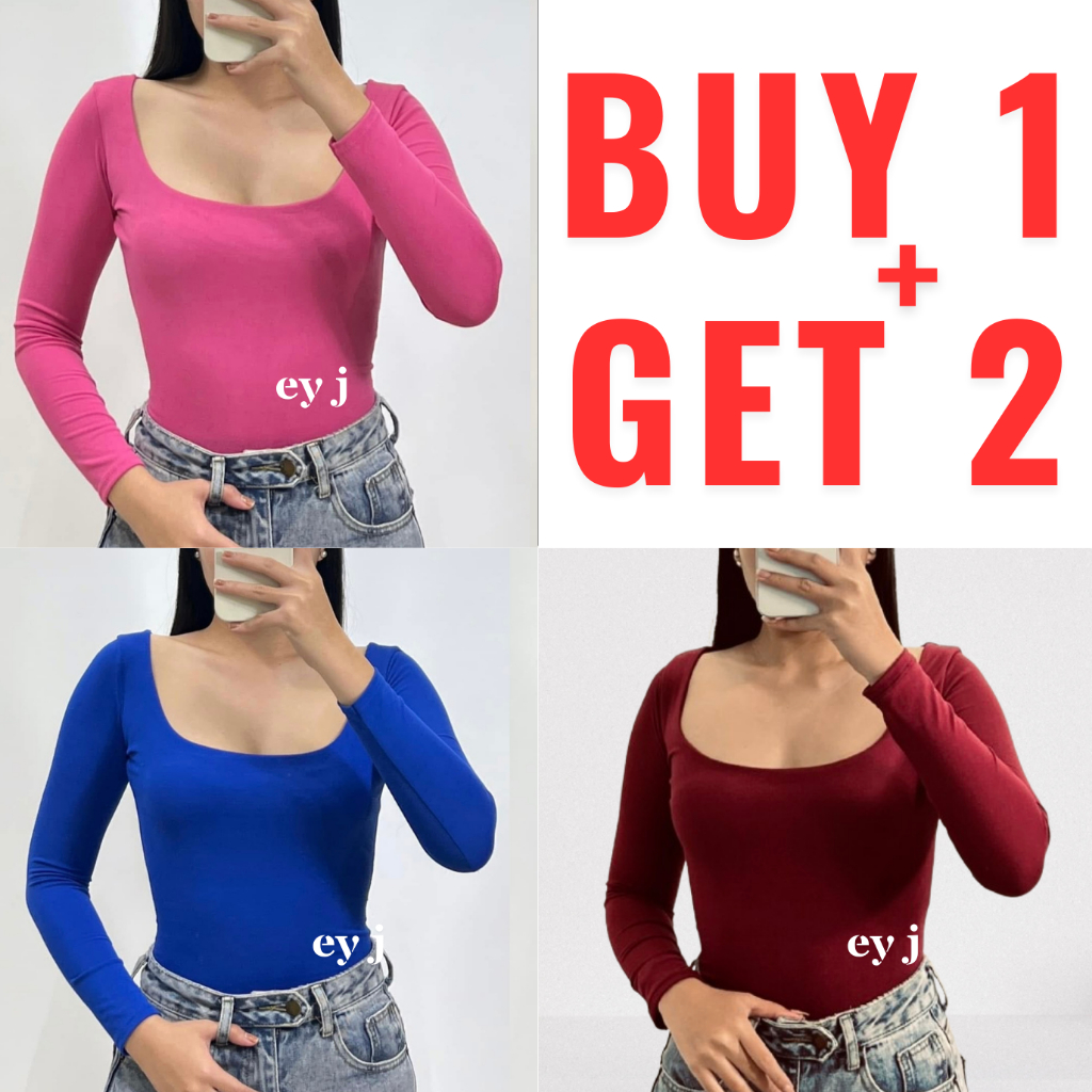 BUY 1 + GET 2 FREE (3PCS) Kalie Square Neck Long Sleeve Double Lining Front Top Womenswear Comfort