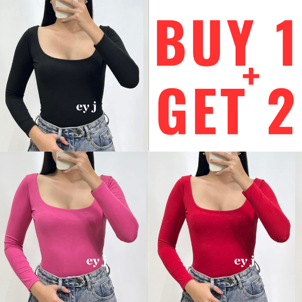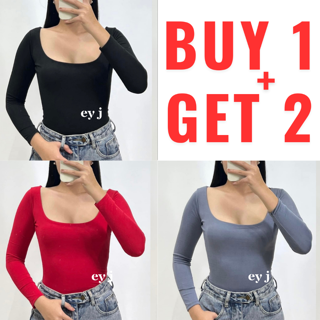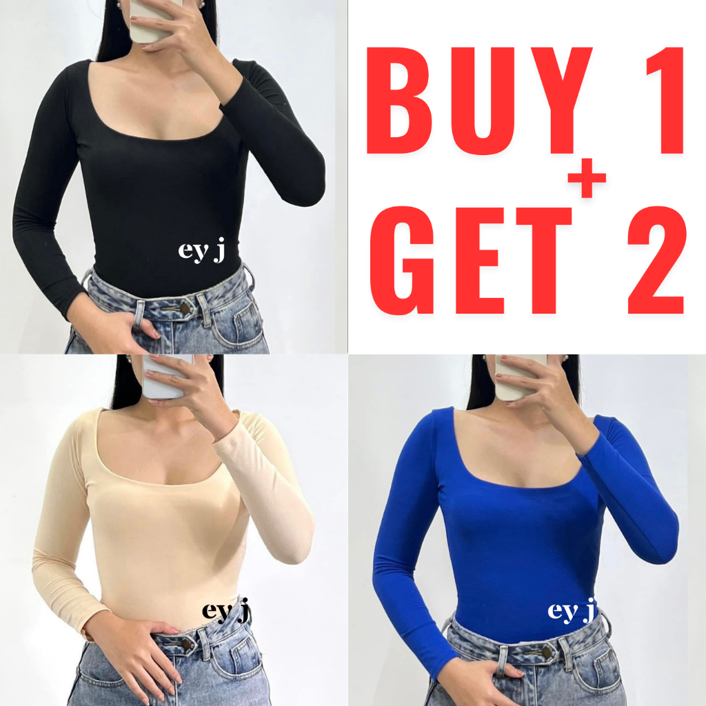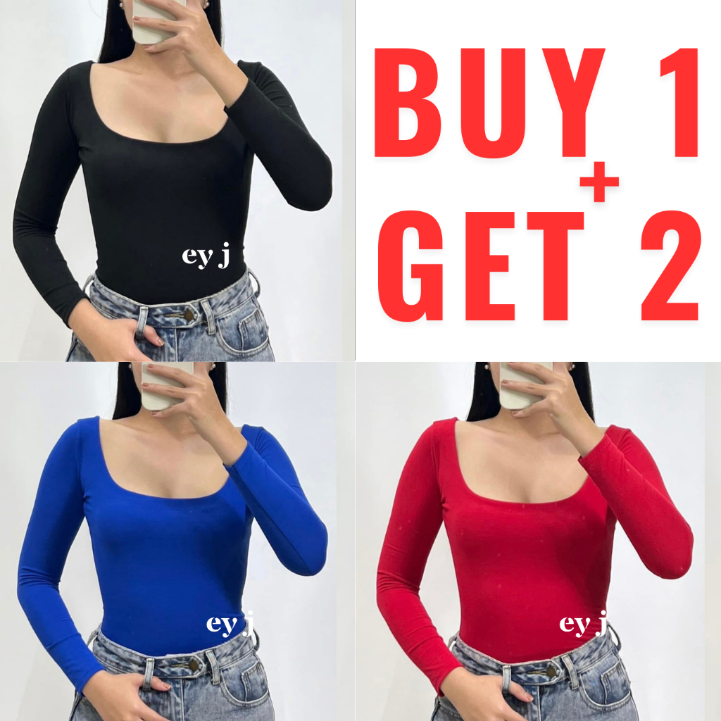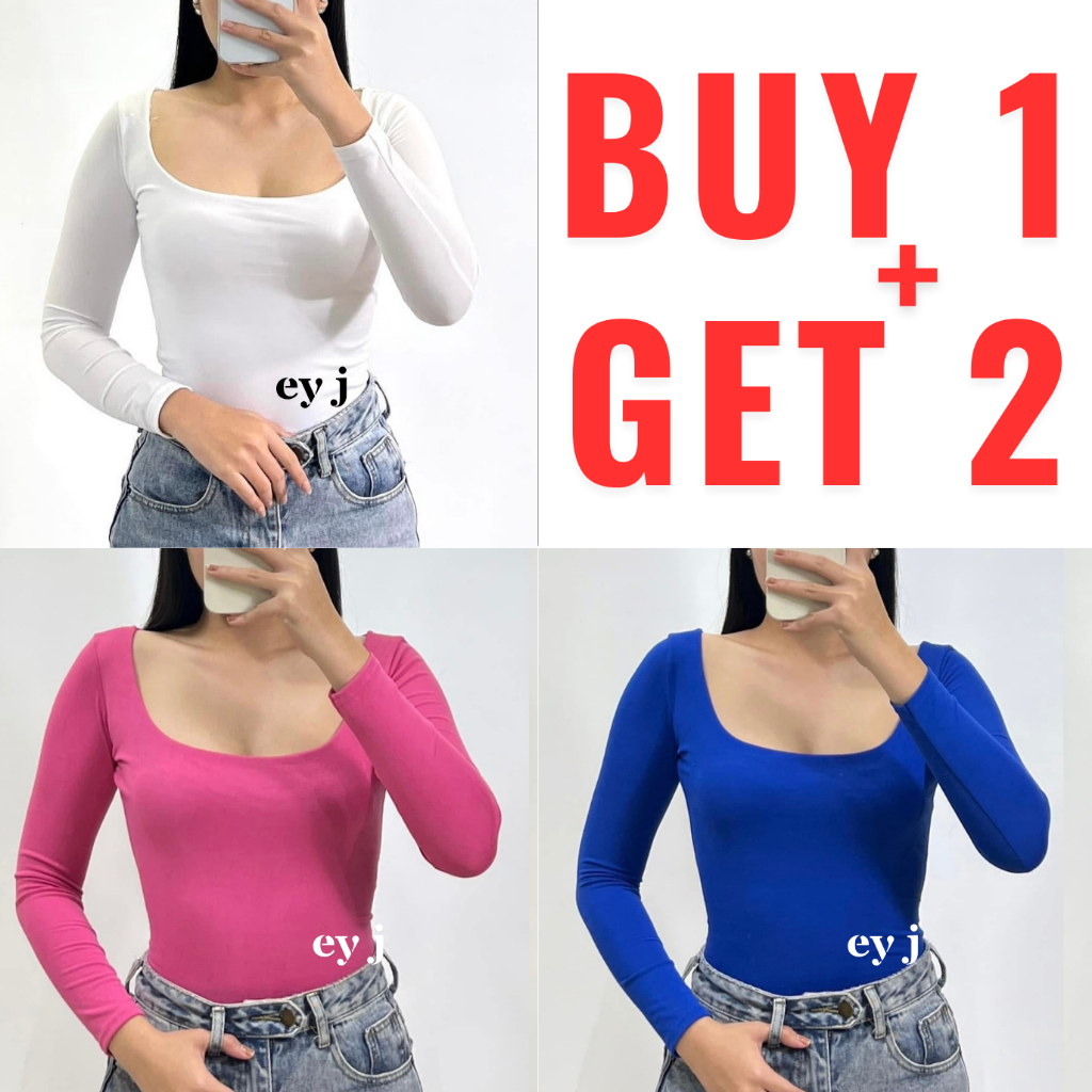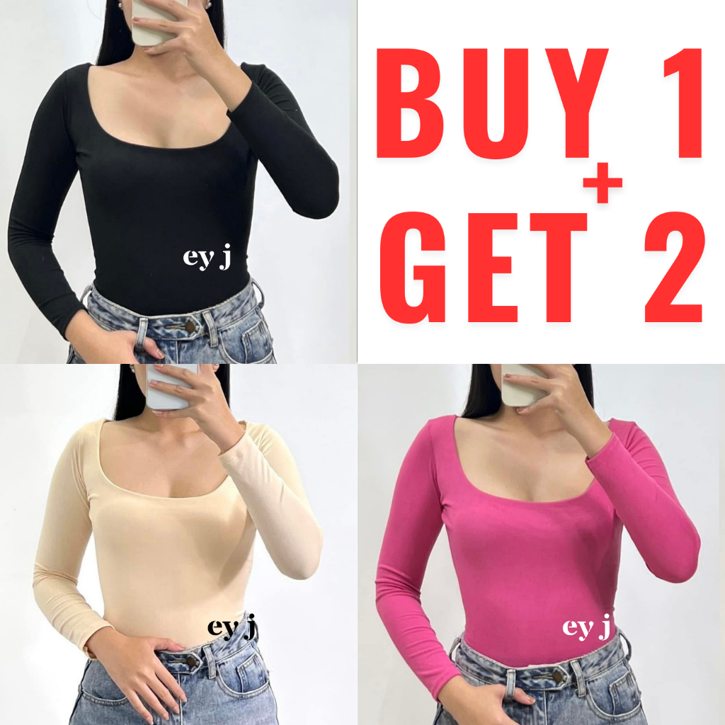 BUY 1 + GET 2 FREE (3PCS) Kalie Square Neck Long Sleeve Double Lining Front Top Womenswear Comfort