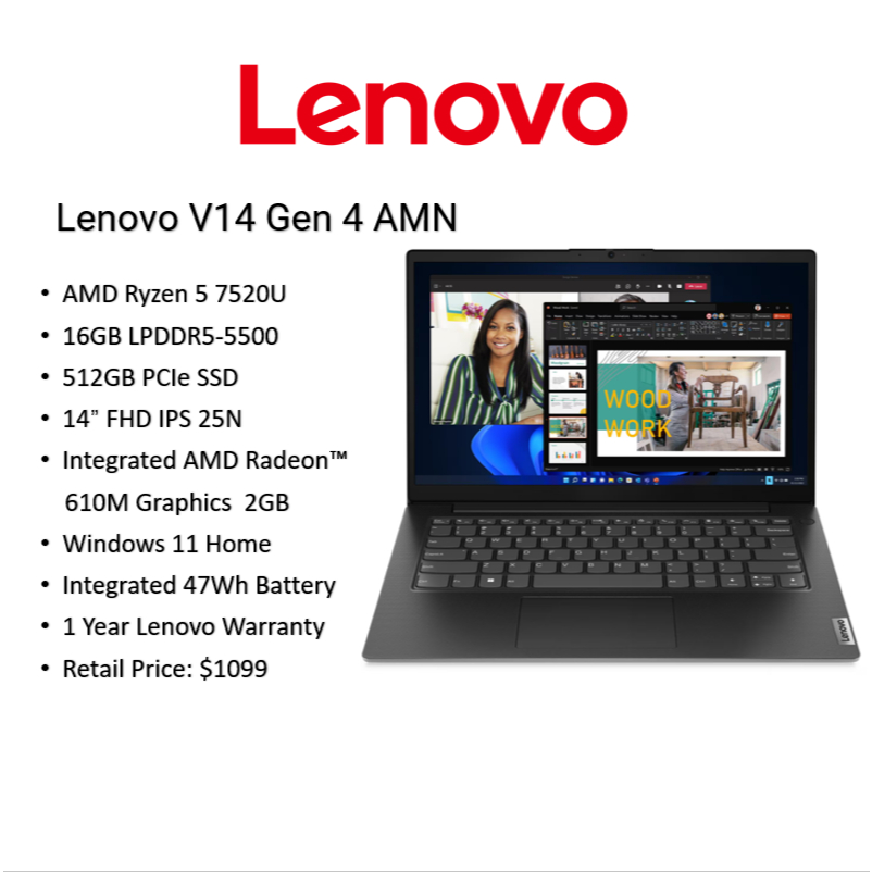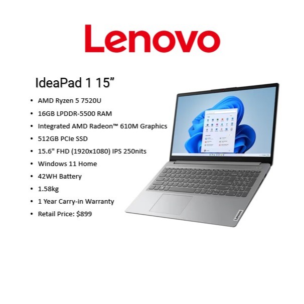 [Brand New] Lenovo IdeaPad 1 laptop/AMD R5-7520U/16GB/512GB/15.6FHD IPS/Win 11 Home/V14 14" FHD
