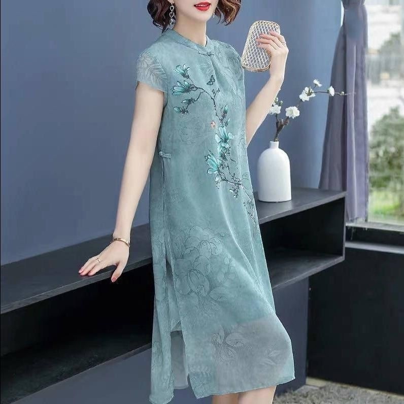 Fast Shipping Elderly Women Plus Size Dress Elegant and Stylish Cheongsam Middle-aged Women Summer Dress Mid-length Dress