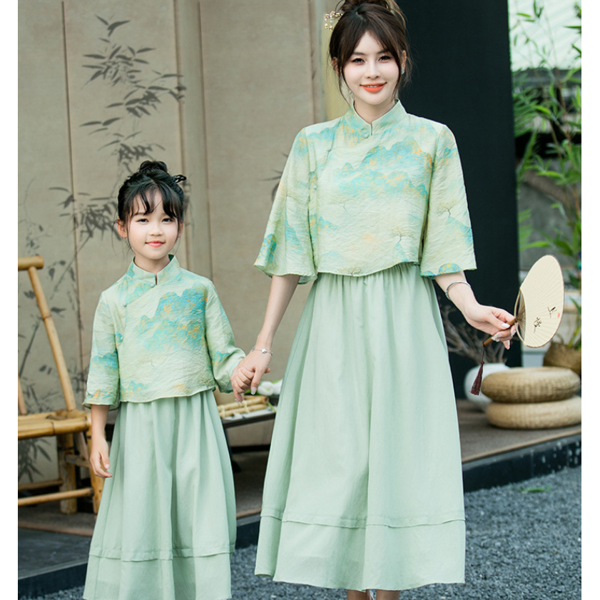 New Chinese Style Parent-Child Wear Short-Sleeved Men Women Hanfu Tang Suit Summer Modern Improved Cheongsam Chiffon Dress Mother-Daughter Dress Republic of China Retro Couple Wear Family Wear Family Three-
