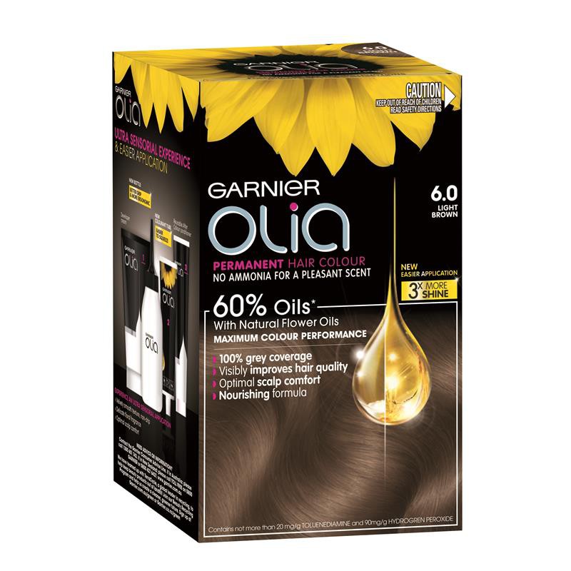 Garnier Olia Permanent Hair Colour 6.0 Light Brown-1st permanent colour powered Oil, not ammonia