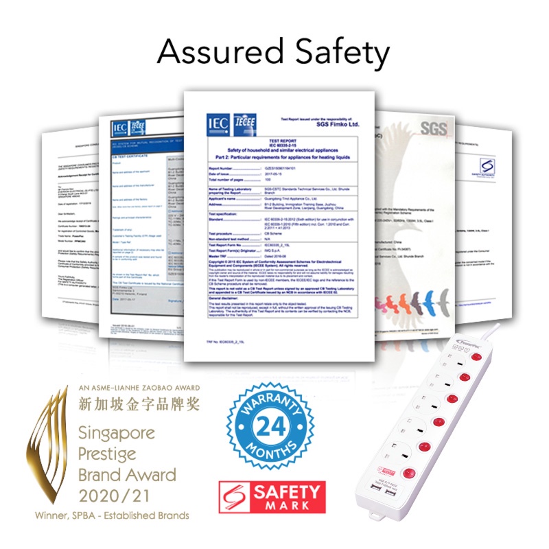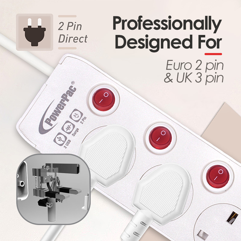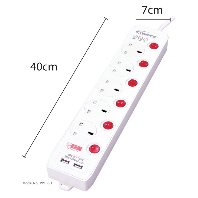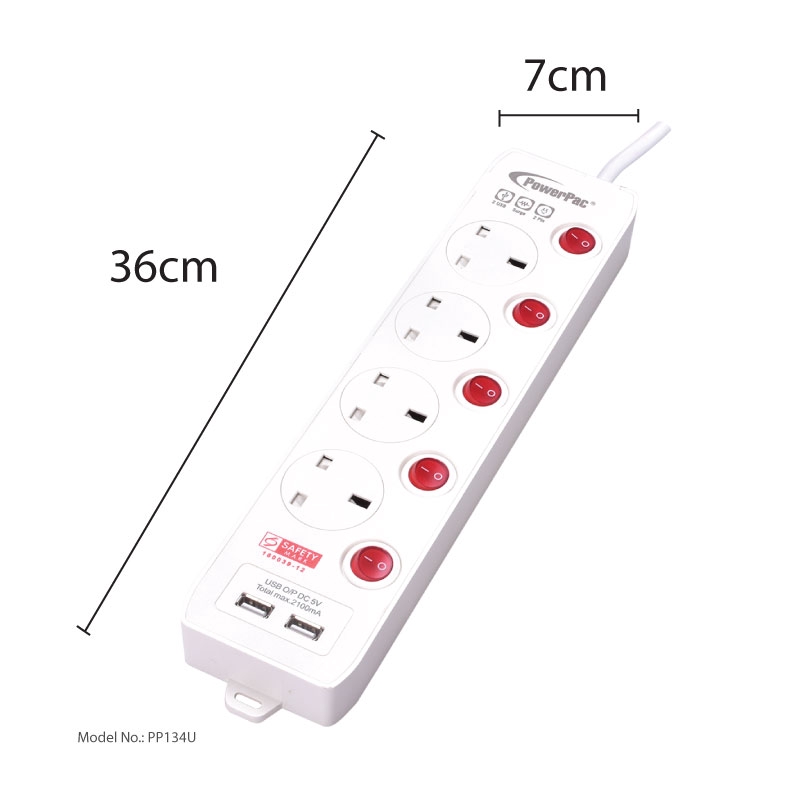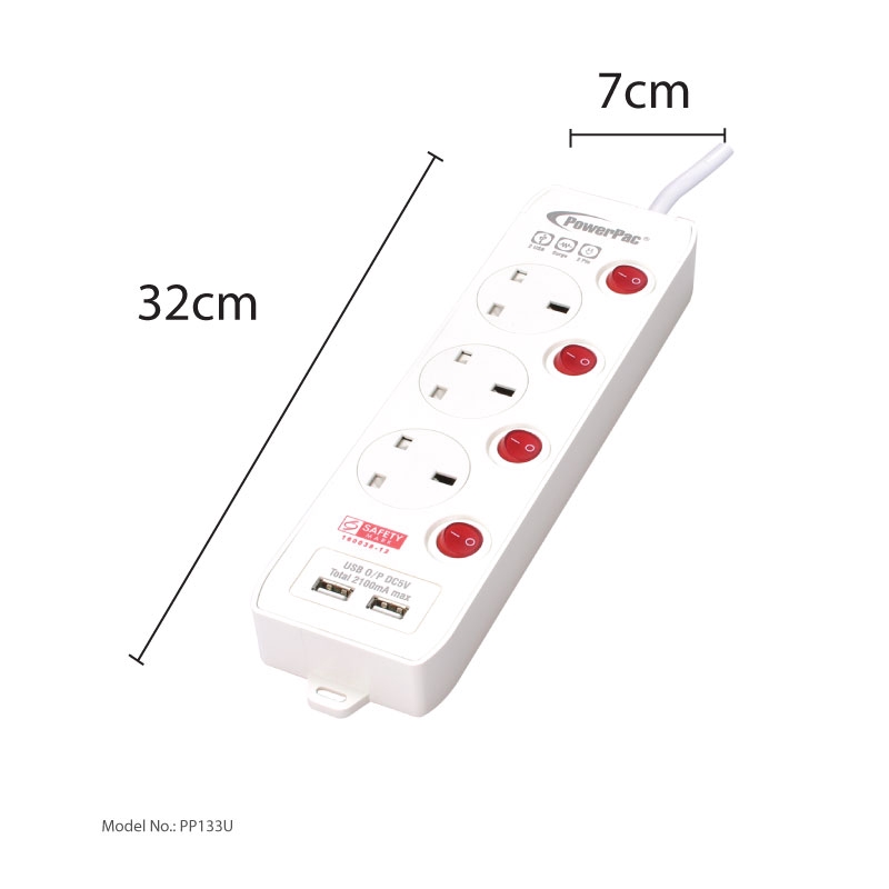 PowerPac Extension Cord, Extension Socket, Power Cord 3 Meter 3, 4, 5 way with Dual USB Charger(PP133U, PP134U, PP135U)
