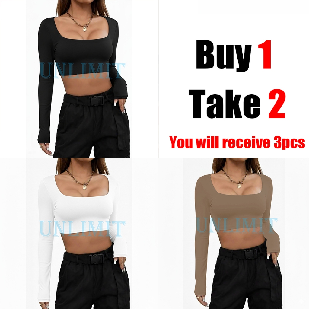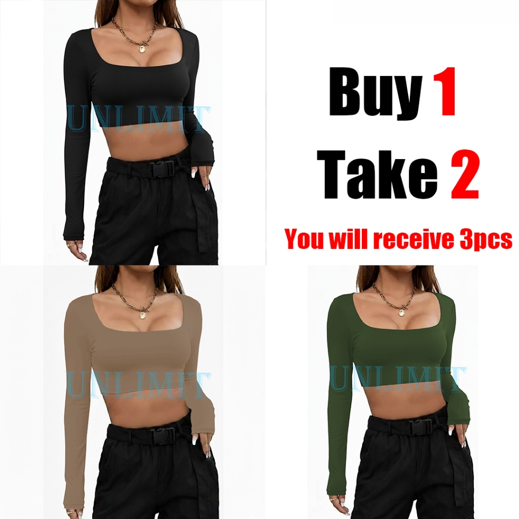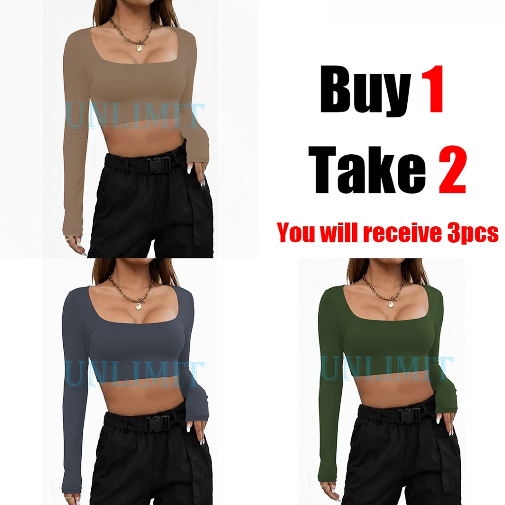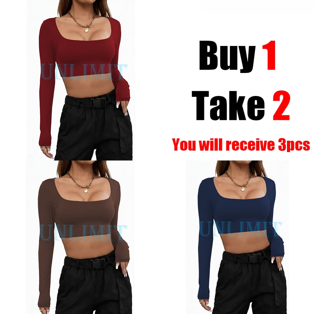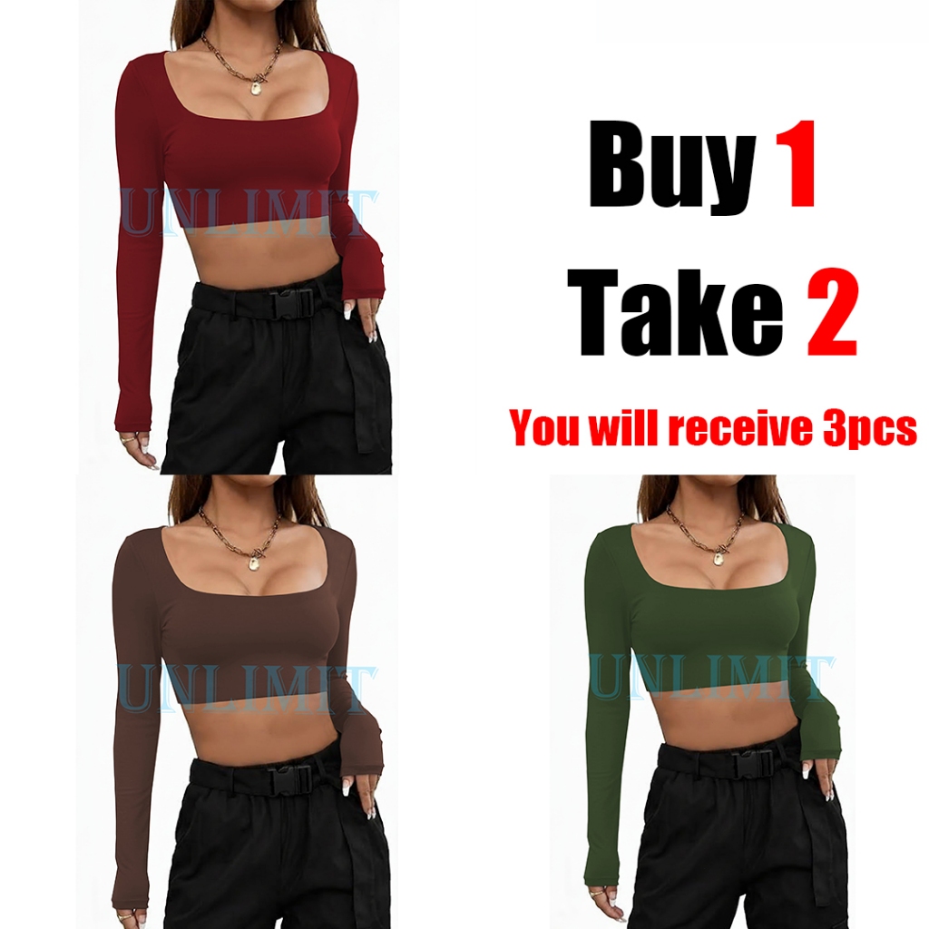 Buy 1&Take 2 Double Lining Square Neck Long Sleeves Top Body Hugging Top Cotton Spandex