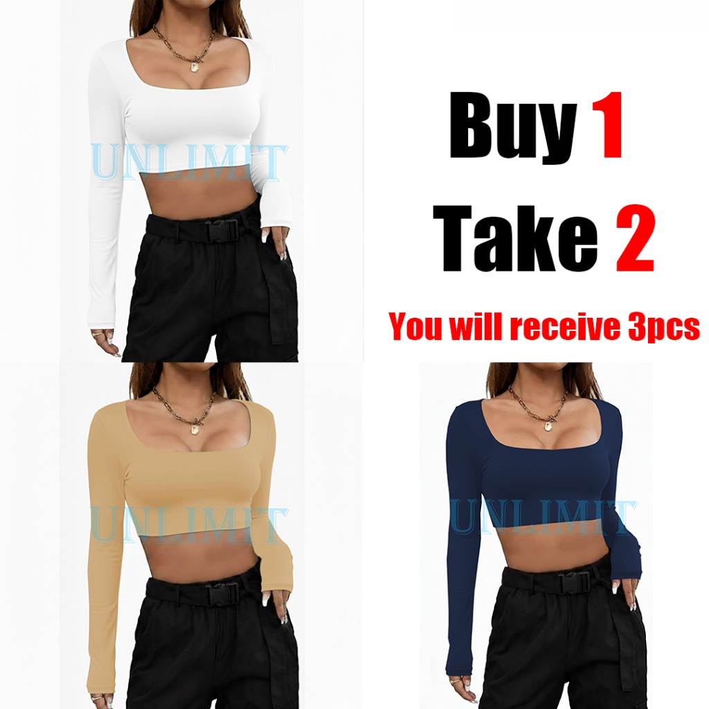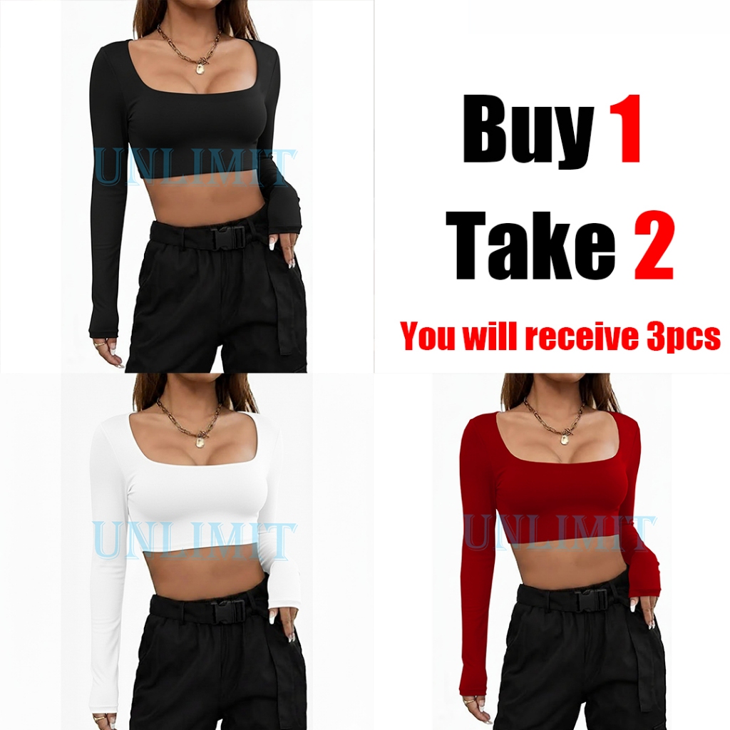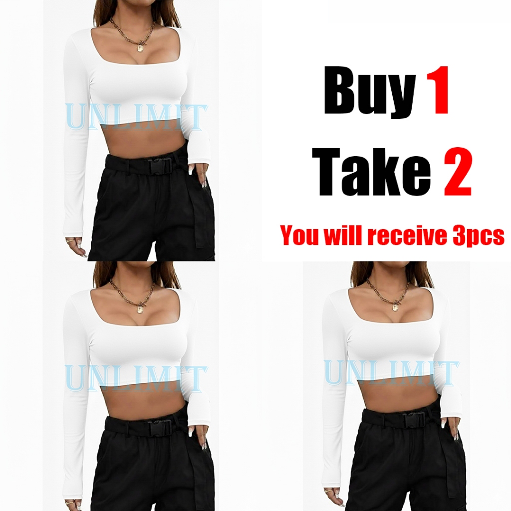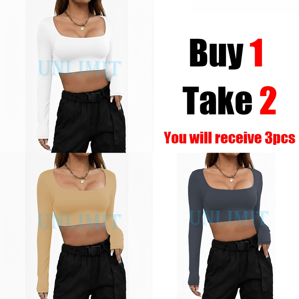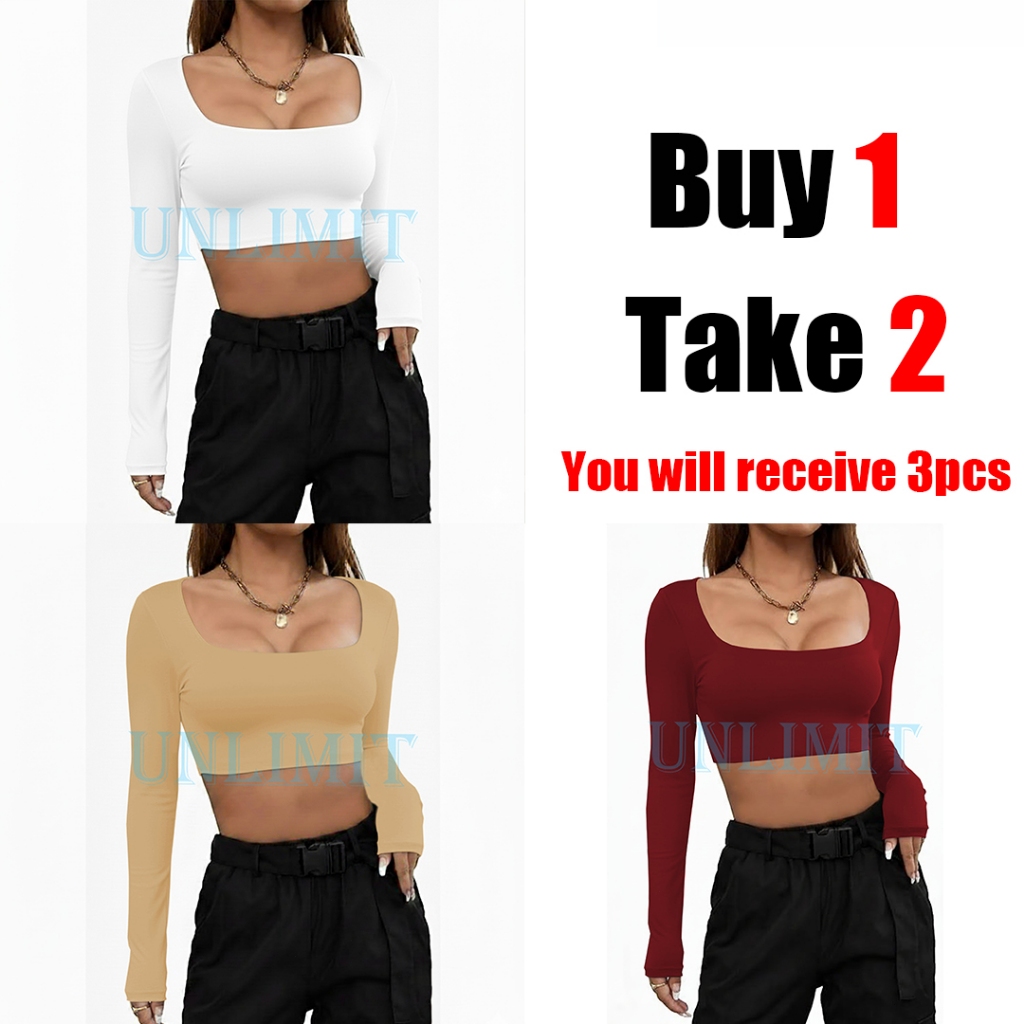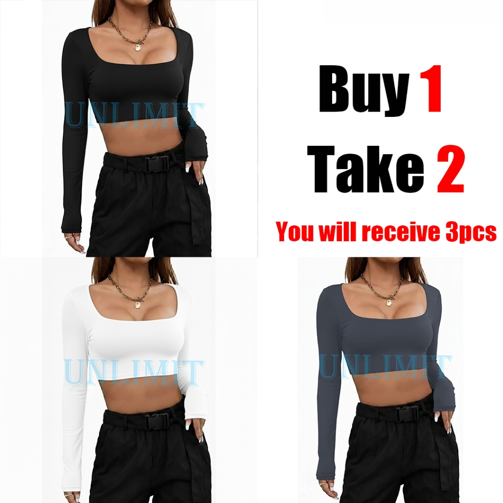 Buy 1&Take 2 Double Lining Square Neck Long Sleeves Top Body Hugging Top Cotton Spandex