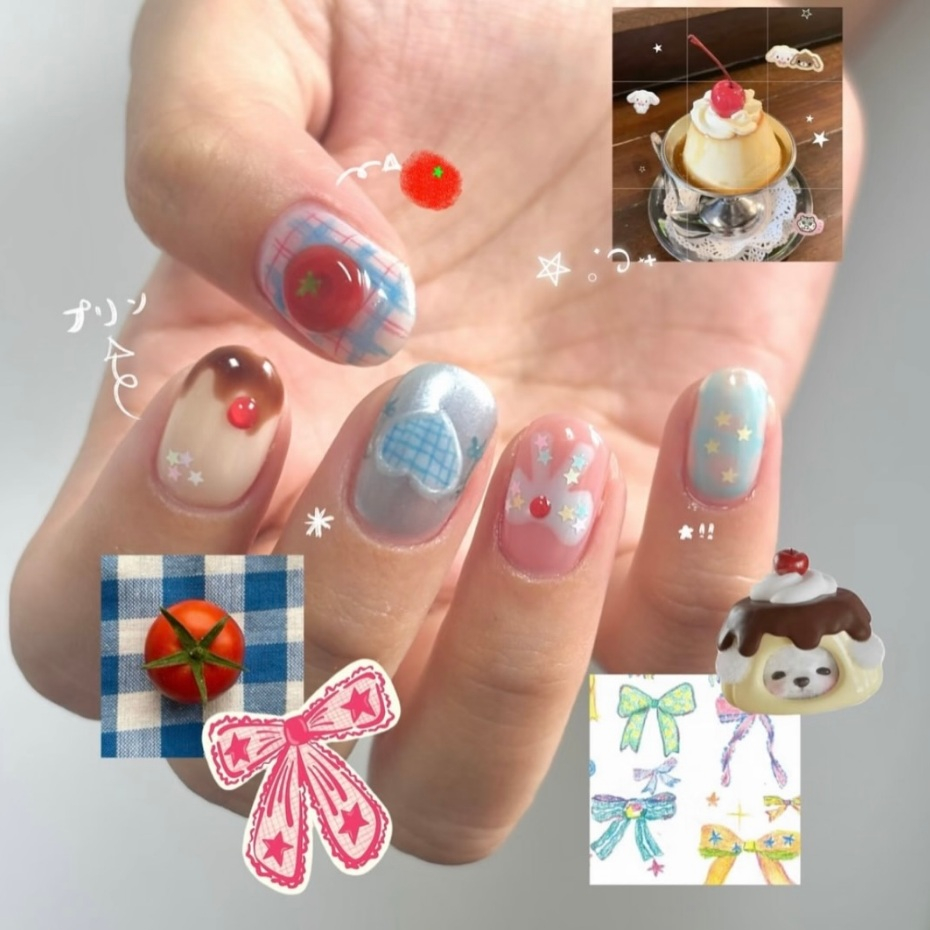 Pudding Puppy Inspiration Wear Nails ins Hand-Painted Short Tomato Silver Metal Manicure Patch Striped Cherry Manicure