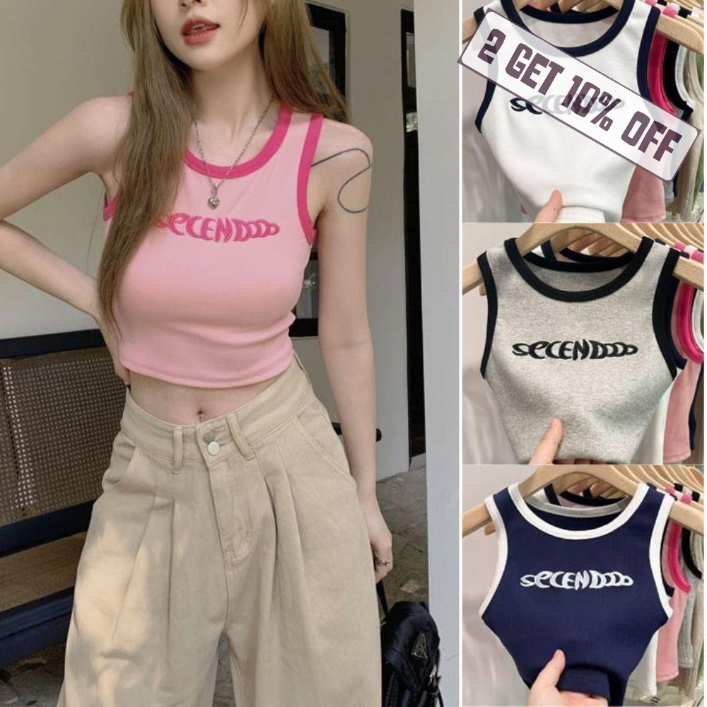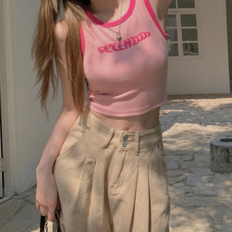 American style letter outer wear inner contrast color edge slim short sleeveless thin Women's vest T349