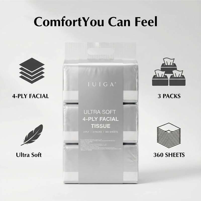 IUIGA Eco Ultra Soft 4-Ply Facial Tissues | 3 Packs (360 Sheets) | Unscented & Dye-Free | SG Stock