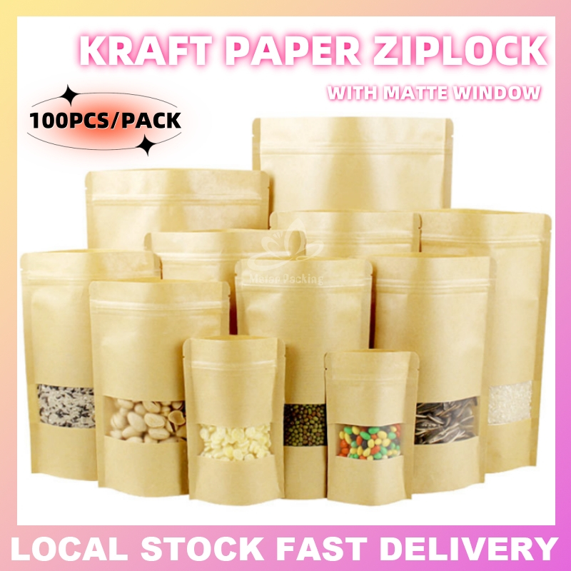 100PCS Kraft Paper Ziplock Zipper Stand Pouch for Gifts/Nuts/Cookies/Tea Kraft Ziplock Bag
