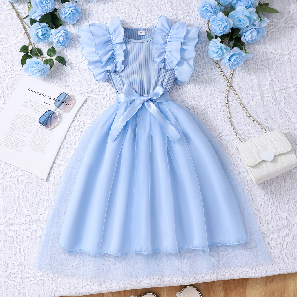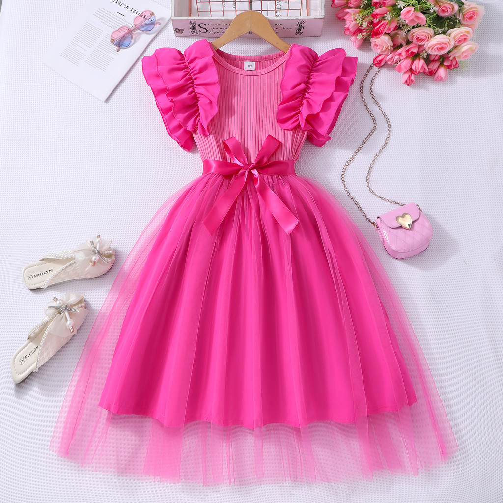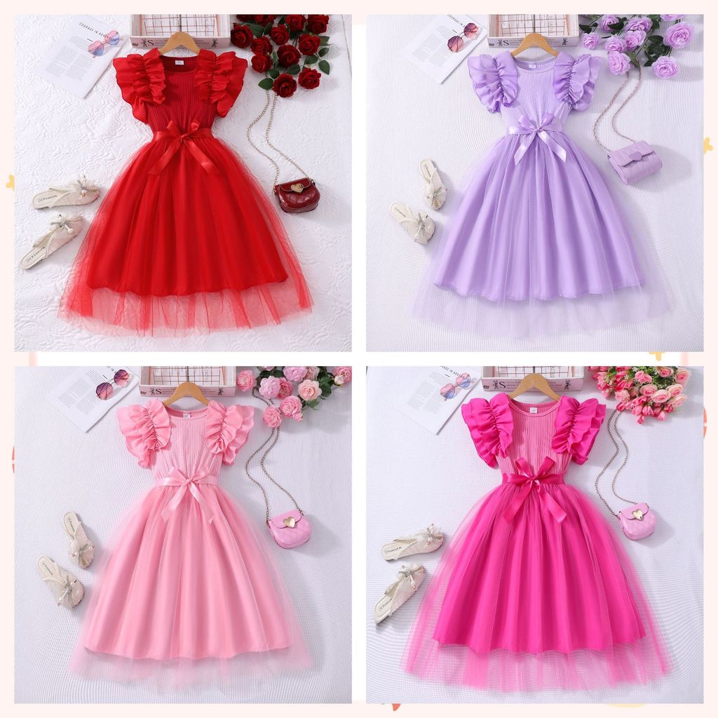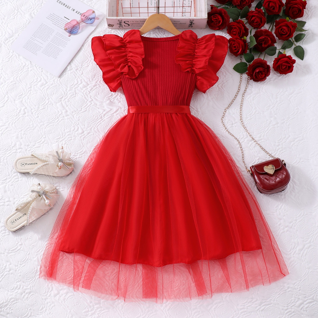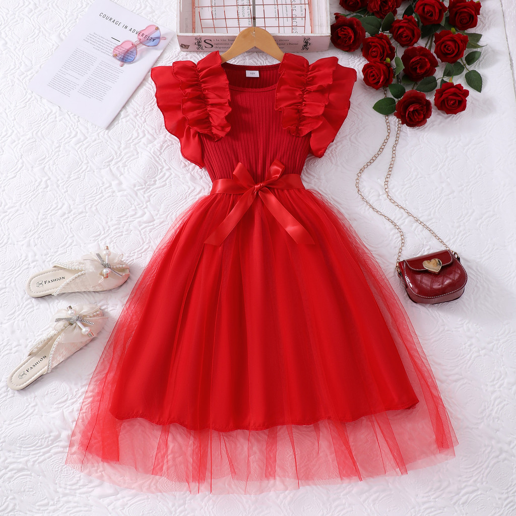 8-12 years old Kids Girls Dress Ruffle Sleeves Red Dress for Christmas New Year Birthday Party Korean Style