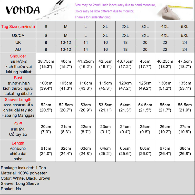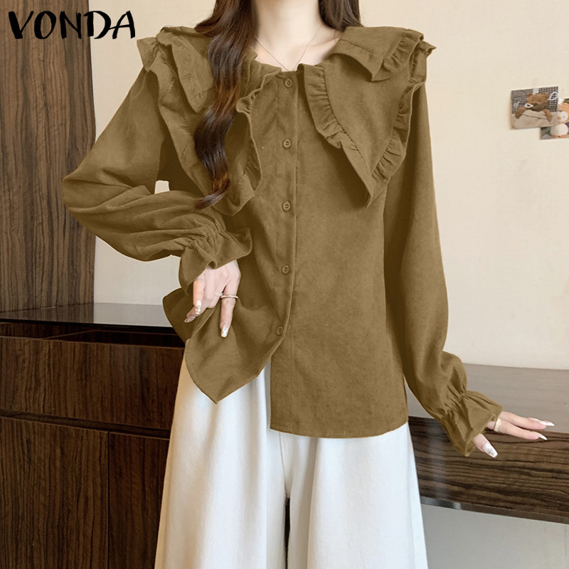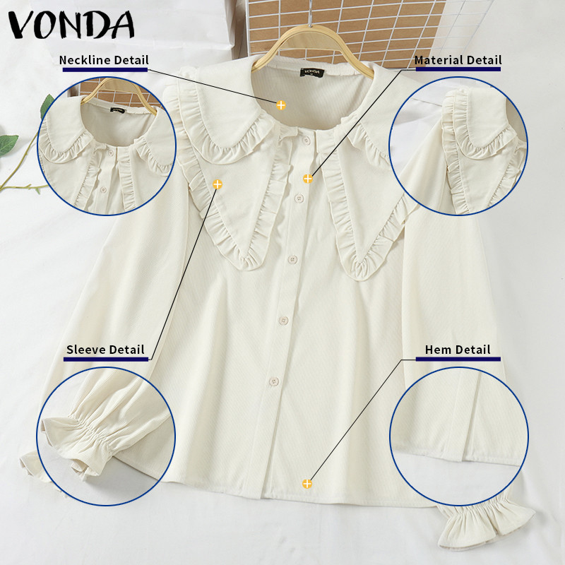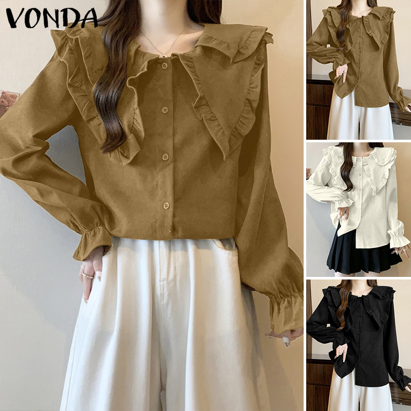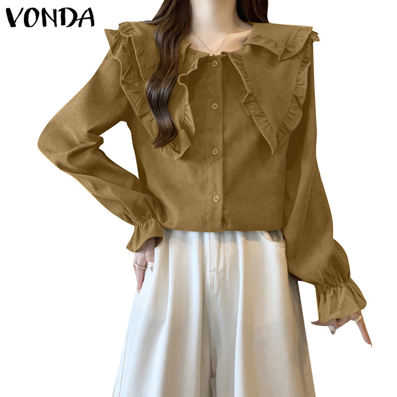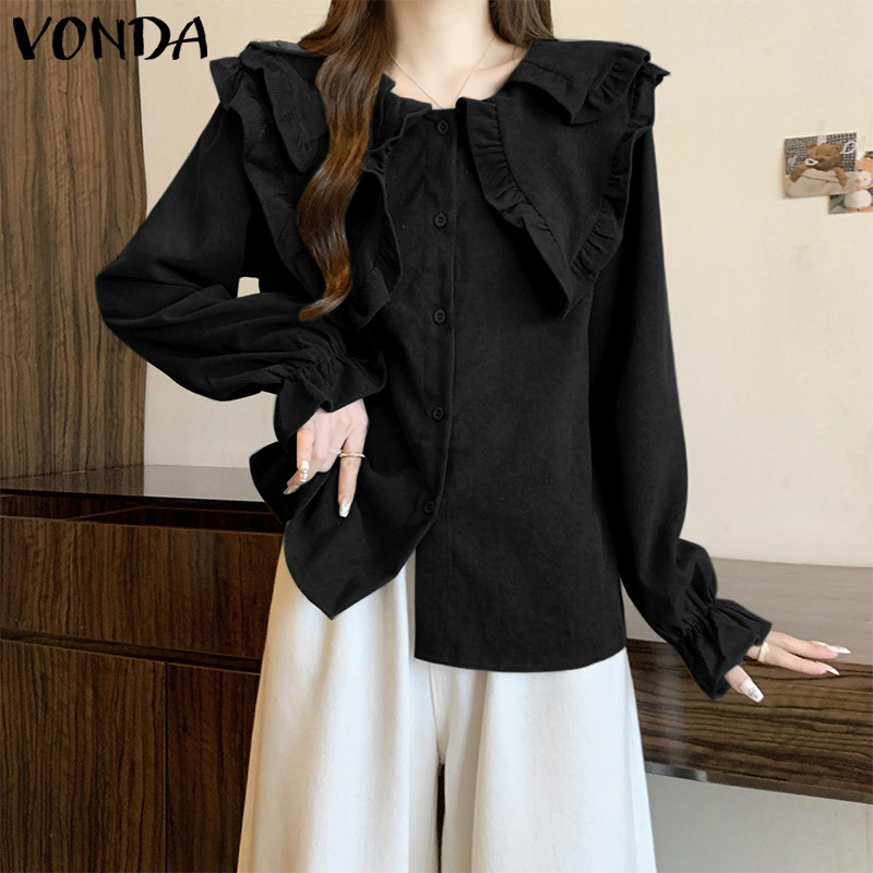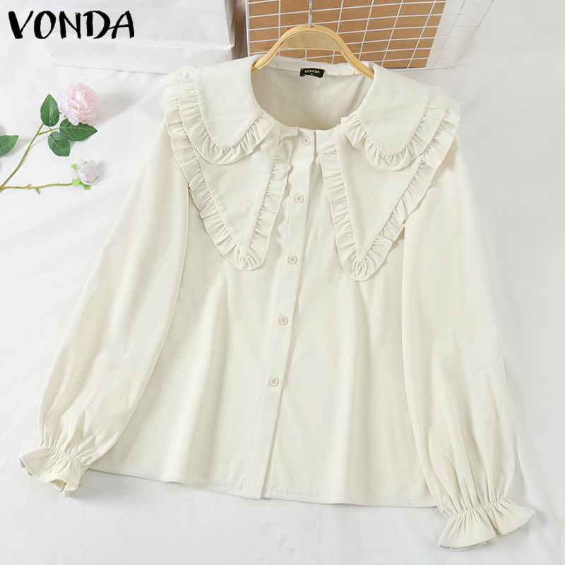 VONDA Women Korean Casual Doll Collar Loose Long Sleeve Blouse