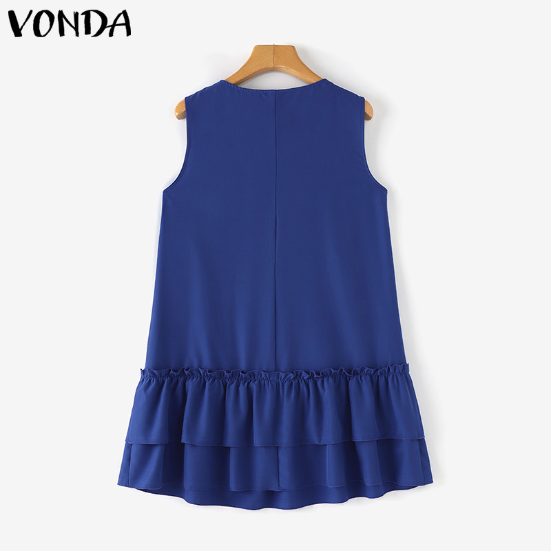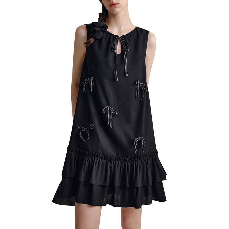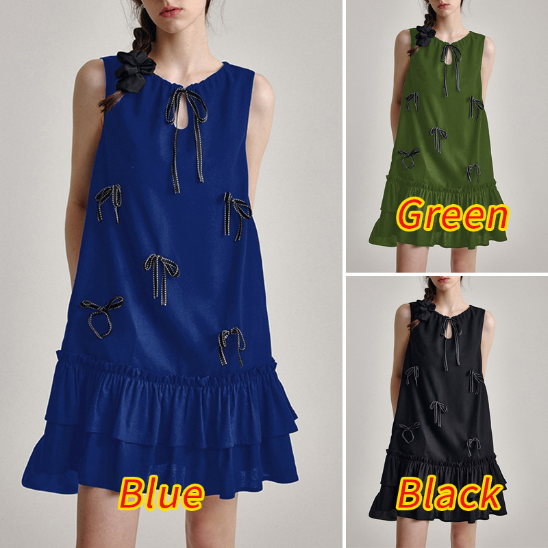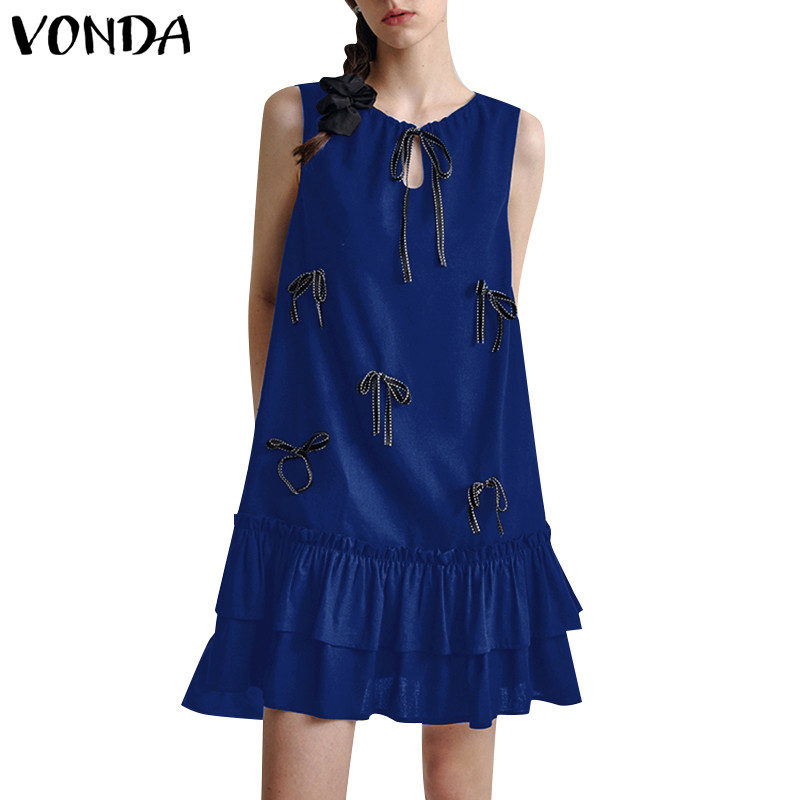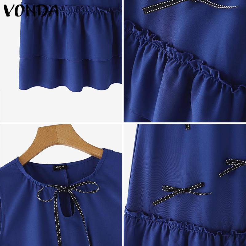 VONDA Women Korean Sweet Style Crew Neck Bowknot Decorate Ruffles Dresses