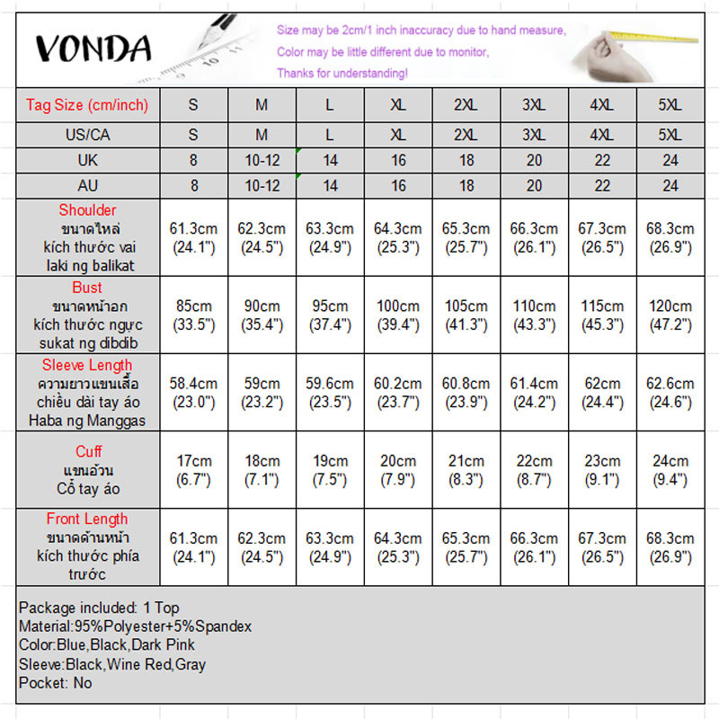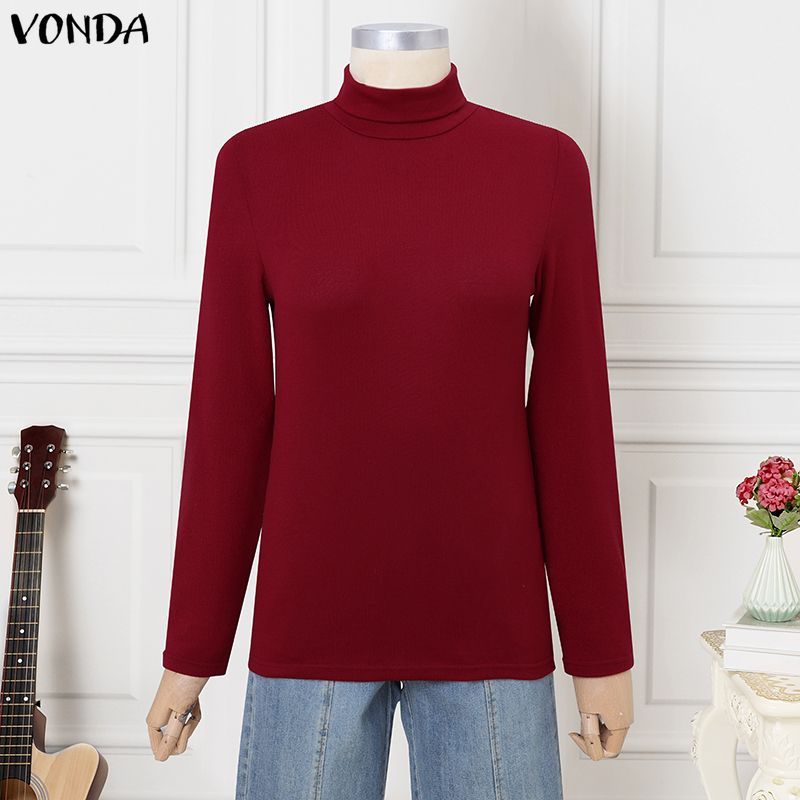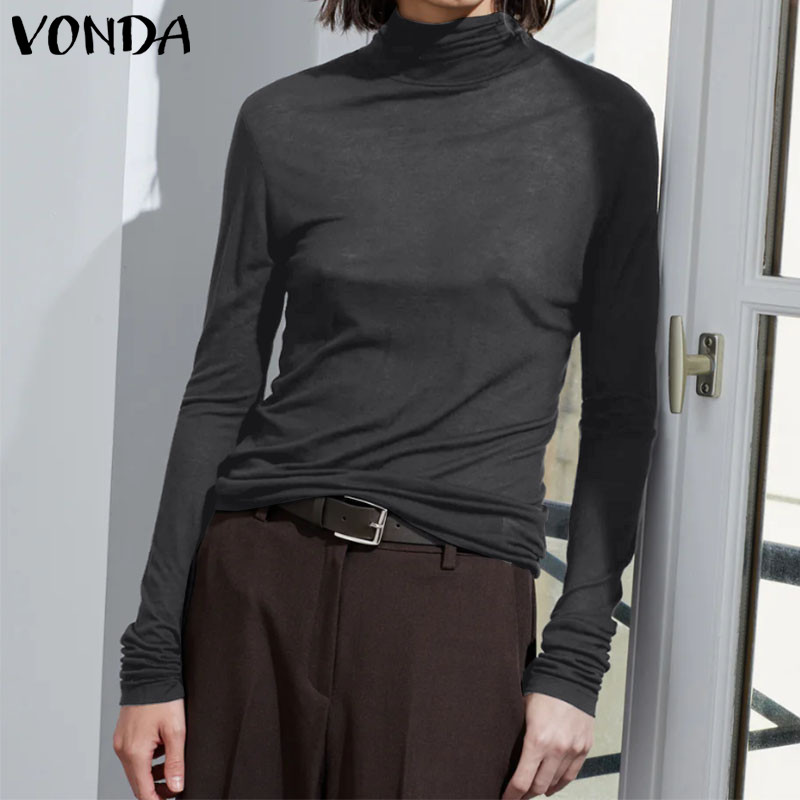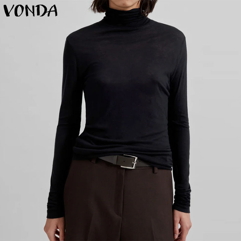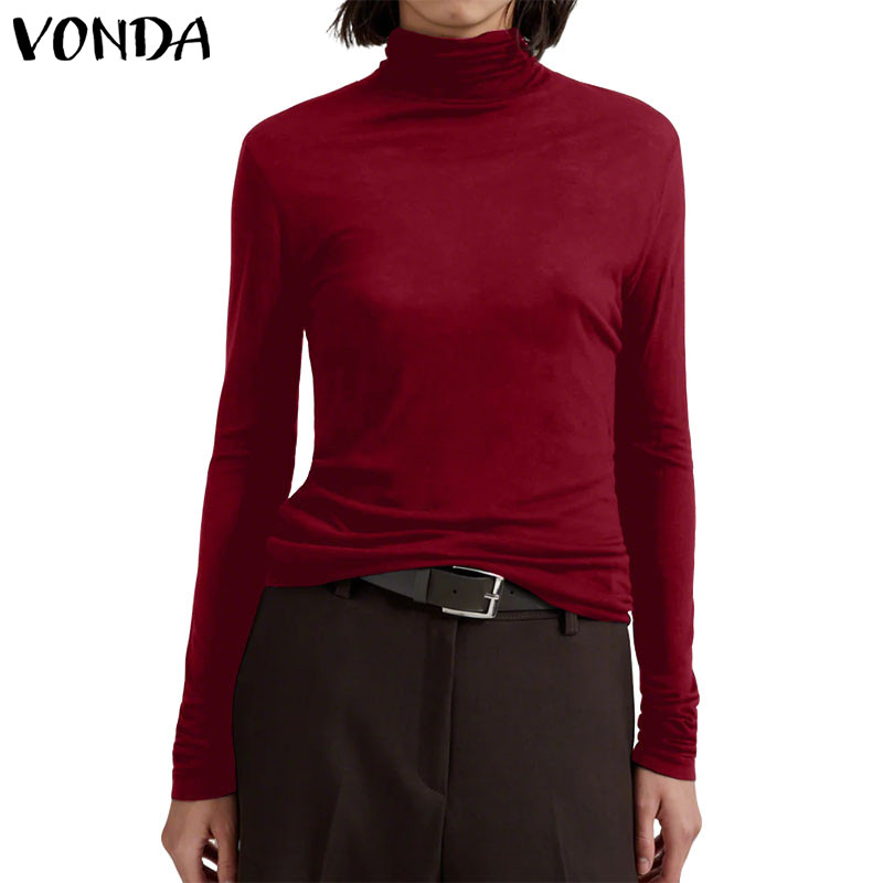 VONDA Women's High-Neck Knitted Elastic Long Sleeve Base Layer T-Shirt