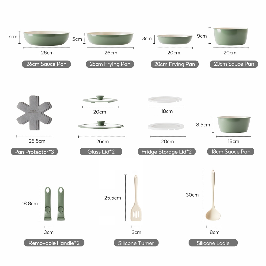 Redchef Nonstick Green Ceramic Rock Cookware Set Handle Removable 5Pcs No PFAS& PTFE& PFOA Suitable for All Stoves