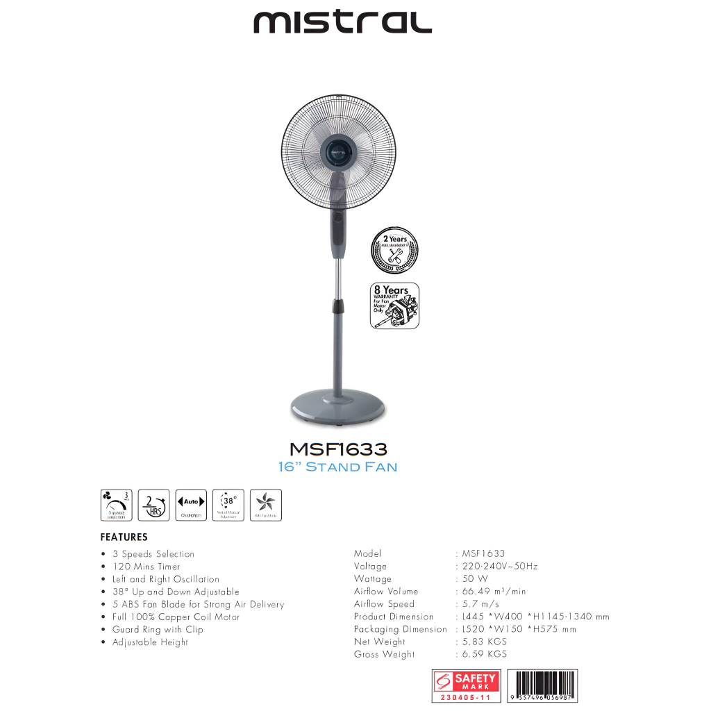 Mistral 16" Stand Fan MSF1633 // 3 Speed Selection, 120 Mins Timer, 8 Years Warranty on Motor