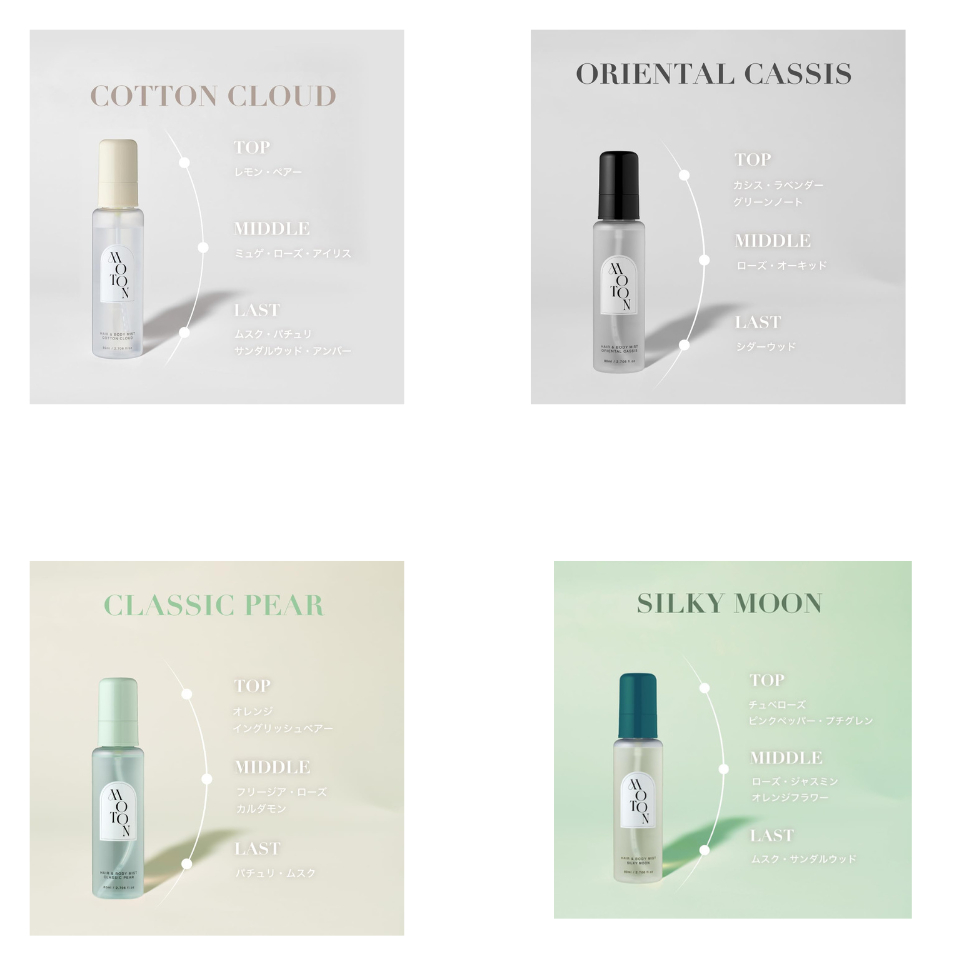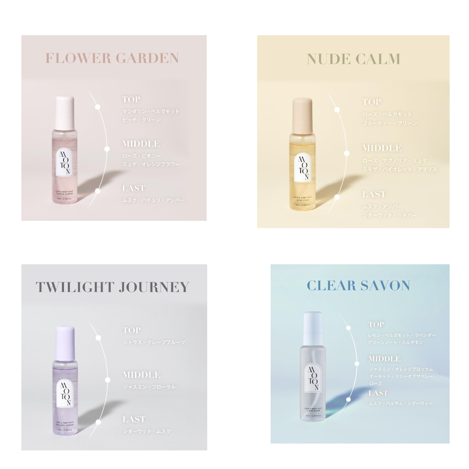 【Direct from Japan】MOTON Hair & Body Mist 80mL – 2-in-1 Fragrance Spray, Moisturizing Formula, 8 Scents: Flower Garden, Nude Calm, Twilight Journey, Clear Savon,Cotton Cloud, Oriental Cassis, Classic Pear, Silky Moon