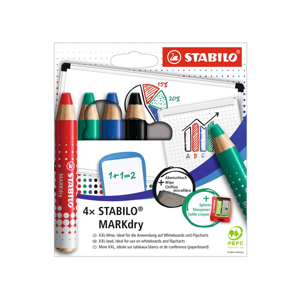 4x STABILO MARKdry for whiteboard - Red, Green, Blue & Black + Free Wipe + Free Sharpener - Washable, Safe & Non-Toxic
