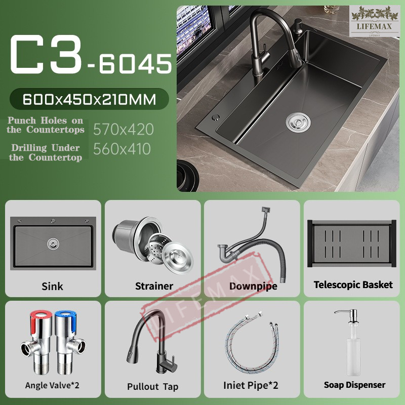 [SG Seller]Waterfall Nano Kitchen Sink 304 Stainless Steel Single Basin Bowl Tank Pullout Faucet Tap(3 Colors Optional)
