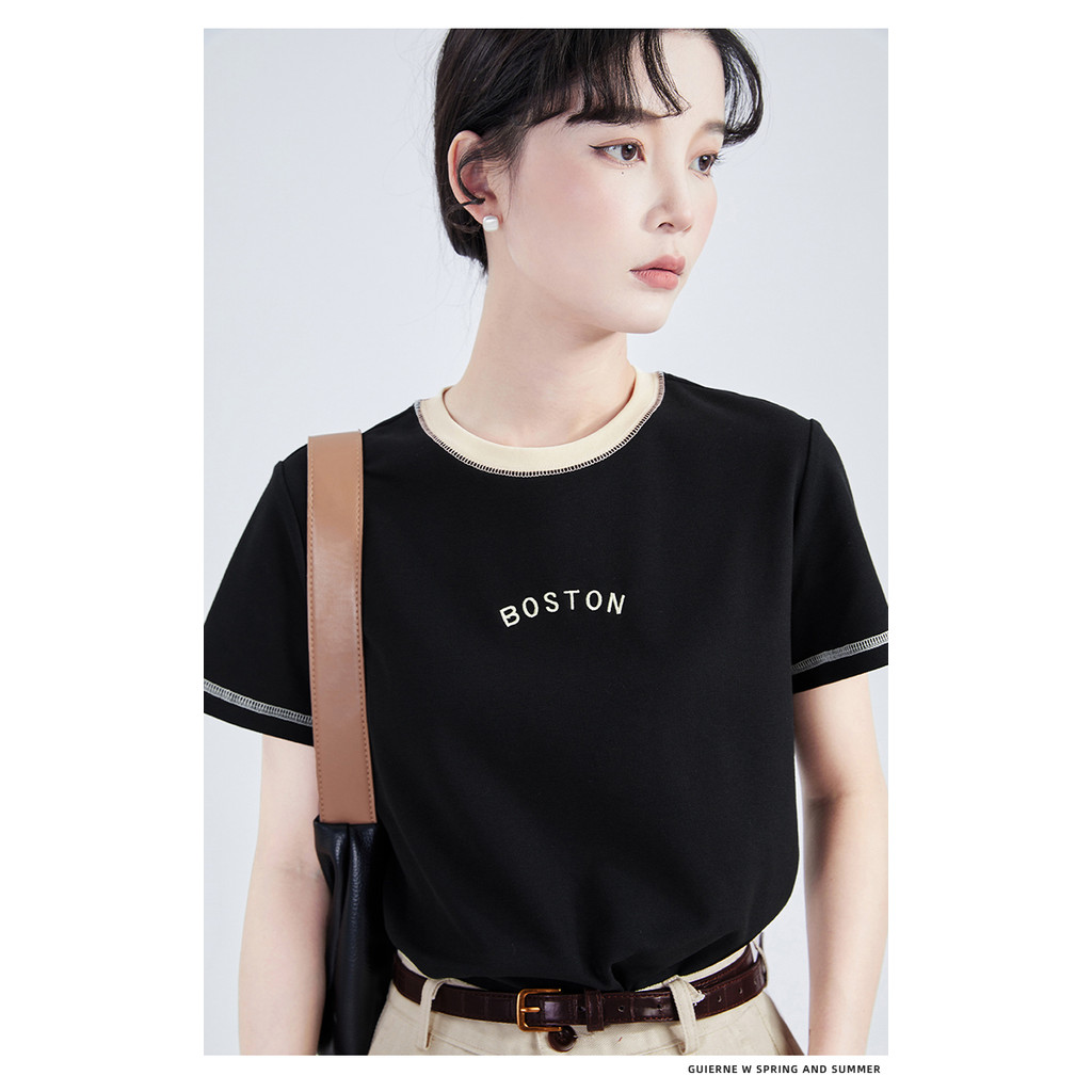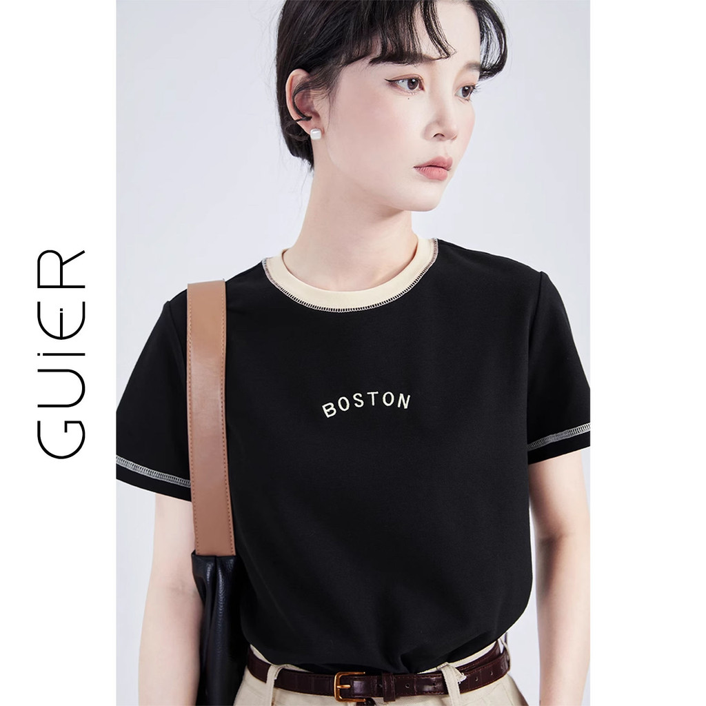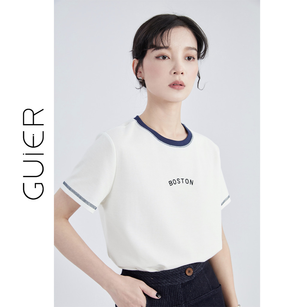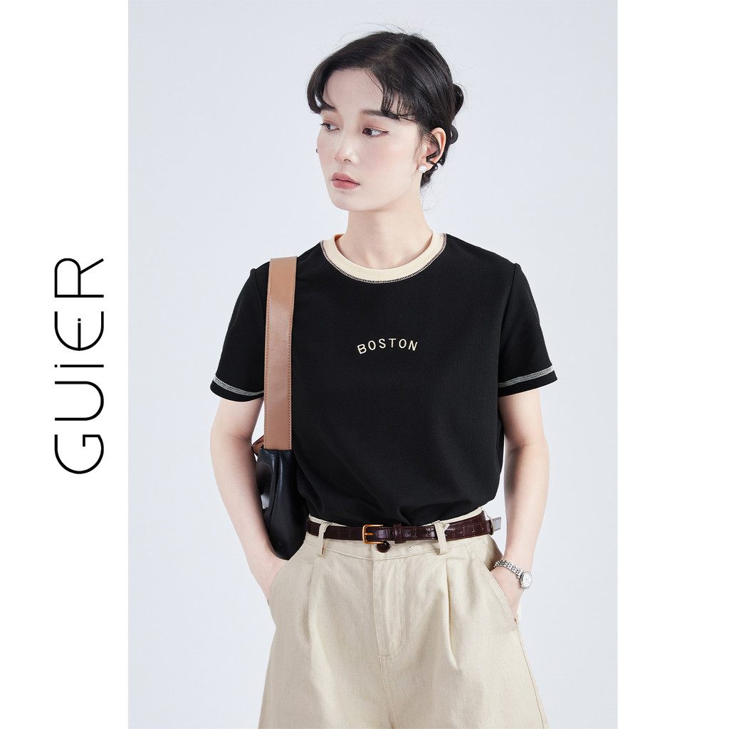 GUIER Round Neck Embroidered Genuine Shoulder All-Match Short-Sleeved t