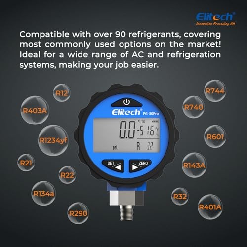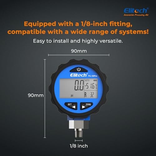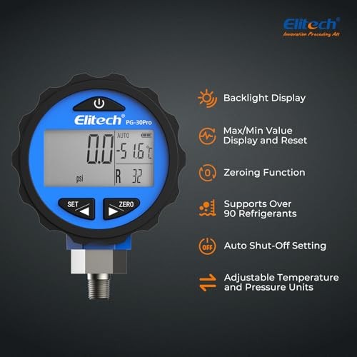 【Direct from Japan】Elitech PG-30Pro Digital Refrigerant Pressure Gauge with Backlight 87+ Refrigerant 0-500 PSI 1/8 NPT, Compatible with Manifold Gauges (Blue)