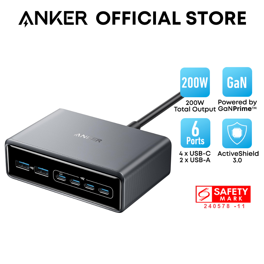 Anker Prime Charger 200W Fast Charging Station 6-Port GaN USB C Charger Desktop Multi Plug A2683