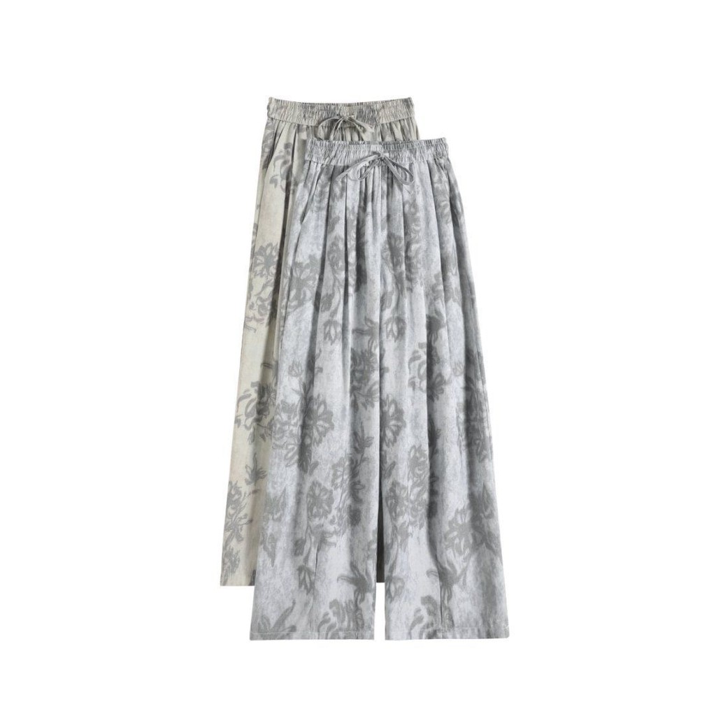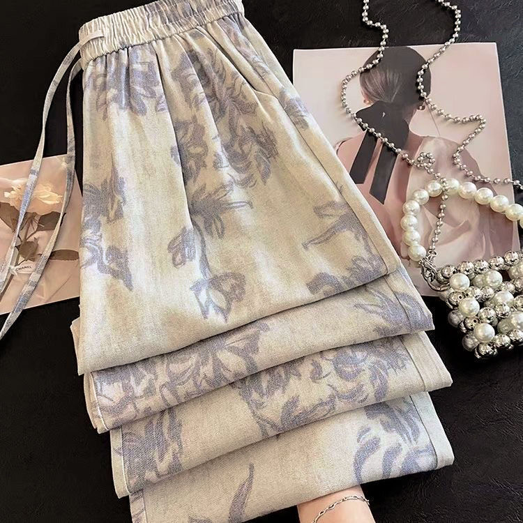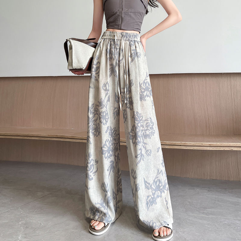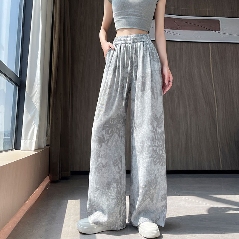 Grey Printed Ice Silk Pants Women's Summer Thin Drawstring Wide-leg Pants