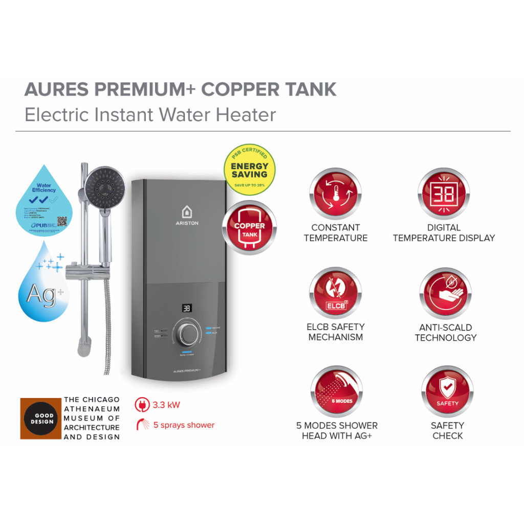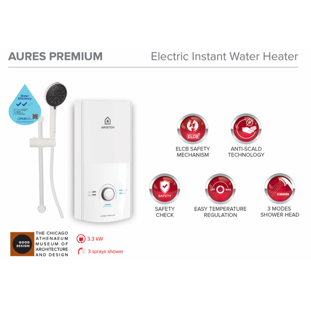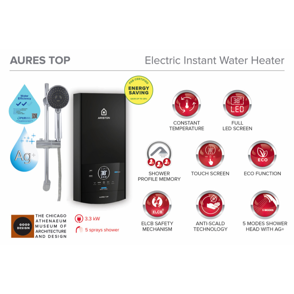 (Installation Available) Ariston Aures Instant Water Heater // Top, Premium (Rain shower, Copper Tank), Aures Easy