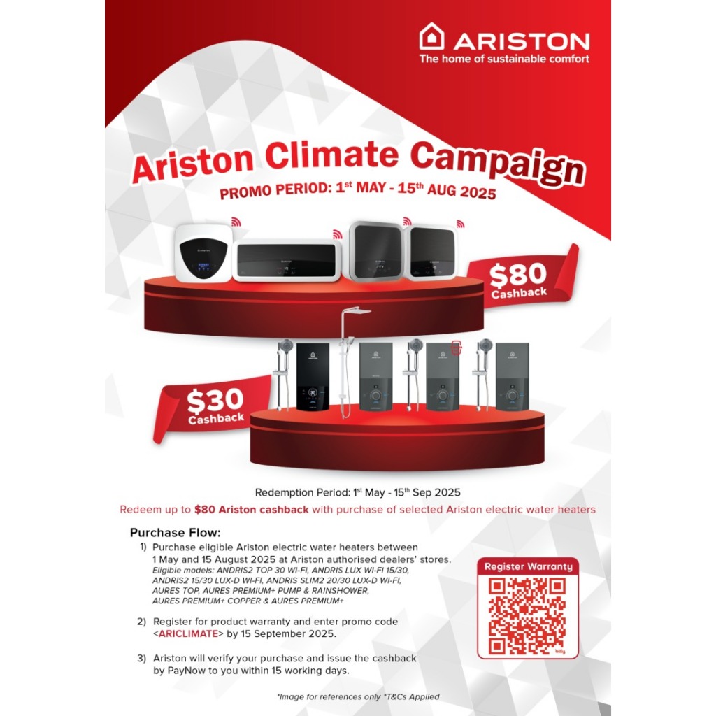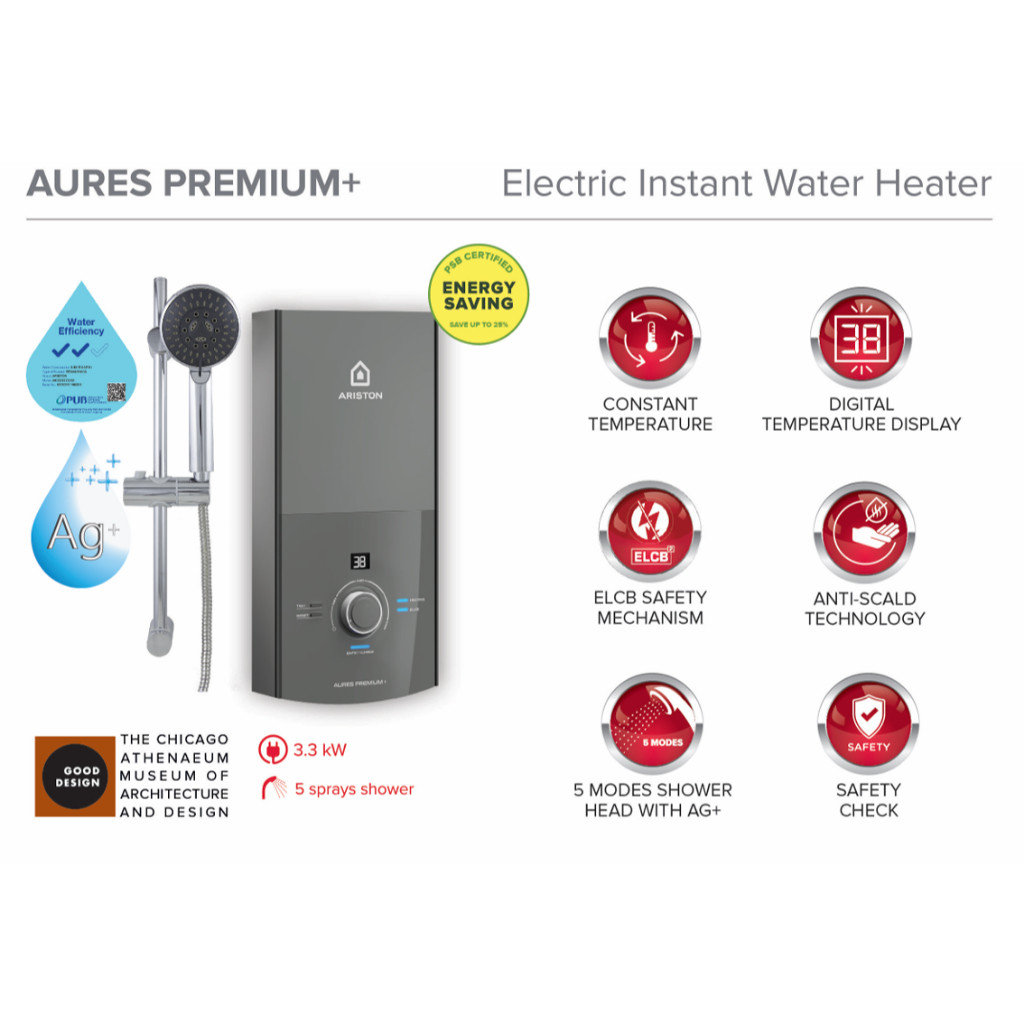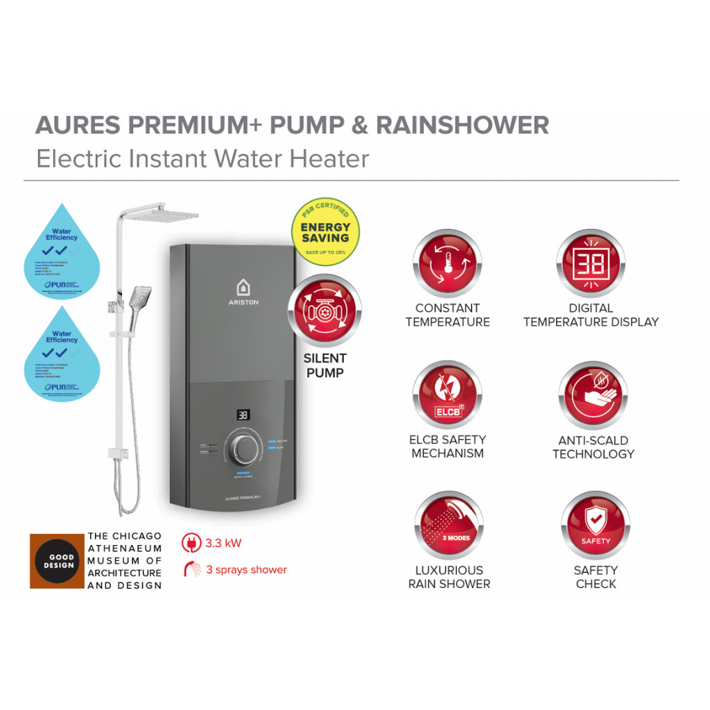 (Installation Available) Ariston Aures Instant Water Heater // Top, Premium (Rain shower, Copper Tank), Aures Easy