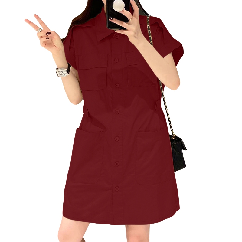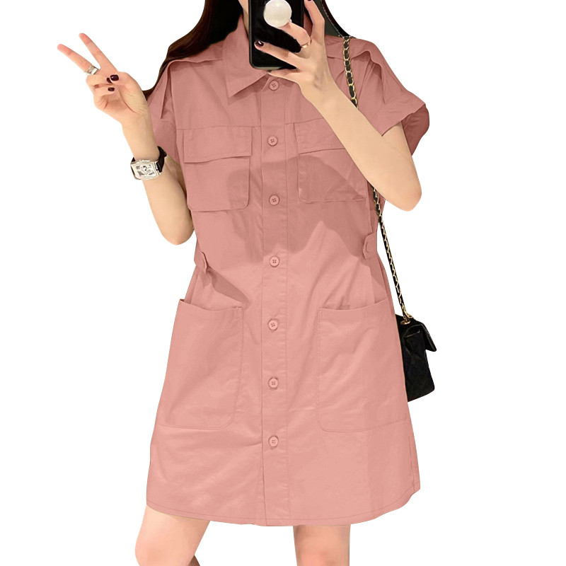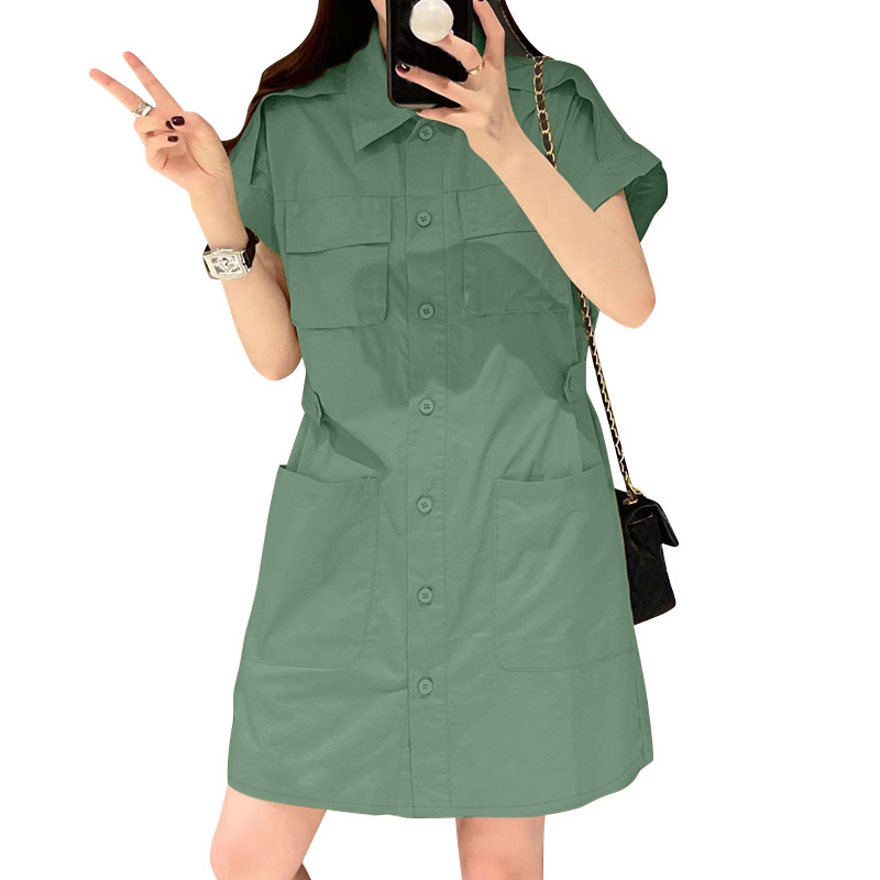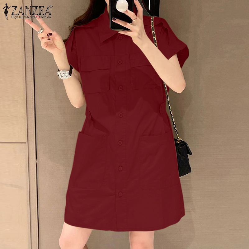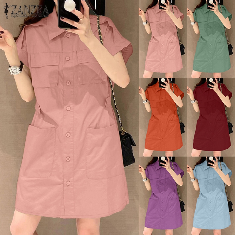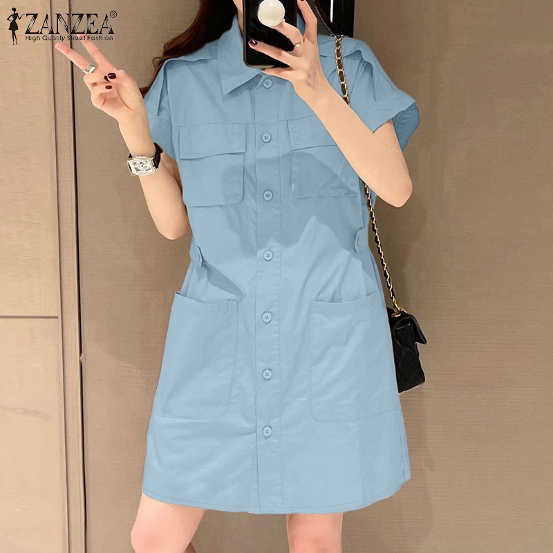 ZANZEA Women Korean Shirt Collar Short Sleeve Pocket Loose Dresses