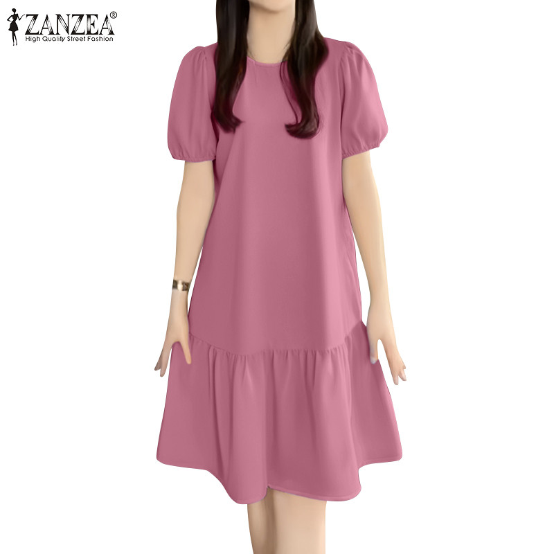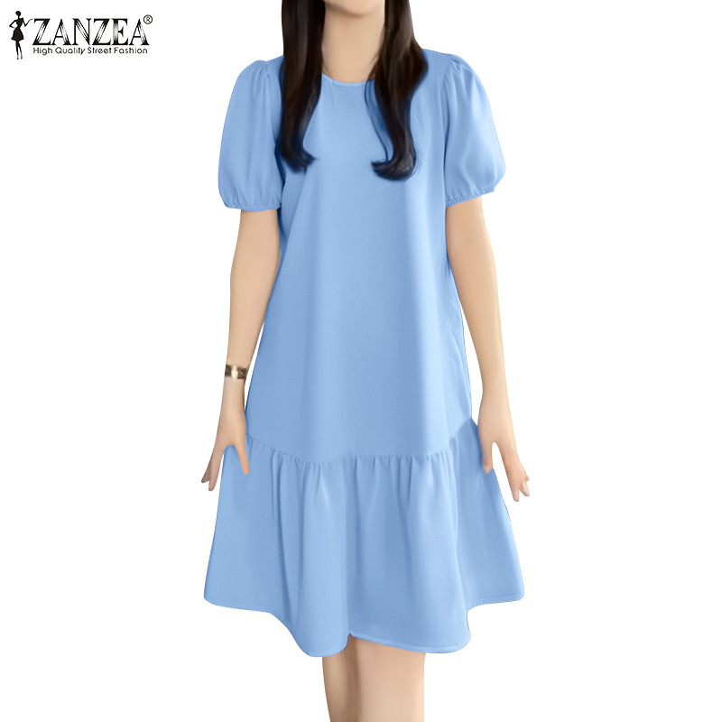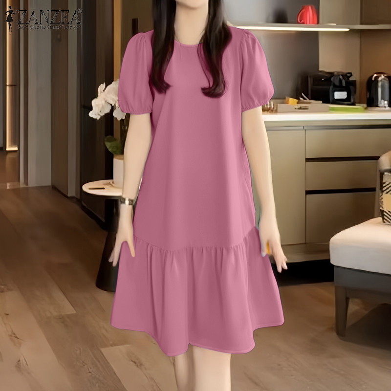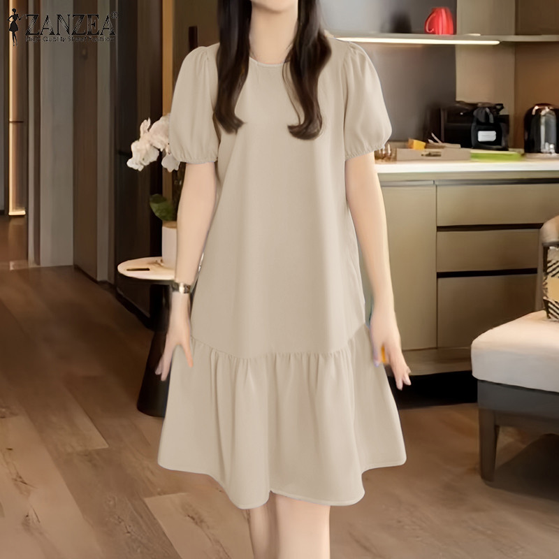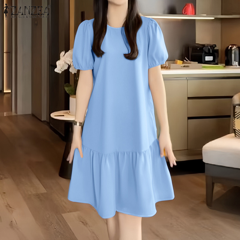 ZANZEA Women Korean Leisure Short Sleeve Puff Sleeve Vacation Lotus Fish Tail Dress