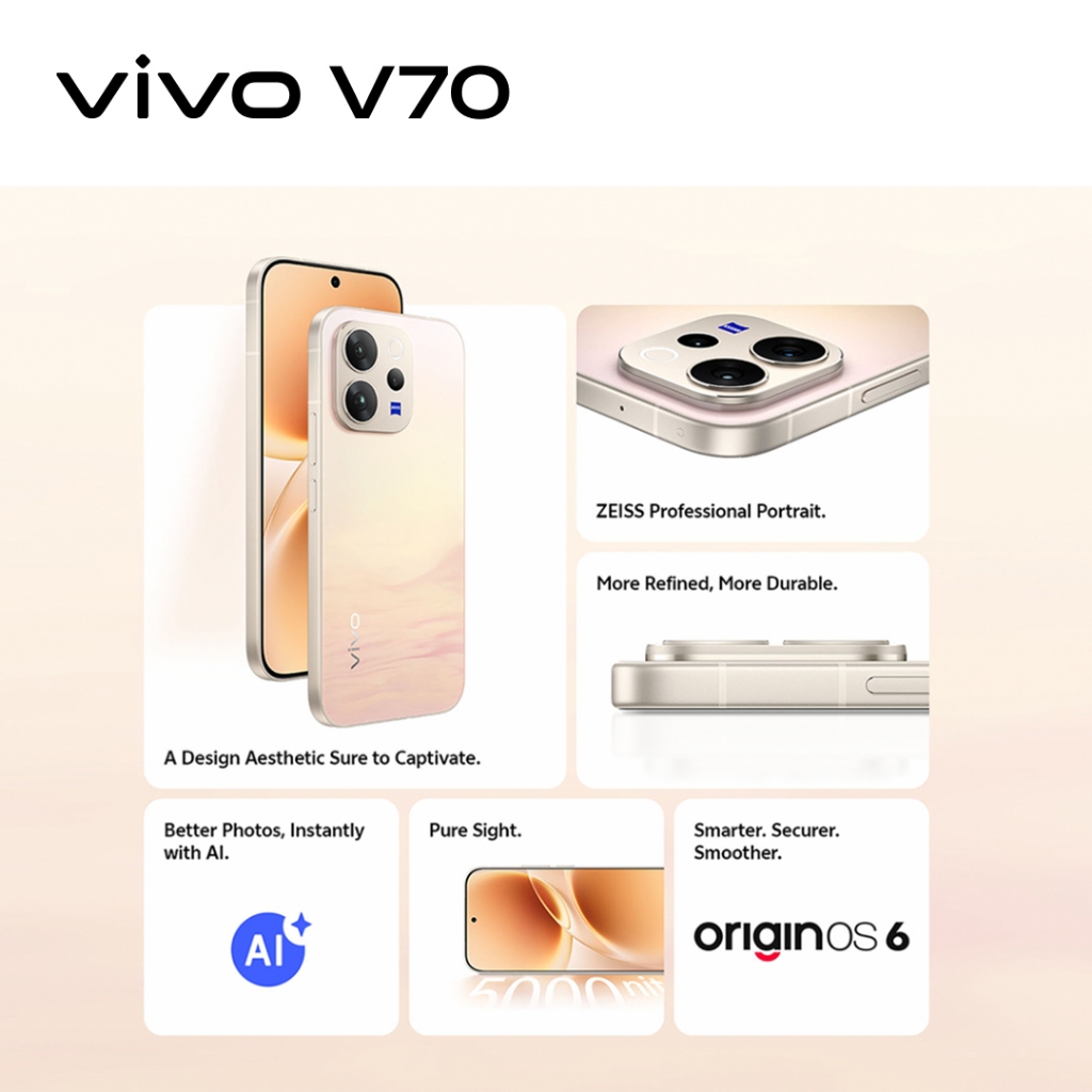 vivo V70 5G 12GB+12GB Extended RAM + 256GB | eSIM | 50MP Cameras | 6500 mAh | 90W Flash Charge | 2 Years Warranty