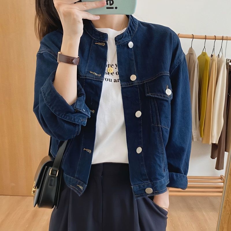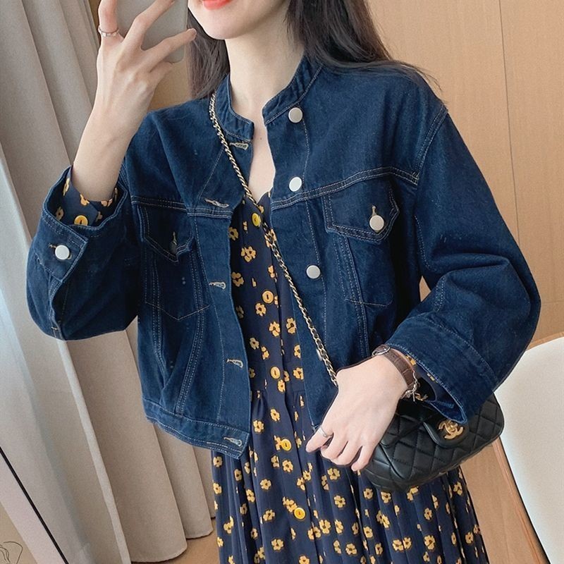 Women's Washed Denim Jackets New Retro Long-sleeved Short Fashion All-match Stand-up Collar Jean Coats