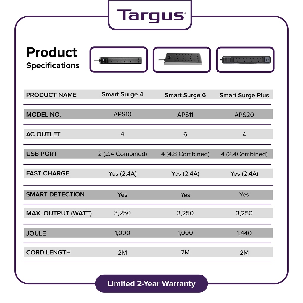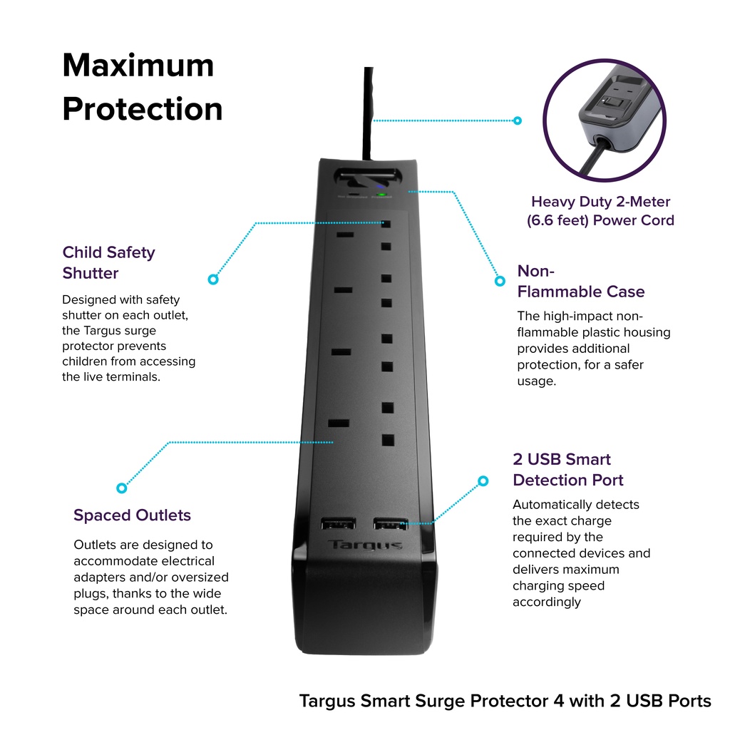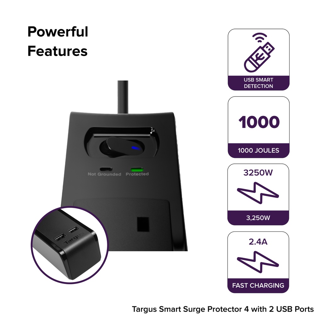 Targus Smart Surge Protector 4 Outlets - Dual Port USB, 2M Power Extension Socket, Singapore Safety Mark, 2 Yrs Warranty