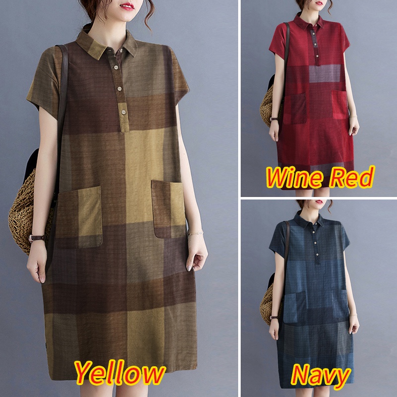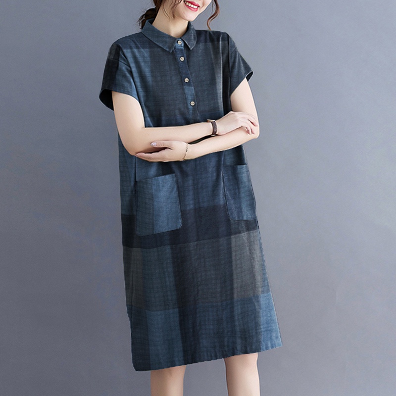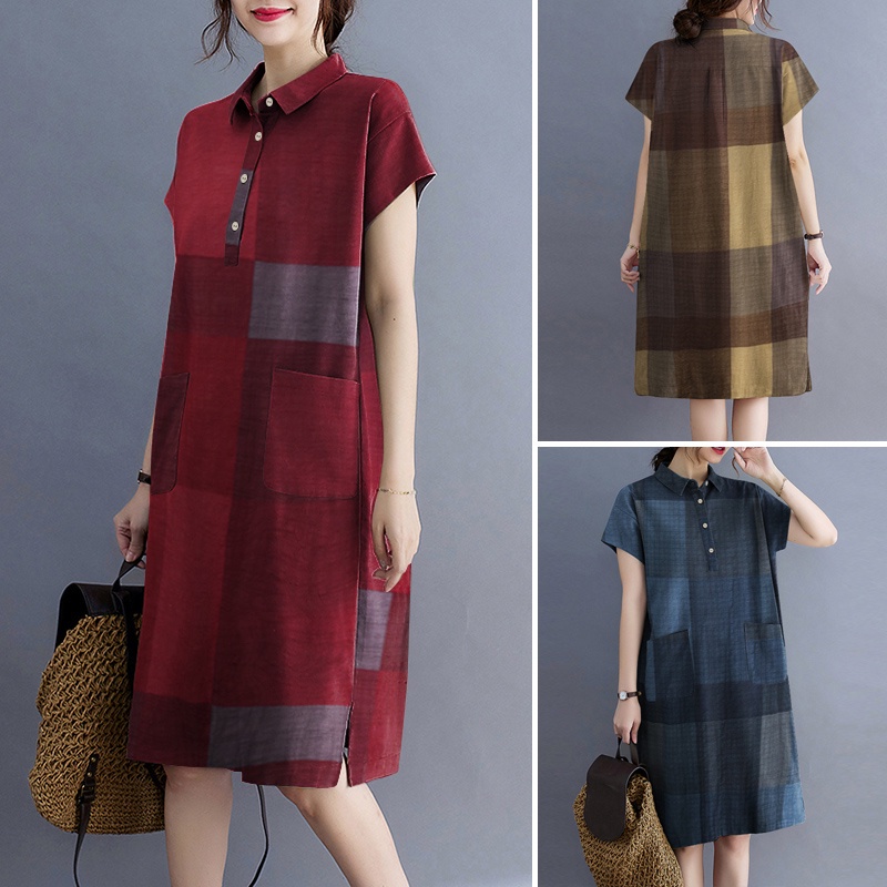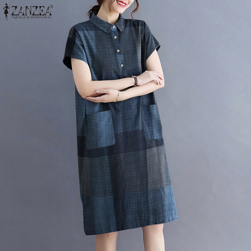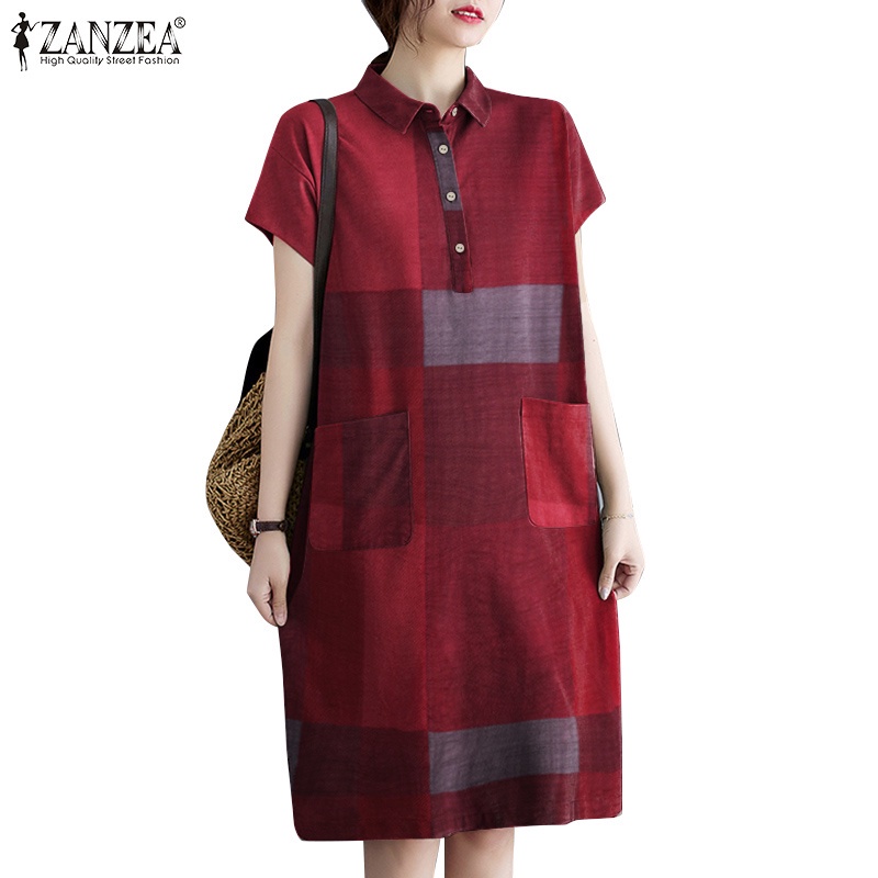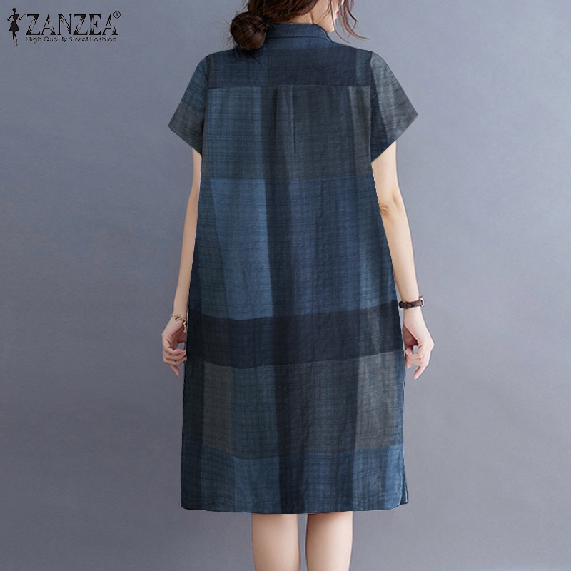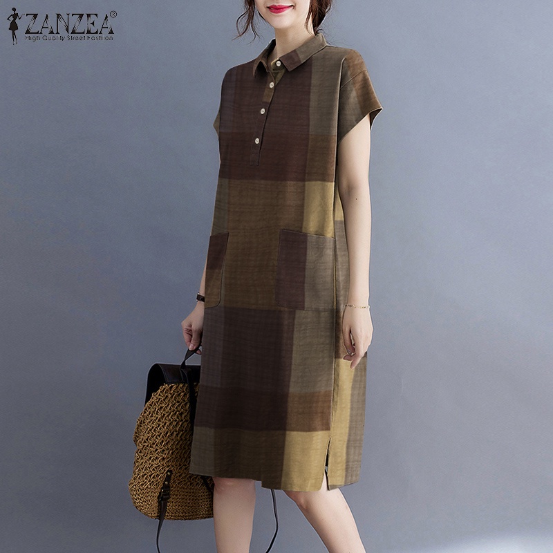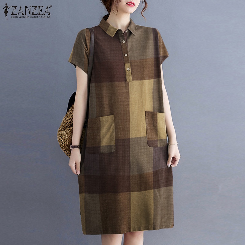 ZANZEA Women's Check Short Sleeve Turn-Down Collar Casual Loose Midi Dress
