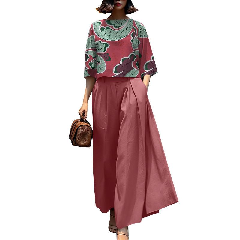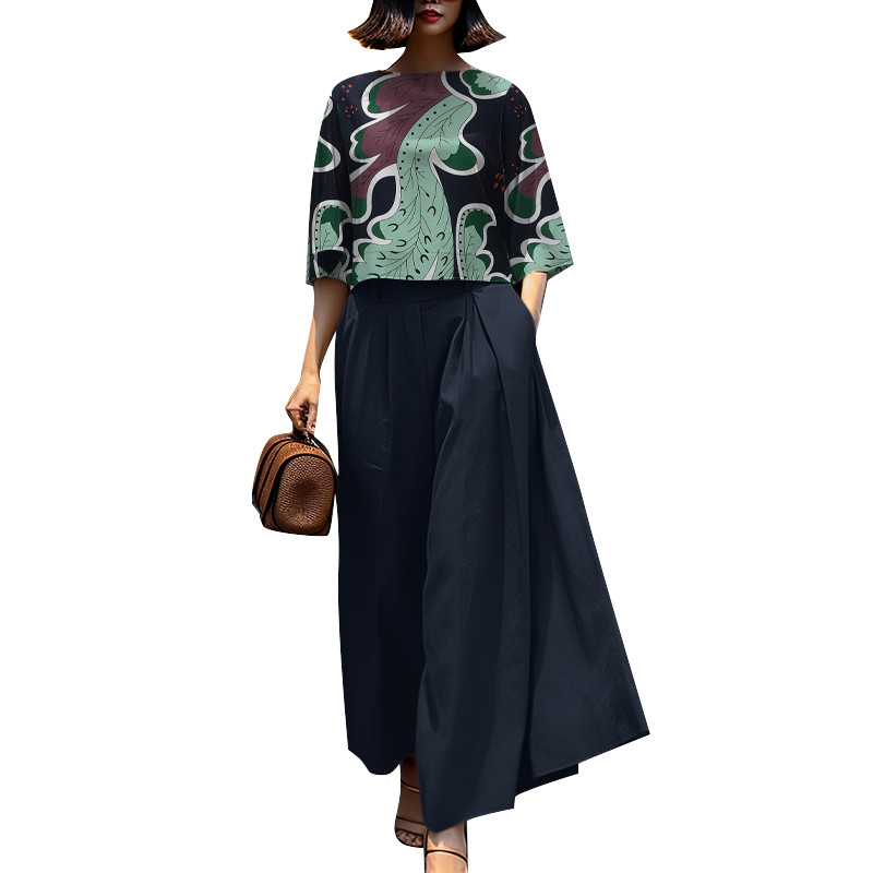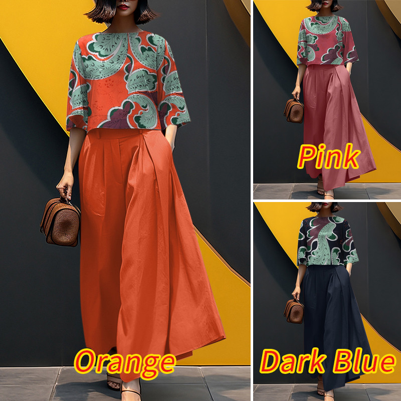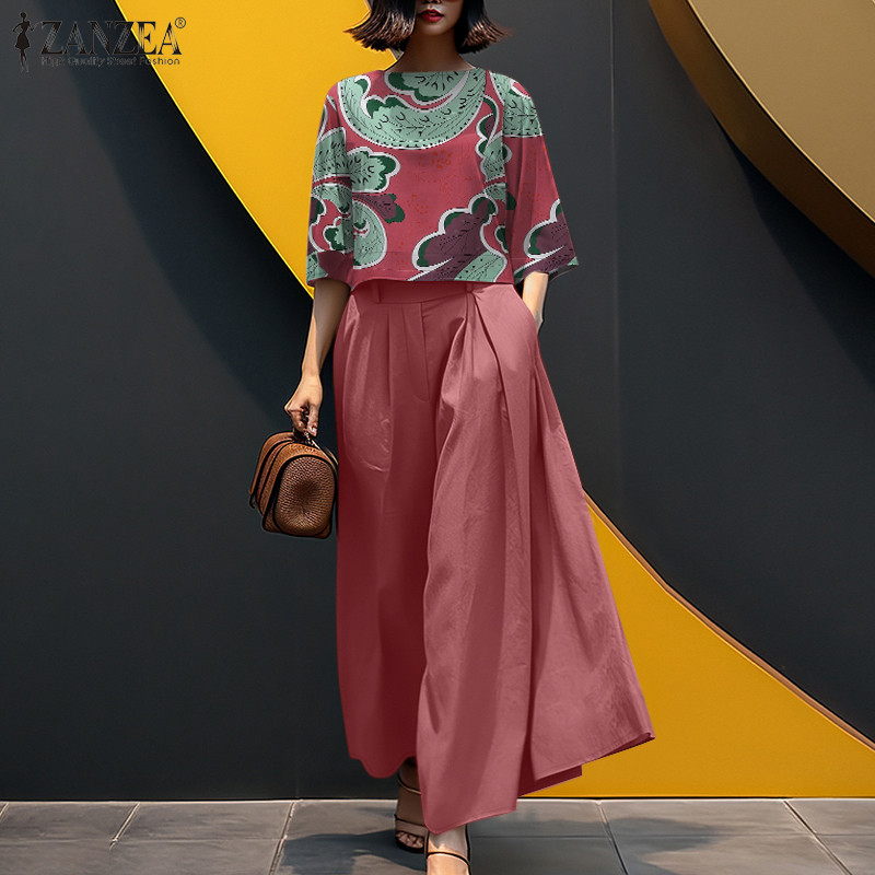 ZANZEA Women Korean Printed Flared Sleeves Pleated Pockets Wide Legs Two-Piece Outfits