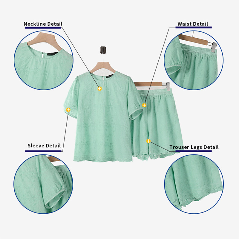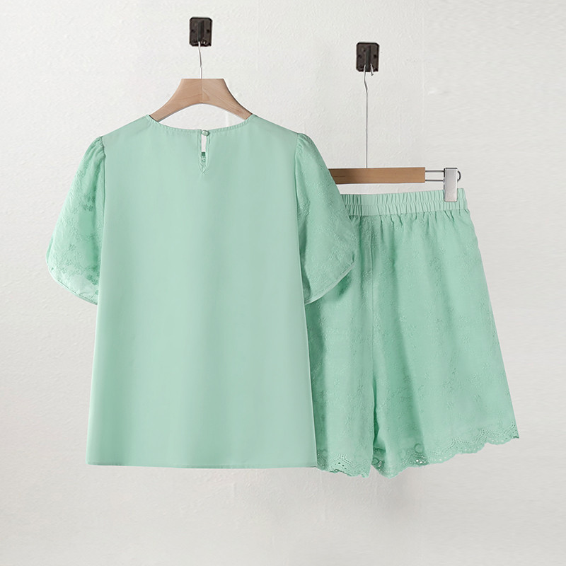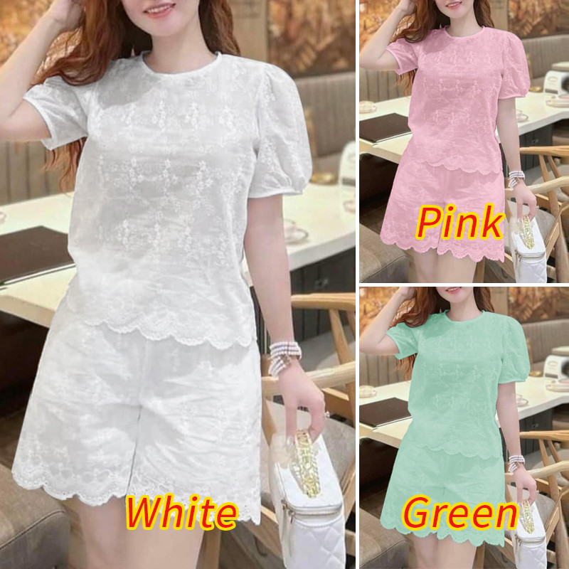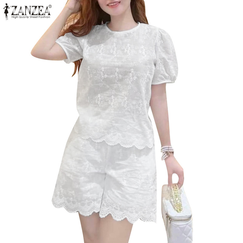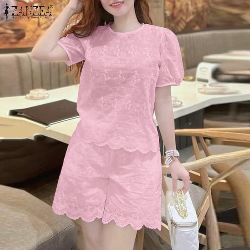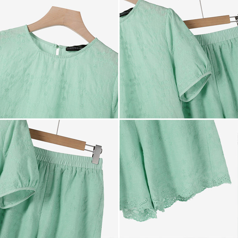 ZANZEA Women Korean Casual Short Sleeve Hollow Embroidery Blouse Summer Jacquard Set